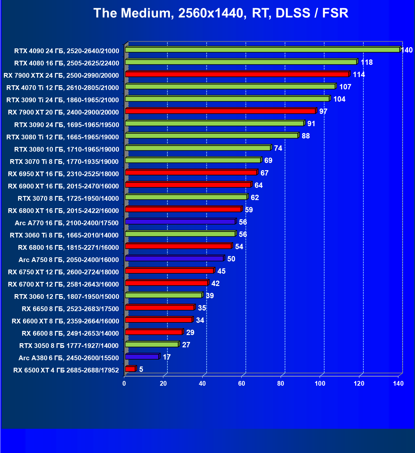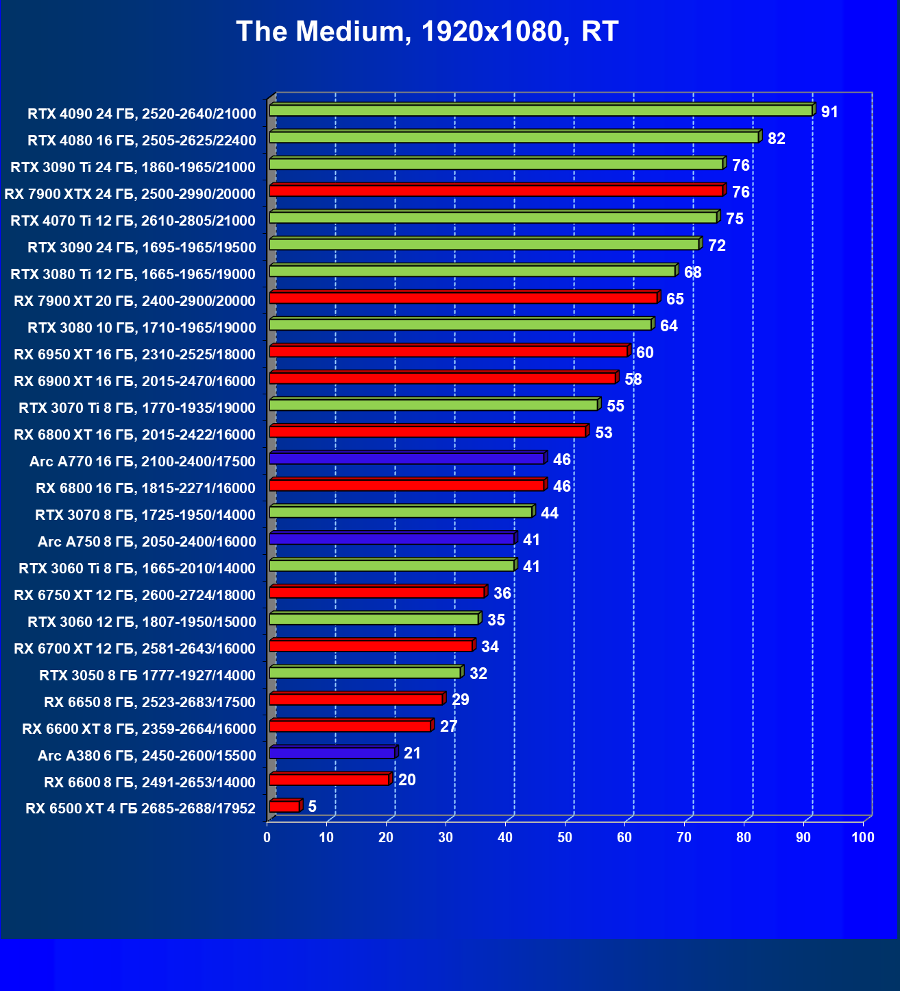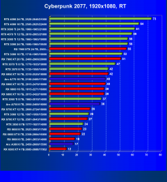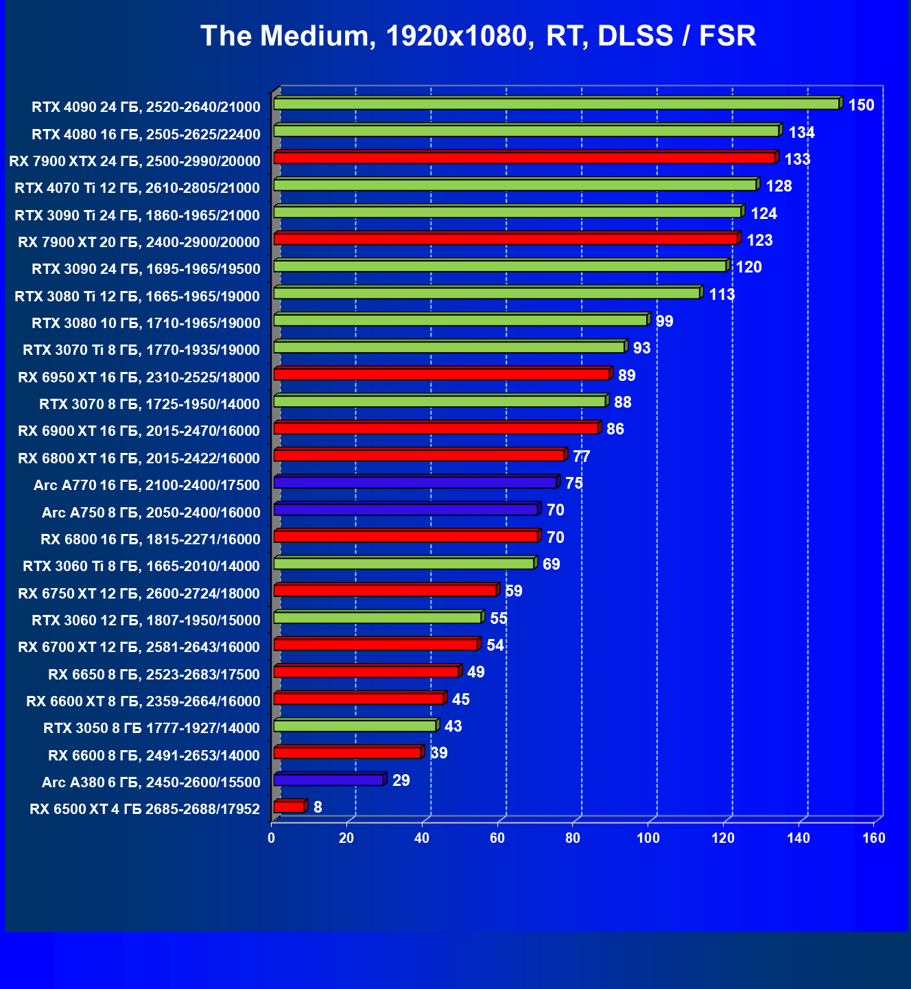 Рейтинг составлен по 9 тестам с применением технологии трассировки лучей (без Nvidia DLSS, AMD FSR и Intel XeSS). Этот рейтинг нормирован по самому слабому ускорителю в данной группе — Radeon RX 6500 XT (то есть сочетание скорости и функций Radeon RX 6500 XT приняты за 100%).