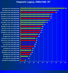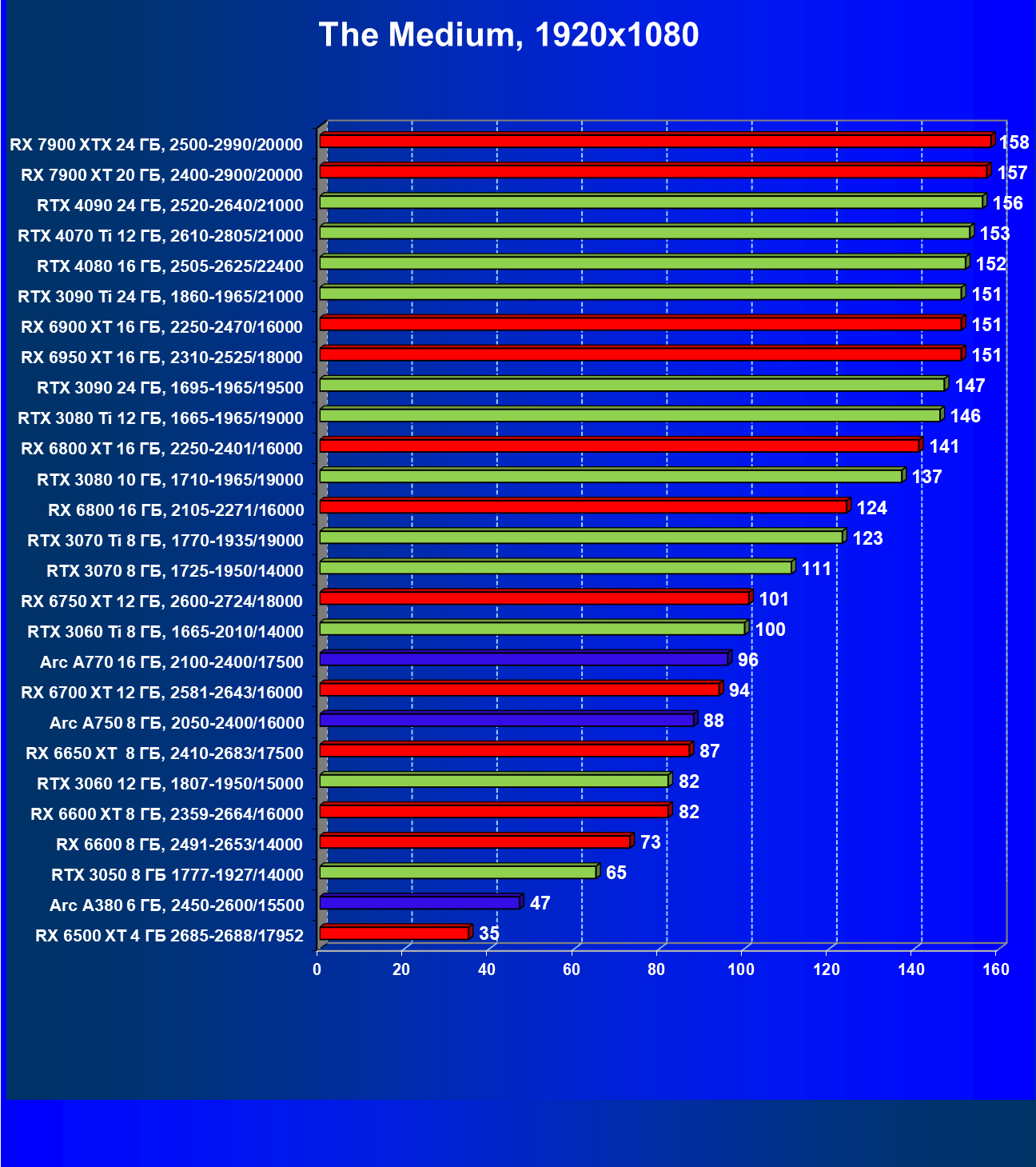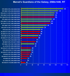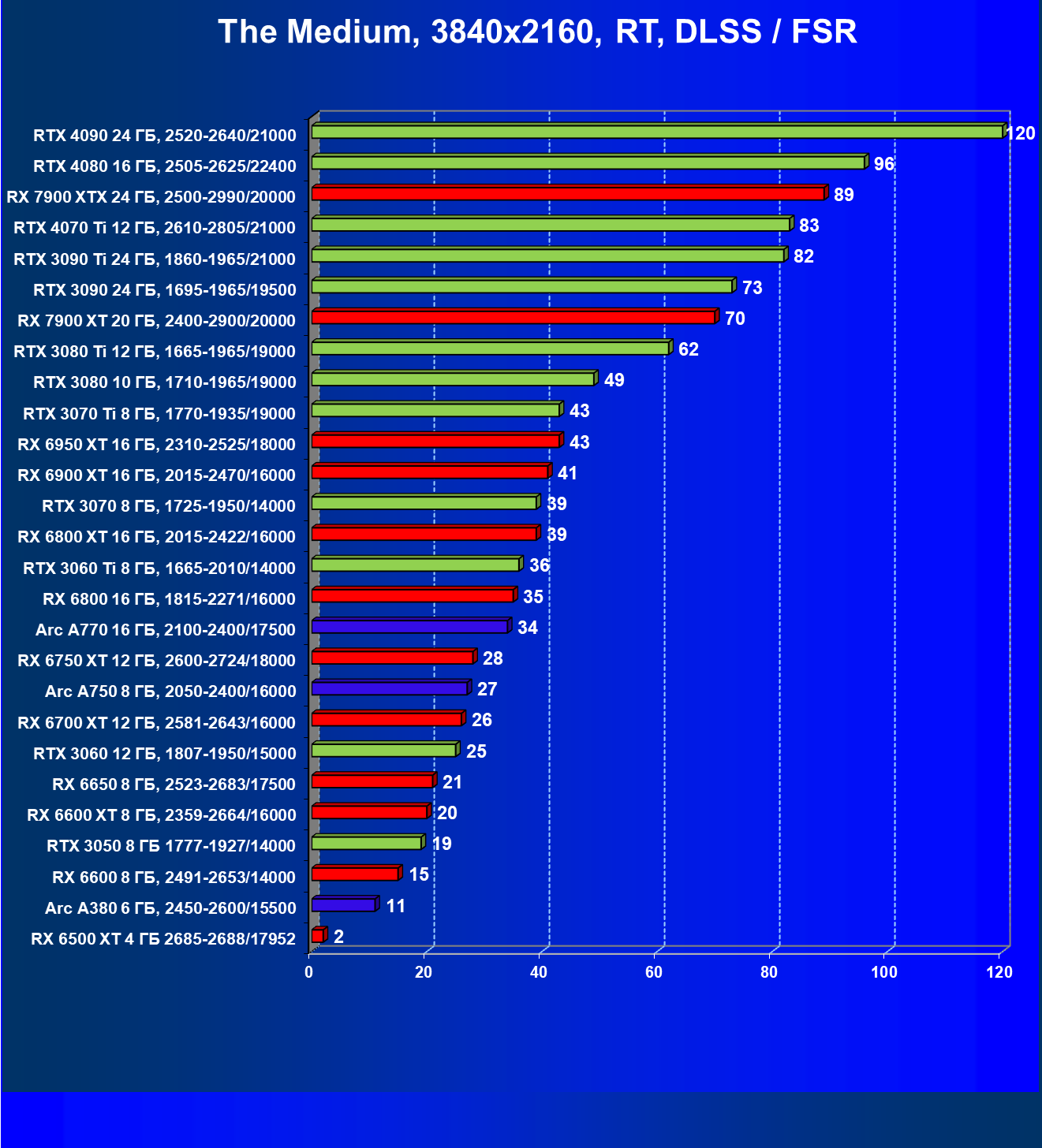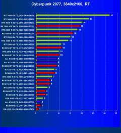 Рейтинг составлен по 9 тестам с применением технологии трассировки лучей (без Nvidia DLSS, AMD FSR и Intel XeSS). Этот рейтинг нормирован по самому слабому ускорителю в данной группе — Radeon RX 6500 XT (то есть сочетание скорости и функций Radeon RX 6500 XT приняты за 100%).