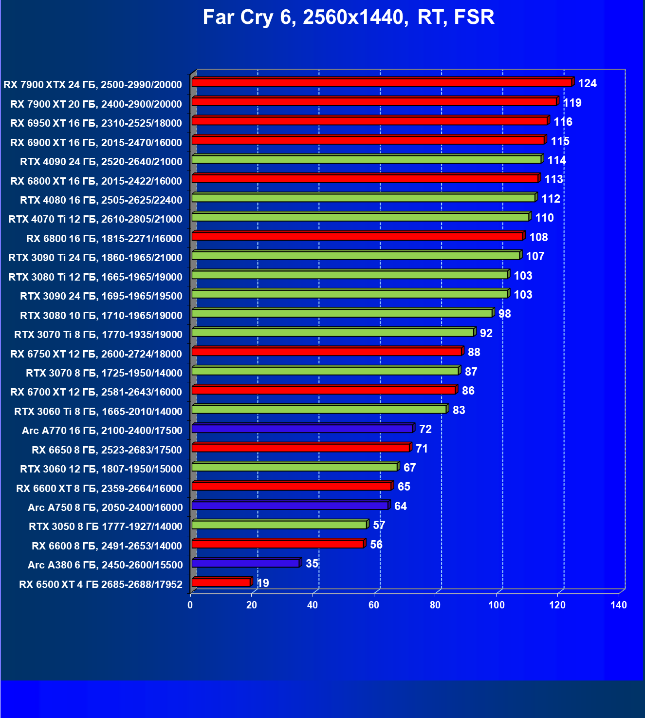 Видеокарта Arc A750 в целом отлично подходит для игры в разрешении Full HD с максимальным качеством графики, но при включении трассировки лучей потребуется использовать FSR/XeSS, а в некоторых играх без RT можно получить приемлемый комфорт и в разрешении 2.5K.