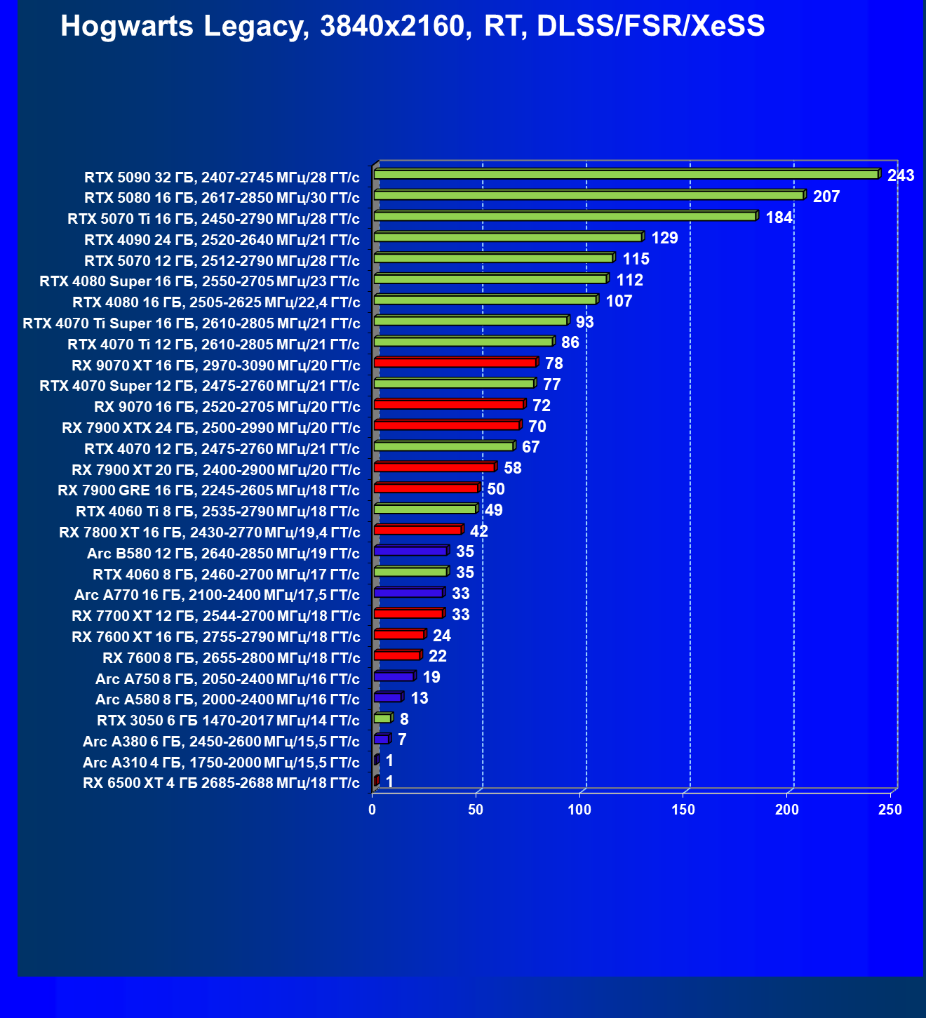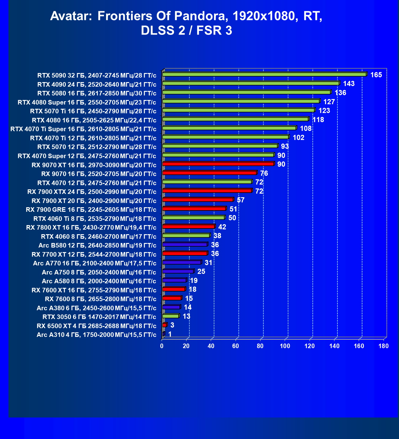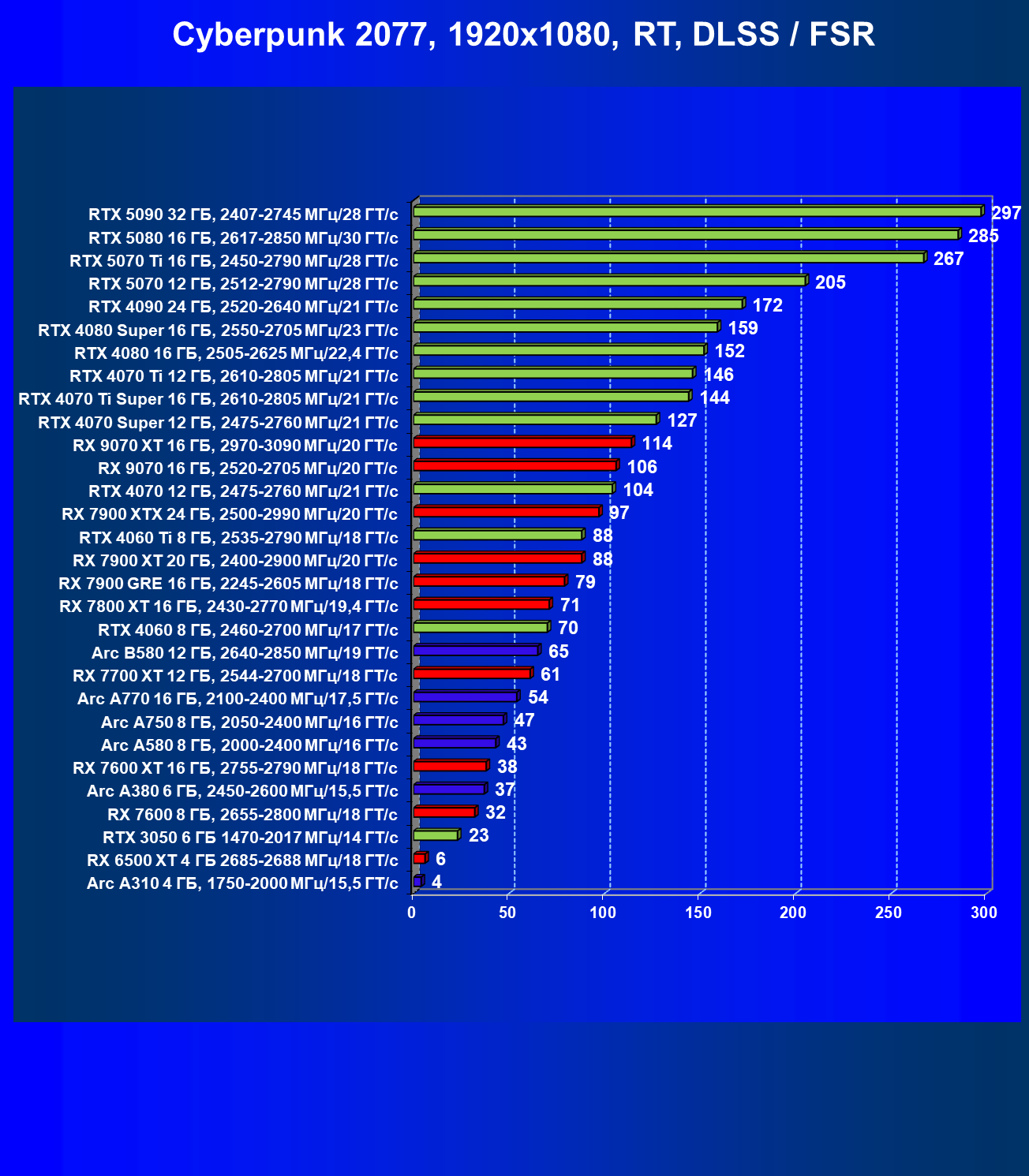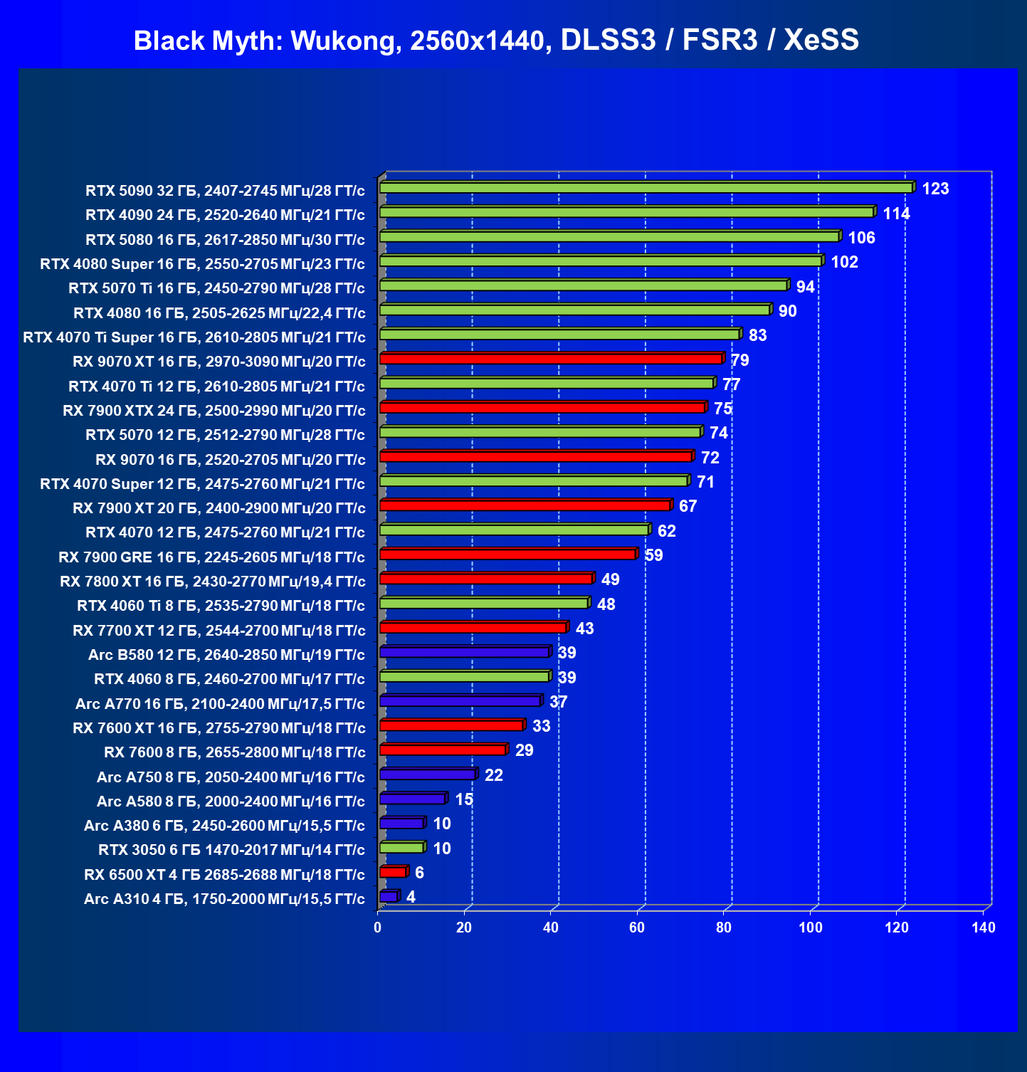 Все упомянутые видеокарты подойдут и для игр на мониторах с более массовым разрешением Full HD. При включении трассировки лучей совместно с DLSS, FSR или XeSS полный комфорт обеспечивают карты уровня Radeon RX 7700 XT, GeForce RTX 4060, Arc B580, а также Arc A770.