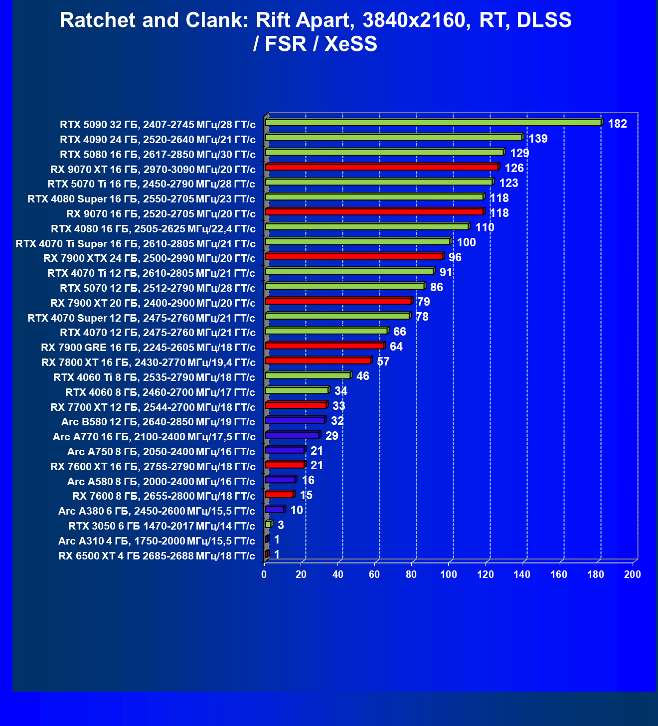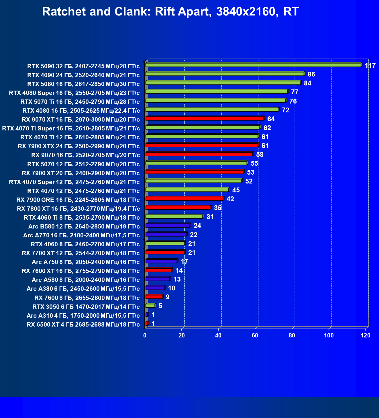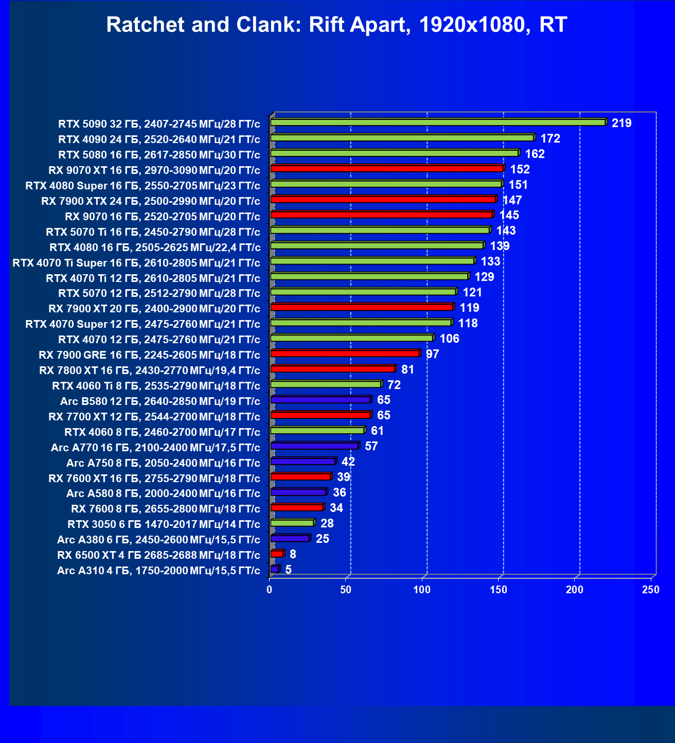 Карты уровня Radeon RX 7600, Arc A750 и ниже могут обеспечить приемлемый комфорт в играх при использовании RT только совместно с технологиями масштабирования (и только в ряде игр). А вот для Radeon RX 6500 XT, Arc A310 и GeForce RTX 3050 6 ГБ включение RT просто противопоказано.