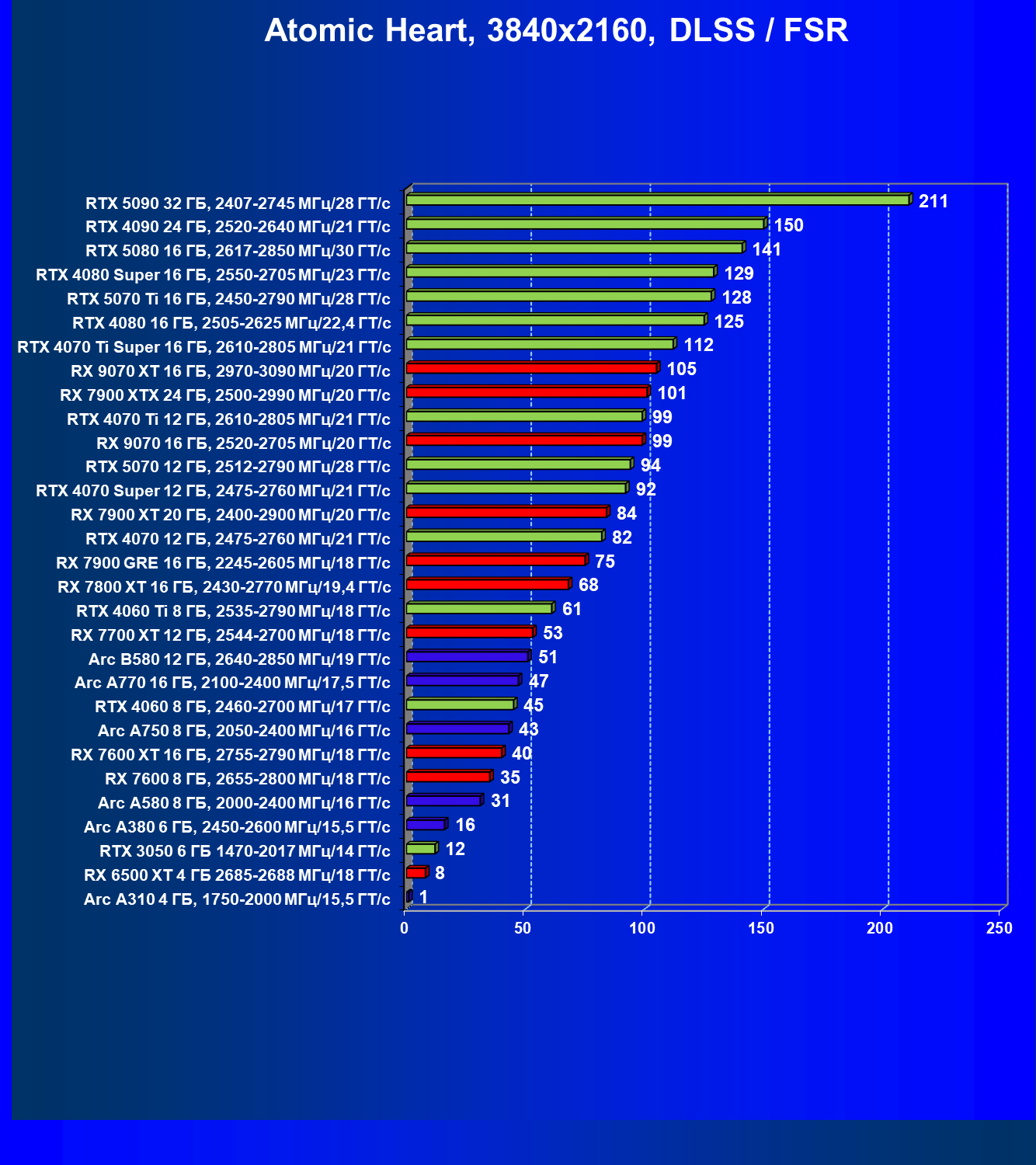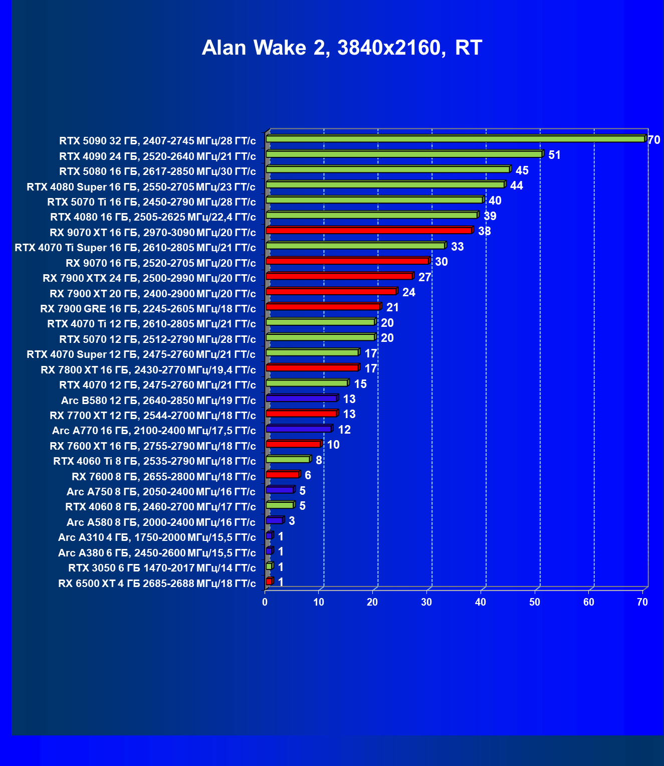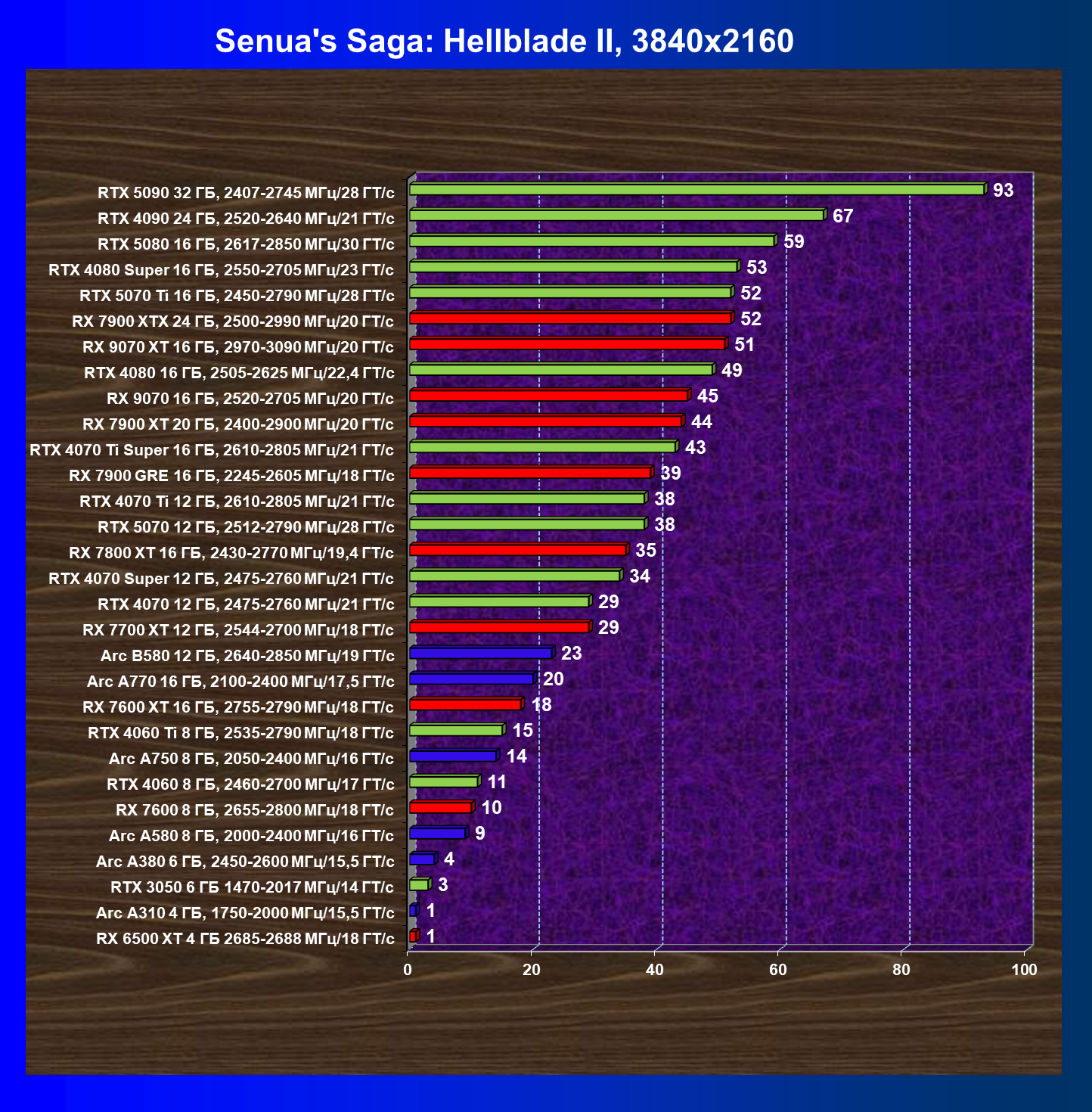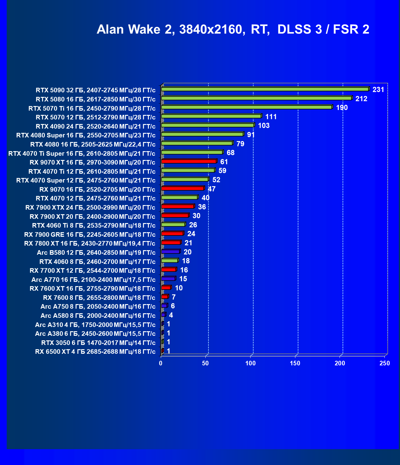 GeForce RTX 5090, GeForce RTX 5080, GeForce RTX 4090, GeForce RTX 4080 Super, GeForce RTX 4080, GeForce RTX 4070 Ti Super и Radeon RX 7900 XTX, в принципе, в каких-то играх осиливают даже разрешение 8K, но без оговорок — только GeForce RTX 5090, GeForce RTX 5080 и GeForce RTX 4090.