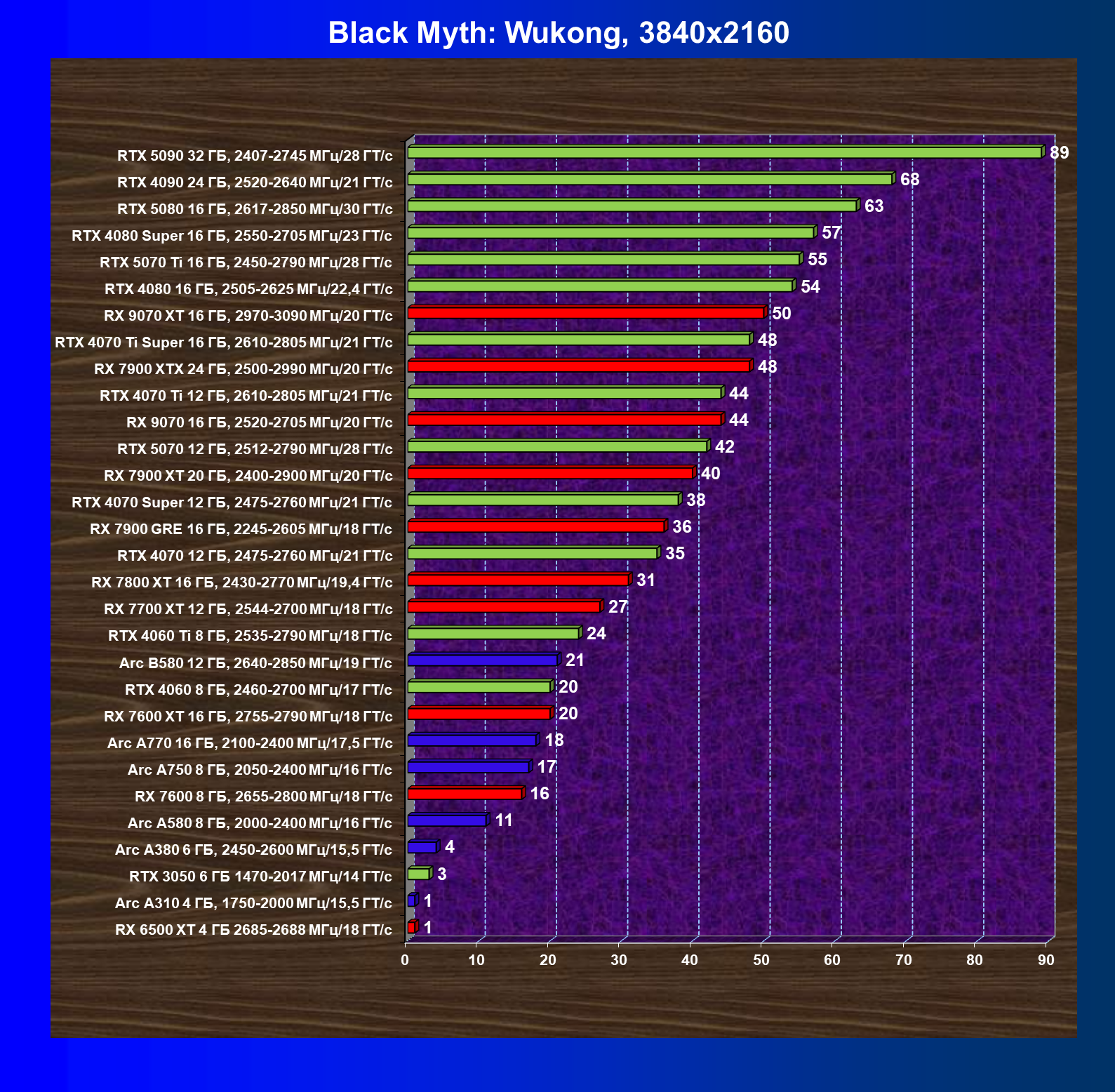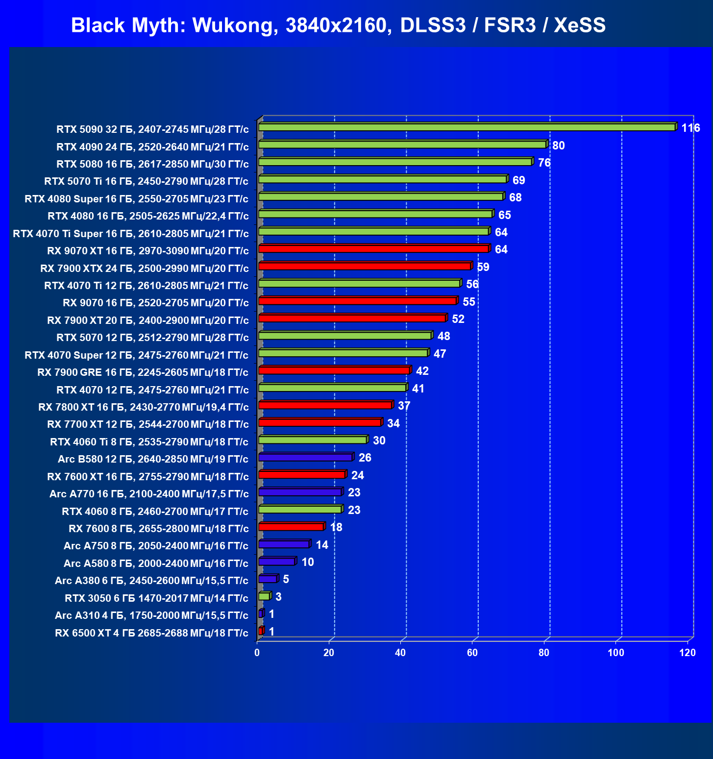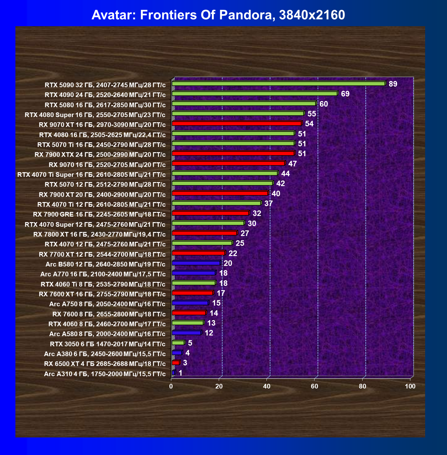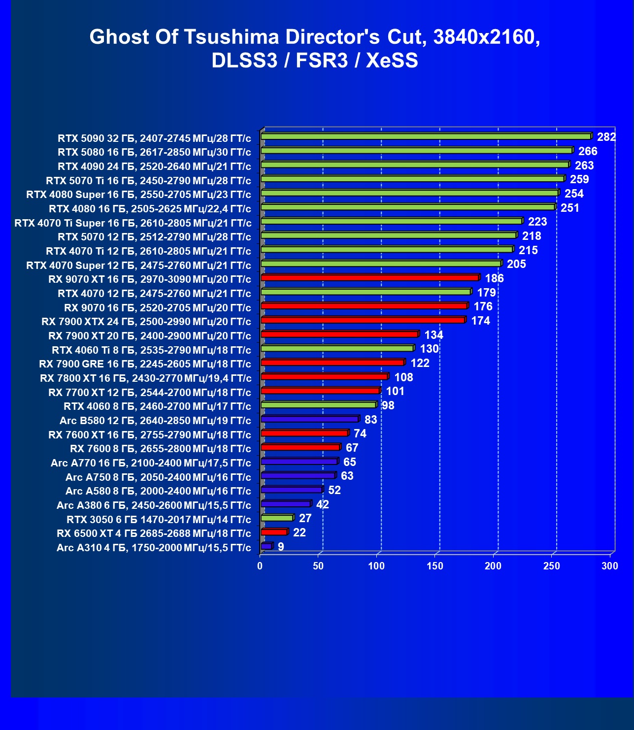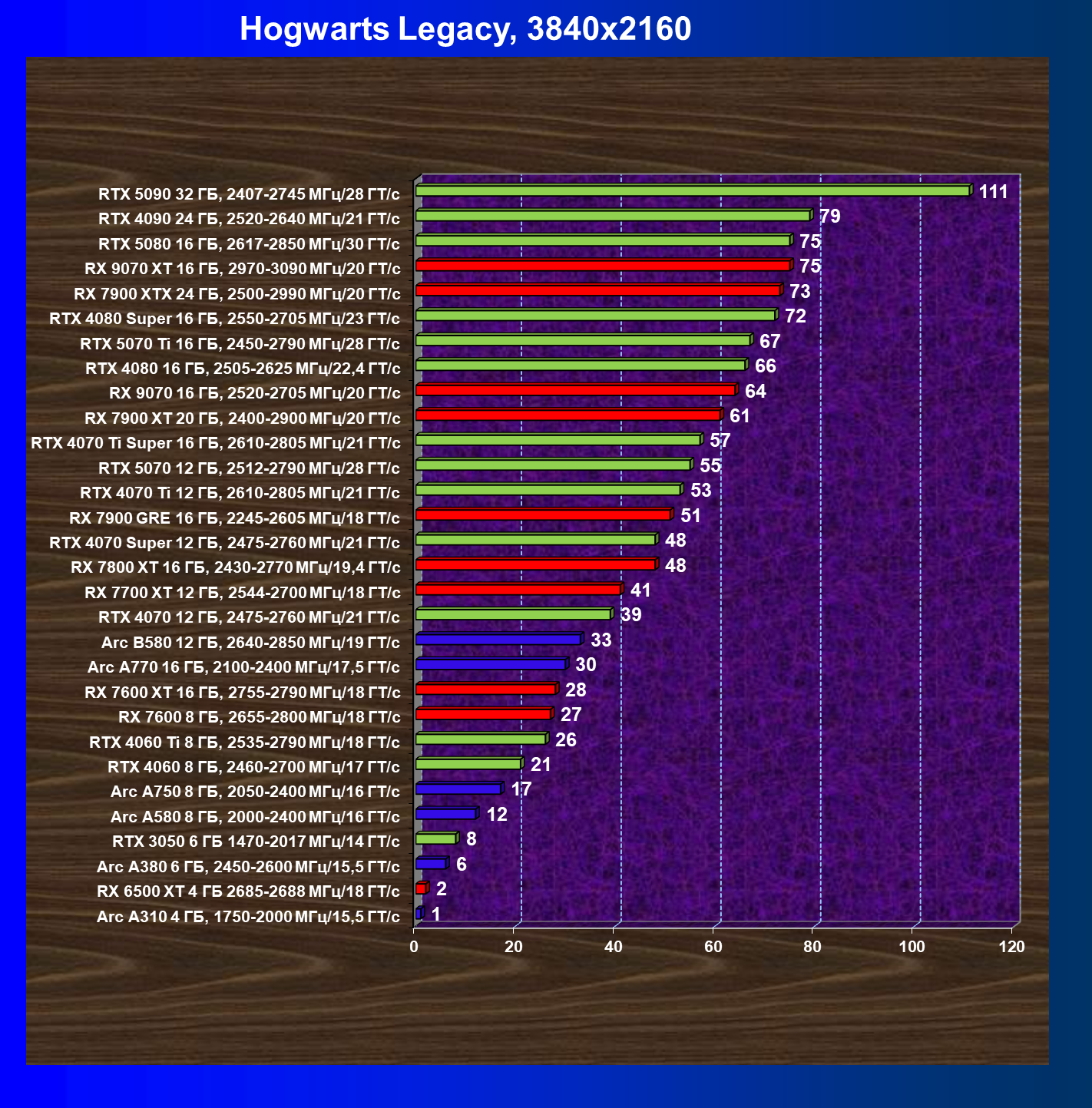 GeForce RTX 5090, GeForce RTX 5080, GeForce RTX 4090, GeForce RTX 4080 Super, GeForce RTX 4080, GeForce RTX 4070 Ti Super и Radeon RX 7900 XTX, в принципе, в каких-то играх осиливают даже разрешение 8K, но без оговорок — только GeForce RTX 5090, GeForce RTX 5080 и GeForce RTX 4090.