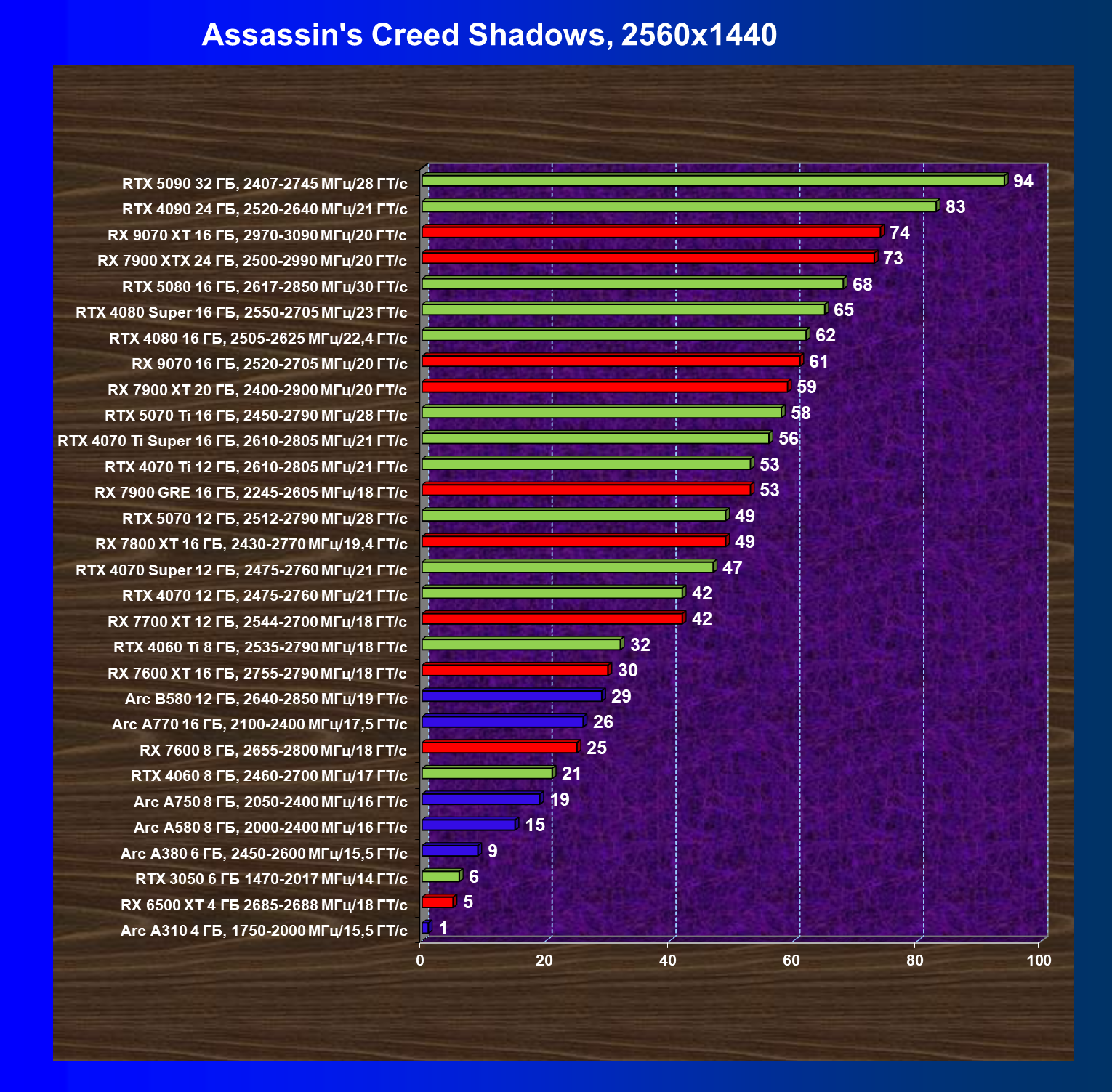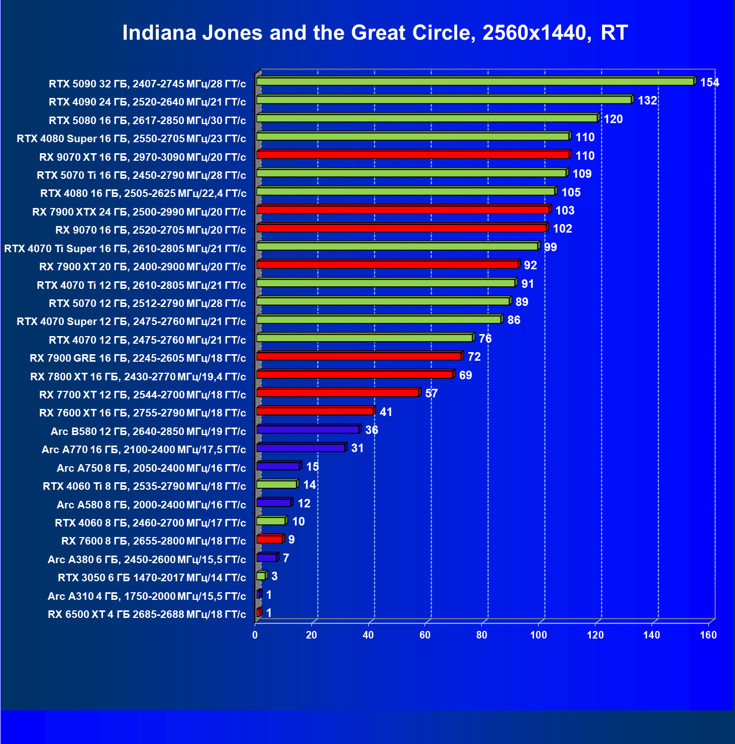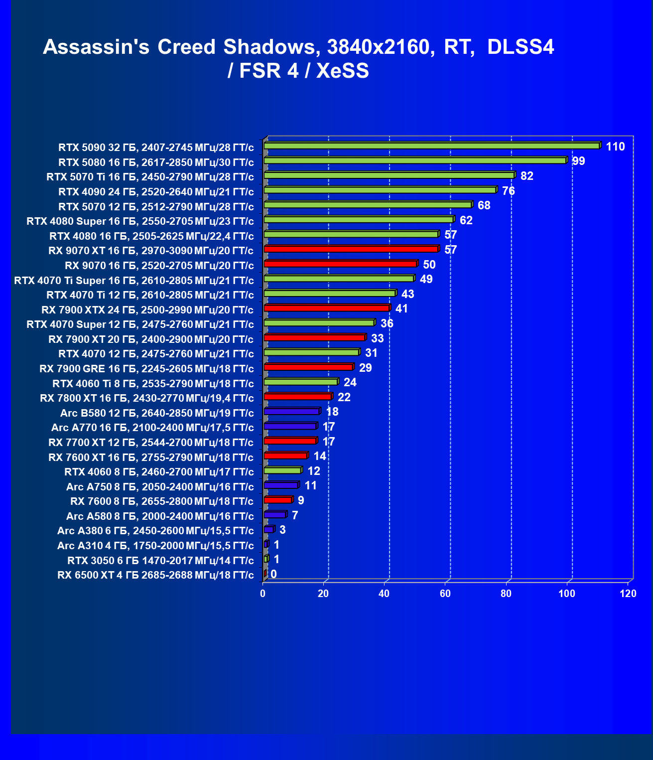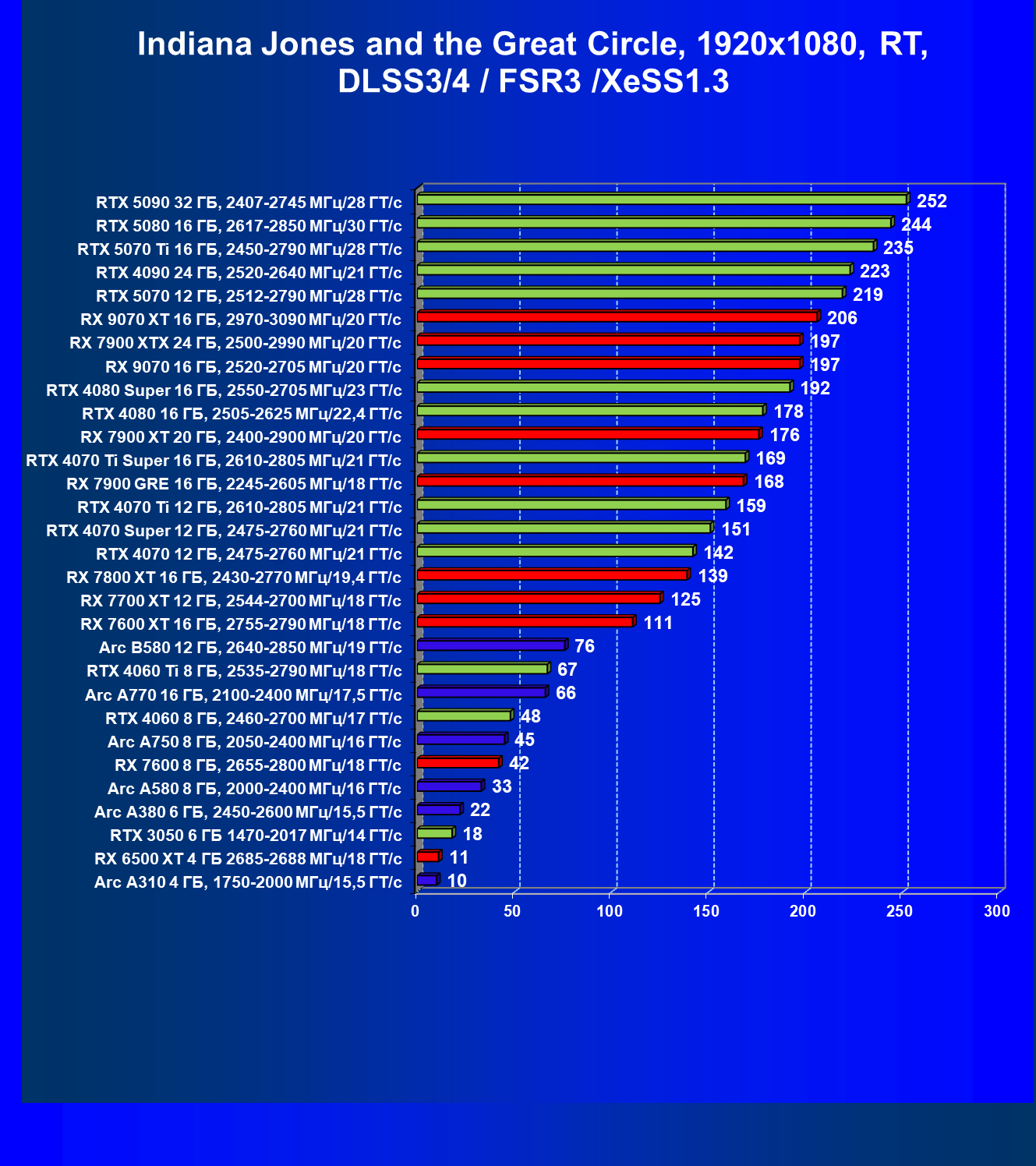 В наборе тестовых игр произошли изменения: добавились результаты из игр Indiana Jones and the Great Circle (тестирование без трассировки лучей невозможно, поэтому только с RT и DLSS/FSR/XeSS) и Assassin’s Creed Shadow («классические» тесты, а также тесты с трассировкой лучей и динамическим масштабированием).