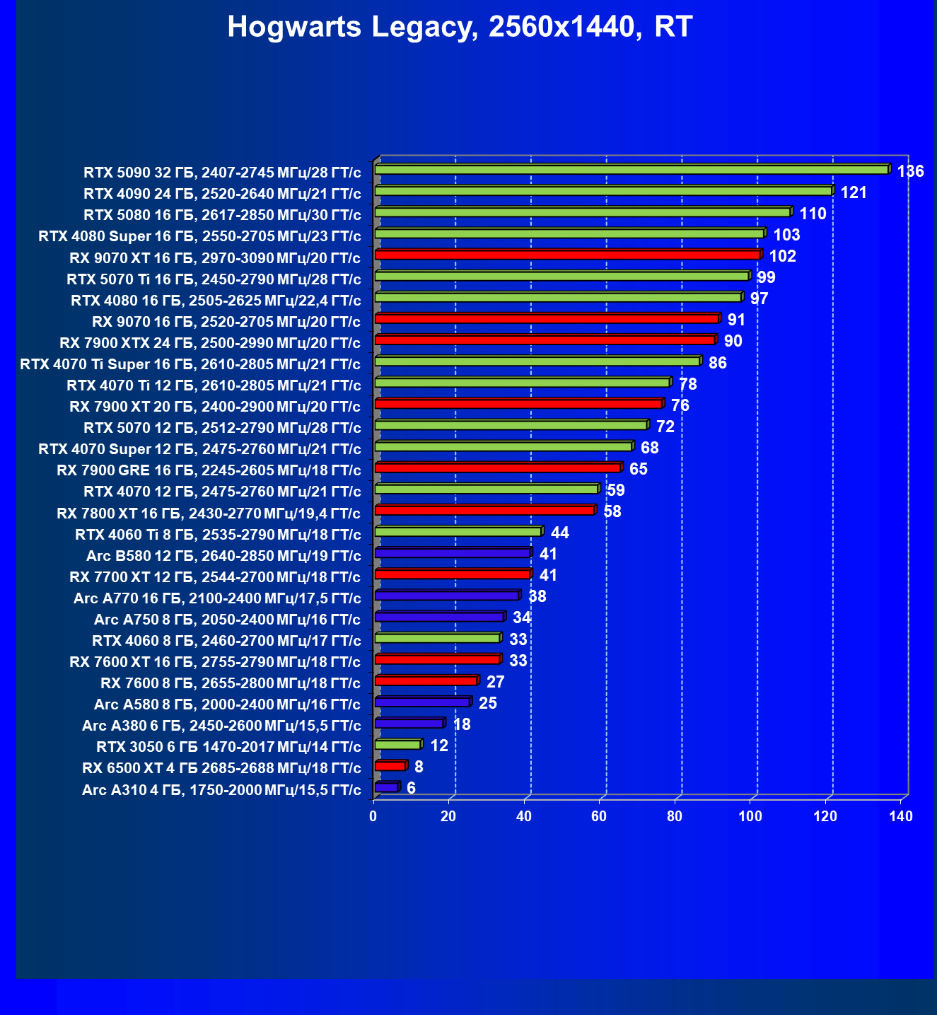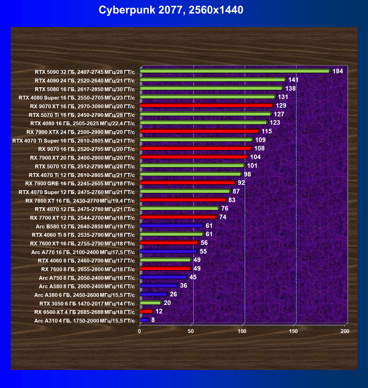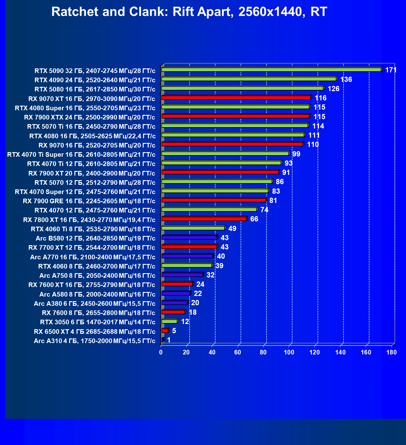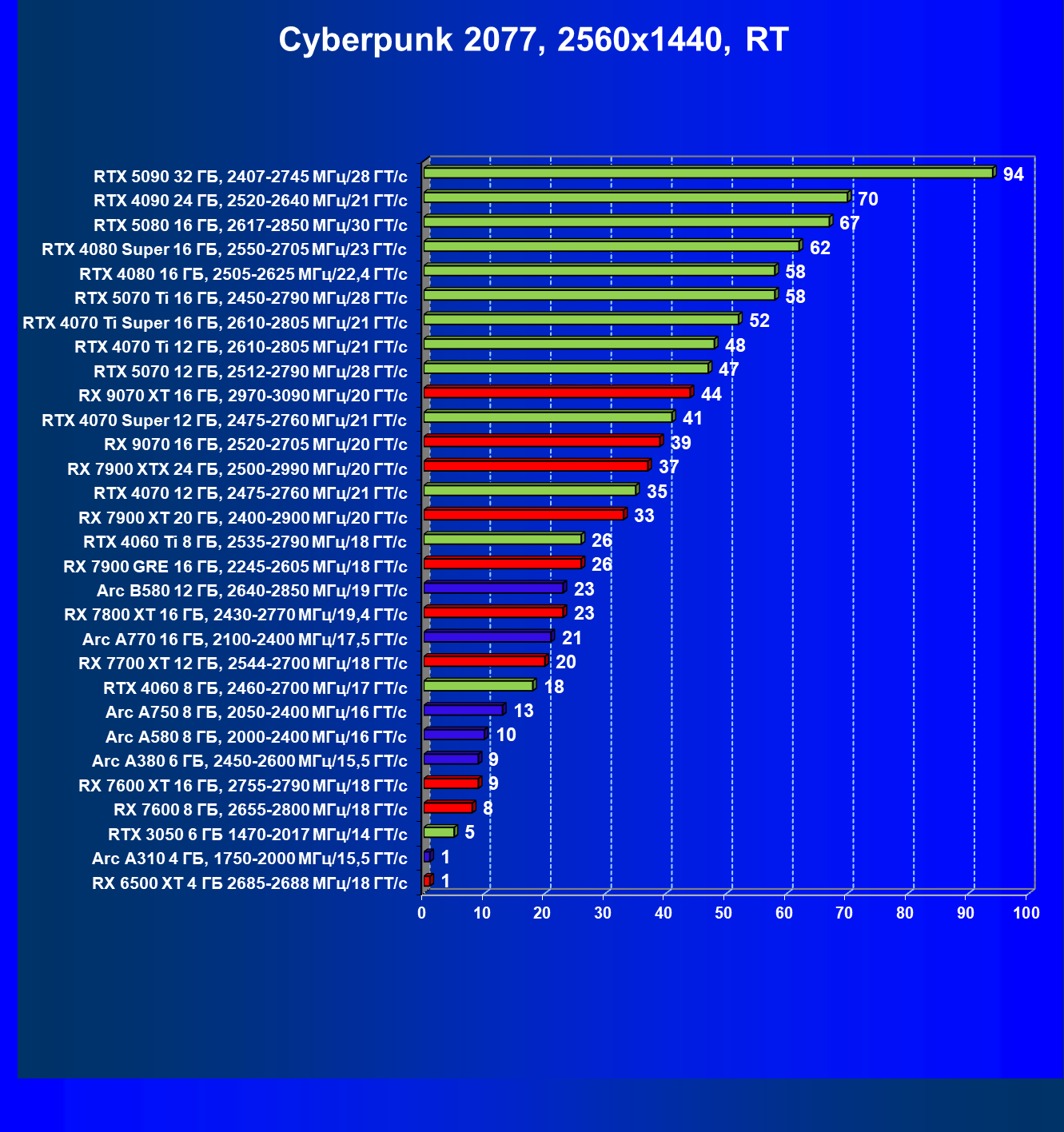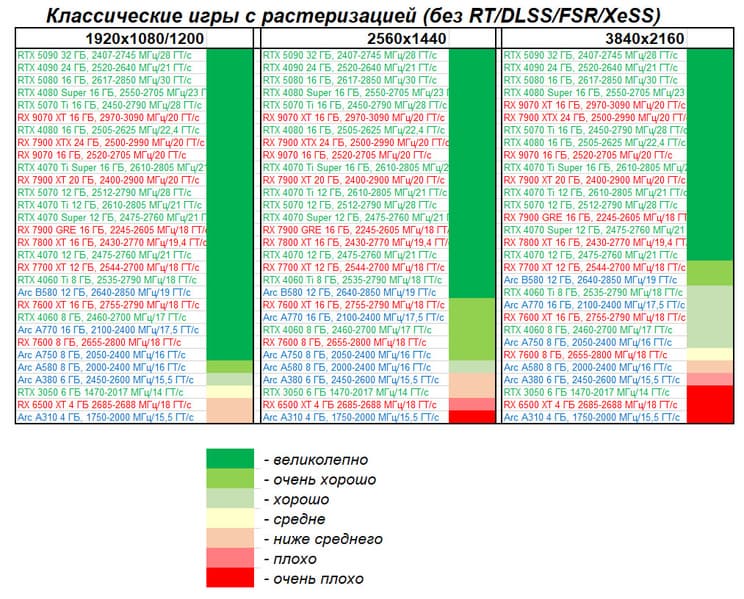 В рейтинге полезности для разрешения 2560×1440 в классических играх без RT лидером является ускоритель Arc A750 8 ГБ из-за достаточного объема памяти для такого разрешения и оптимальной цены. А вот в играх с RT и технологиями масштабирования самым выгодным является GeForce RTX 5070.