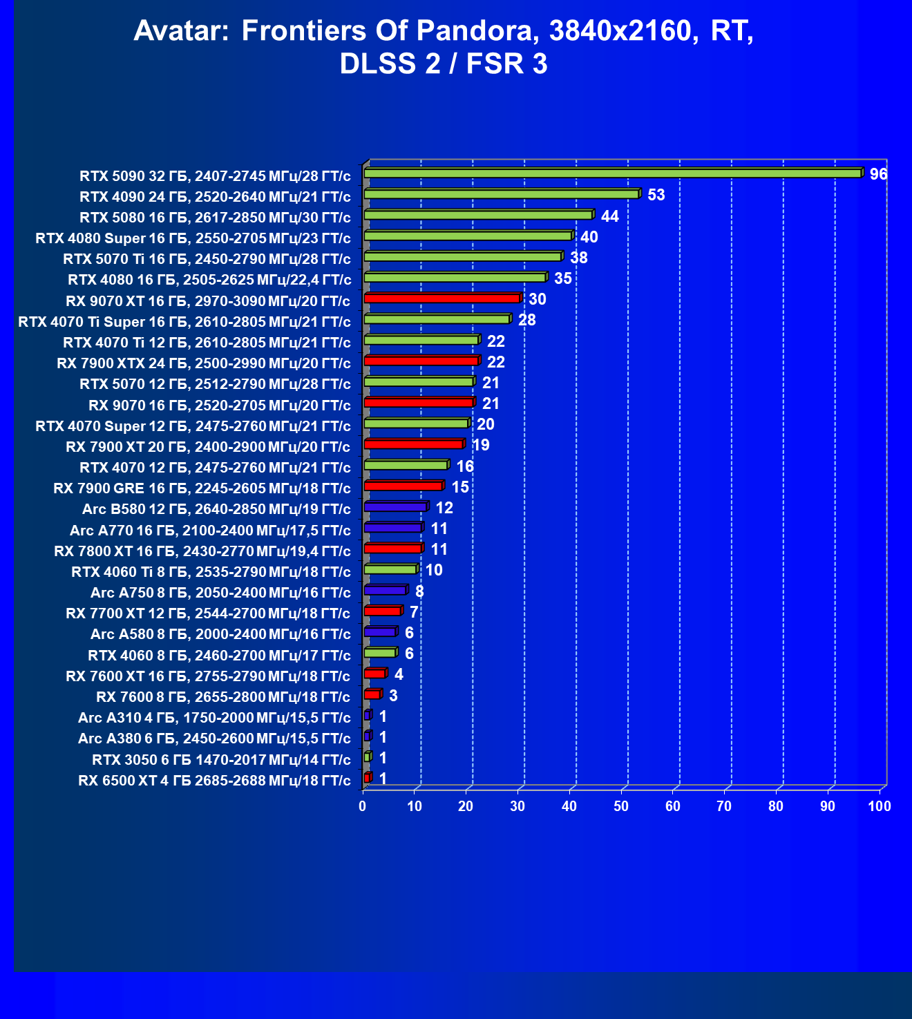 Intel Arc A750 (8 ГБ) занимает первое место в нашем рейтинге полезности в играх без трассировки лучей, однако в играх с RT (при задействовании технологий динамического масштабирования) абсолютный лидер на этот раз — Nvidia GeForce RTX 5070. С учетом перспективности и более масштабной поддержки динамического масштабирования в играх, мы отдали пальму первенства продукту из стана Nvidia, но надо учитывать кратную разницу в стоимости Arc A750 и GeForce RTX 5070 — для кого-то выбор будет иным.