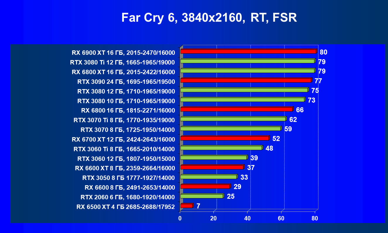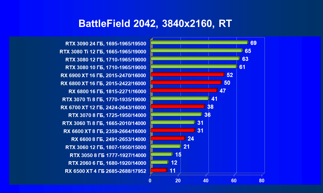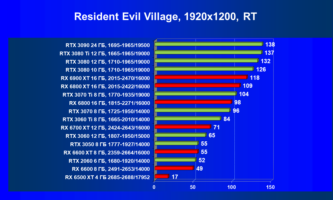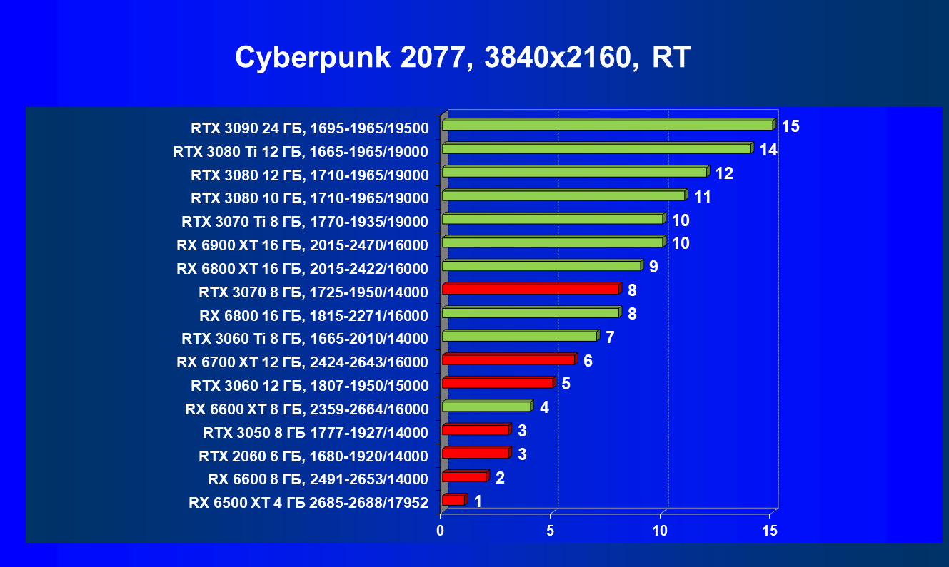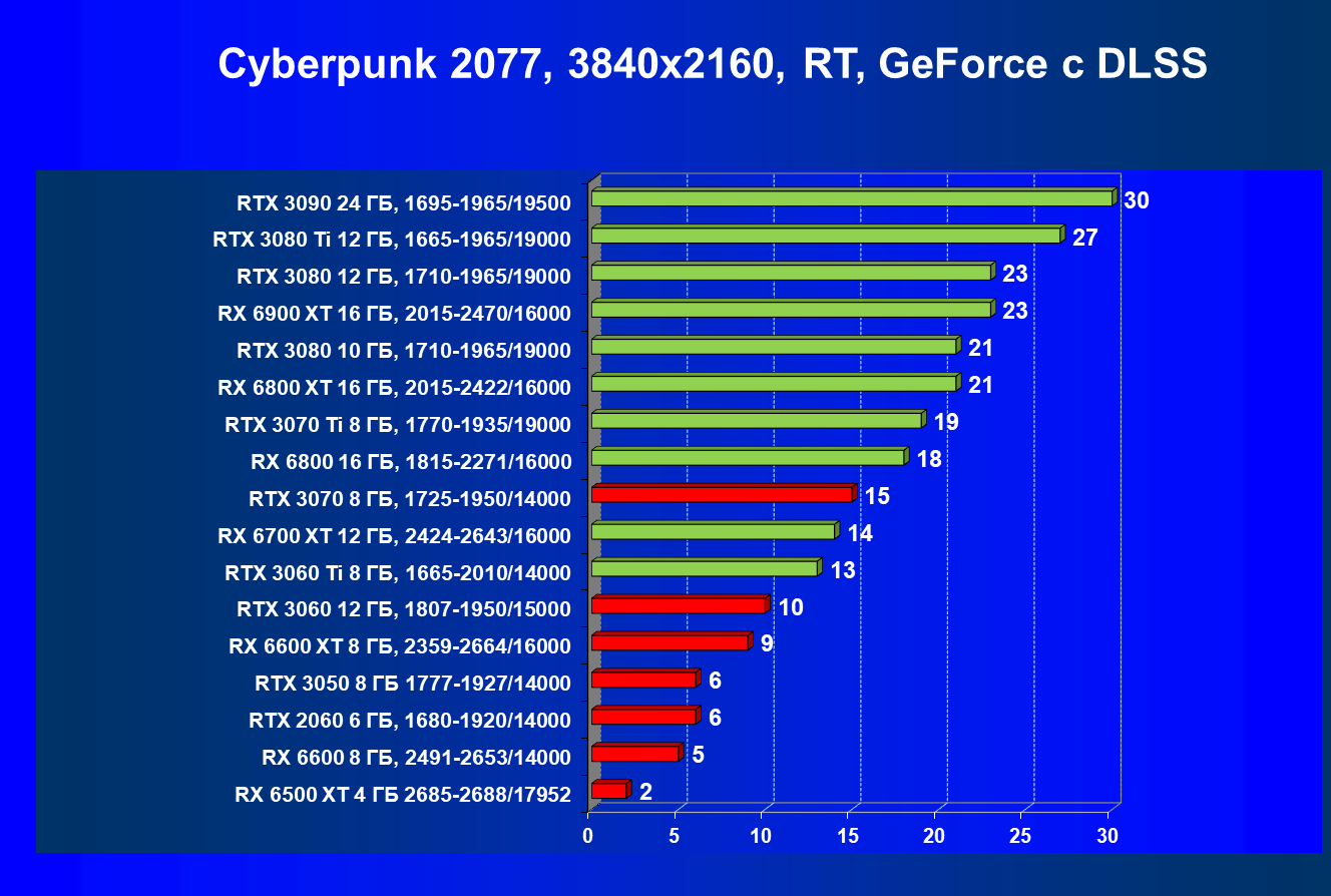 Лучшие ускорители для разрешения 4К (при максимальном качестве графики) — GeForce RTX 3090, GeForce RTX 3080 Ti, GeForce RTX 3080, Radeon RX 6900 XT, Radeon RX 6800 XT. Они обеспечивают высокий уровень комфорта во всех играх без использования трассировки лучей. При включении RT ускорители Radeon RX 6000 для 4К смотрятся гораздо бледнее, скорее в их случае можно рассчитывать лишь на 2.5К. В принципе, для 4К еще вполне подойдут GeForce RTX 3070 Ti, GeForce RTX 3070 и Radeon RX 6800, но не во всех играх можно будет получить полный комфорт при максимальных настройках графики даже без RT.