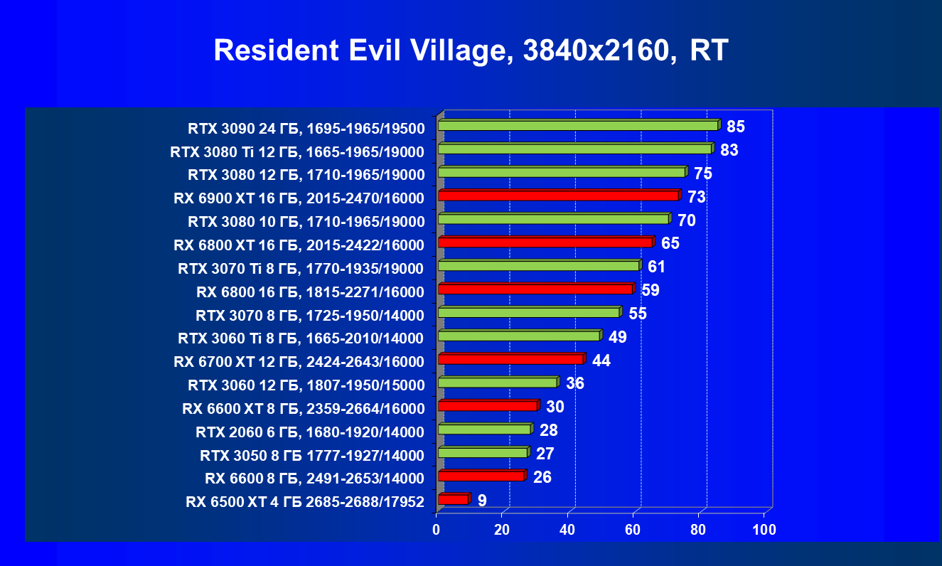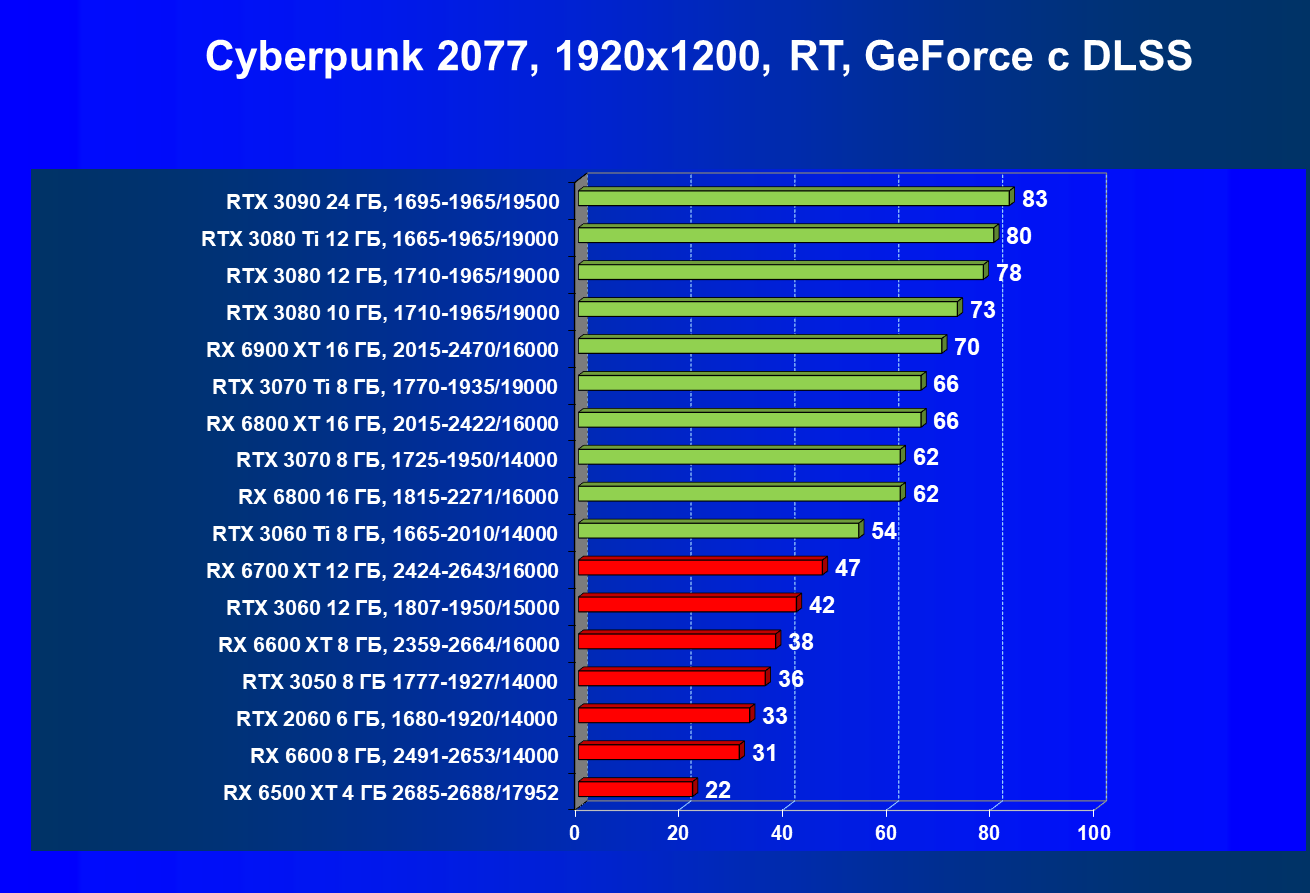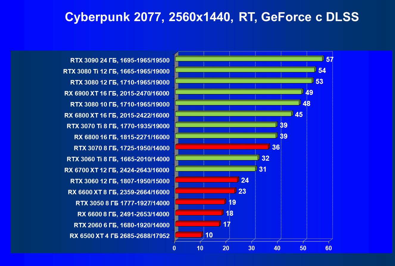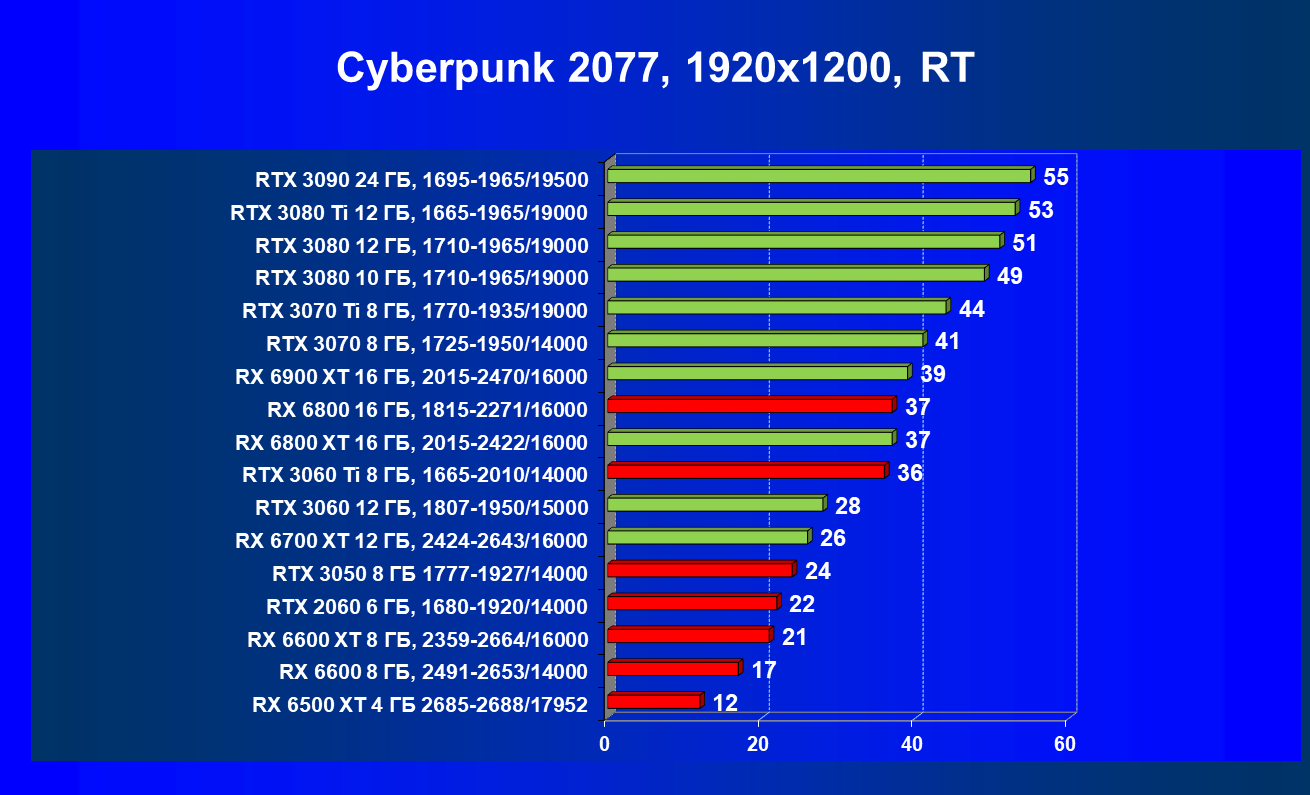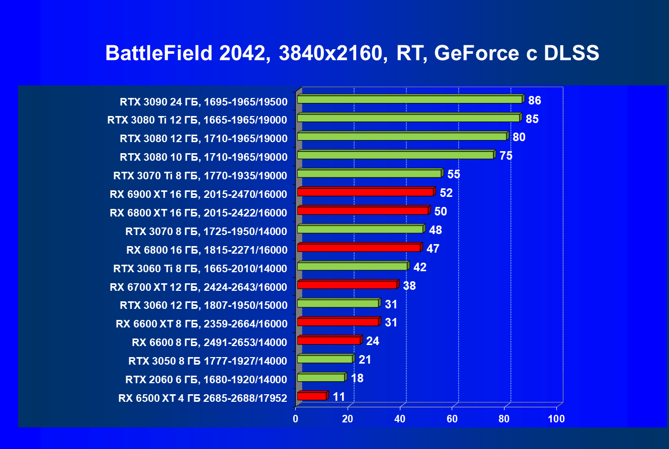 Лучшие ускорители для разрешения 4К (при максимальном качестве графики) — GeForce RTX 3090, GeForce RTX 3080 Ti, GeForce RTX 3080, Radeon RX 6900 XT, Radeon RX 6800 XT. Они обеспечивают высокий уровень комфорта во всех играх без использования трассировки лучей. При включении RT ускорители Radeon RX 6000 для 4К смотрятся гораздо бледнее, скорее в их случае можно рассчитывать лишь на 2.5К. В принципе, для 4К еще вполне подойдут GeForce RTX 3070 Ti, GeForce RTX 3070 и Radeon RX 6800, но не во всех играх можно будет получить полный комфорт при максимальных настройках графики даже без RT.