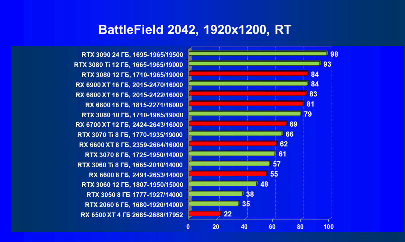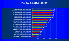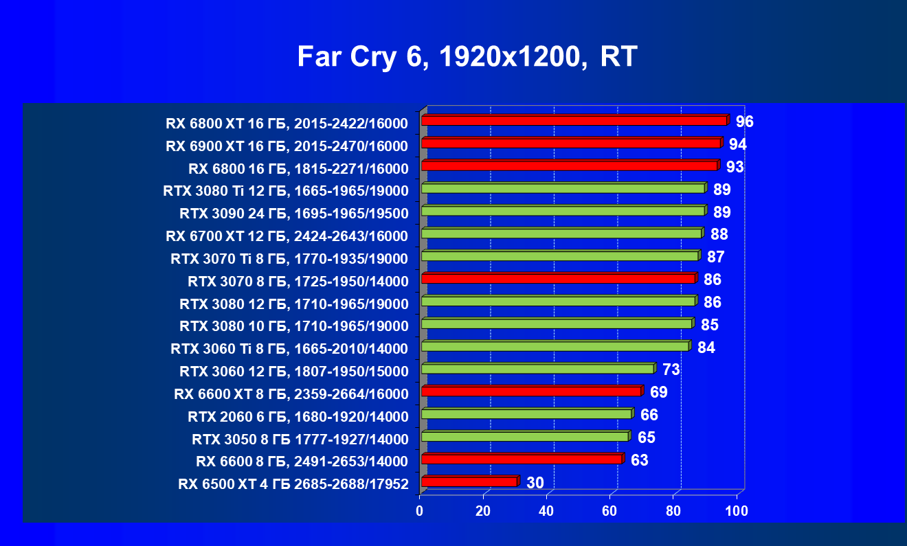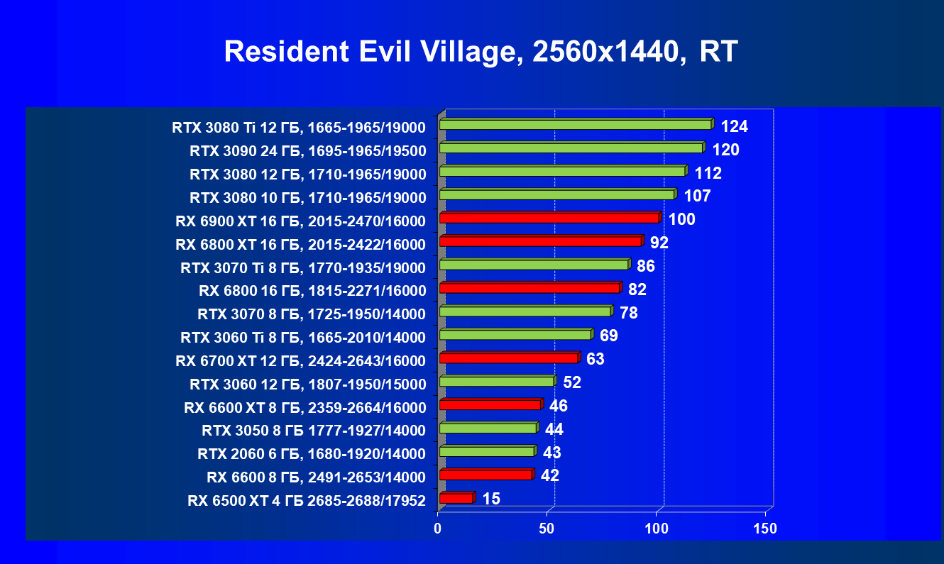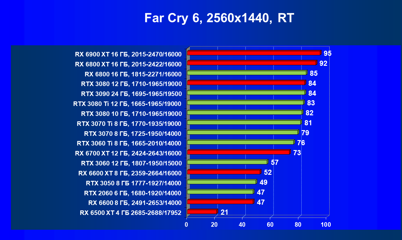 Лучшие ускорители для разрешения 4К (при максимальном качестве графики) — GeForce RTX 3090, GeForce RTX 3080 Ti, GeForce RTX 3080, Radeon RX 6900 XT, Radeon RX 6800 XT. Они обеспечивают высокий уровень комфорта во всех играх без использования трассировки лучей. При включении RT ускорители Radeon RX 6000 для 4К смотрятся гораздо бледнее, скорее в их случае можно рассчитывать лишь на 2.5К. В принципе, для 4К еще вполне подойдут GeForce RTX 3070 Ti, GeForce RTX 3070 и Radeon RX 6800, но не во всех играх можно будет получить полный комфорт при максимальных настройках графики даже без RT.