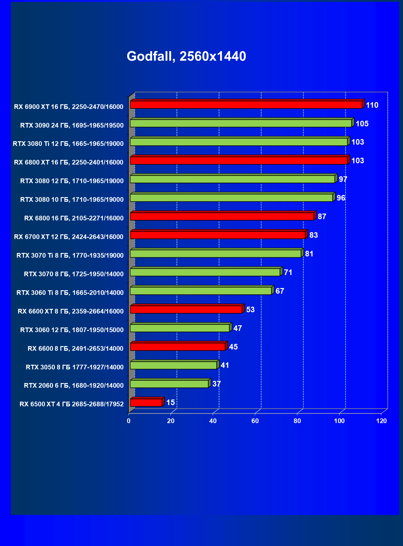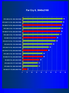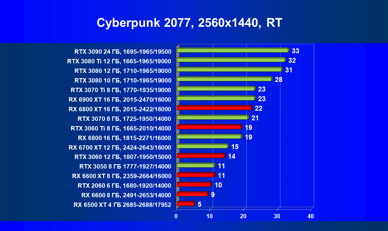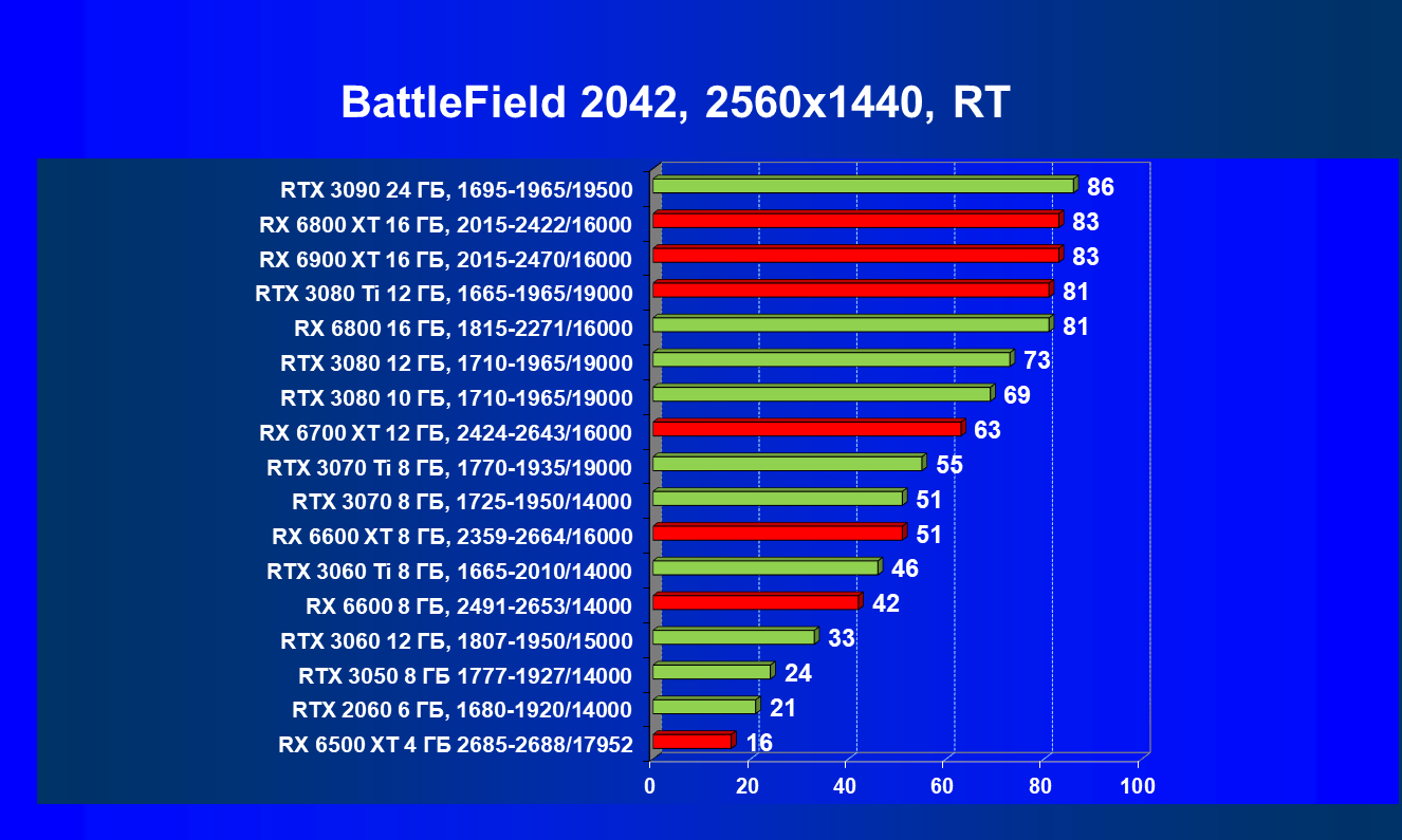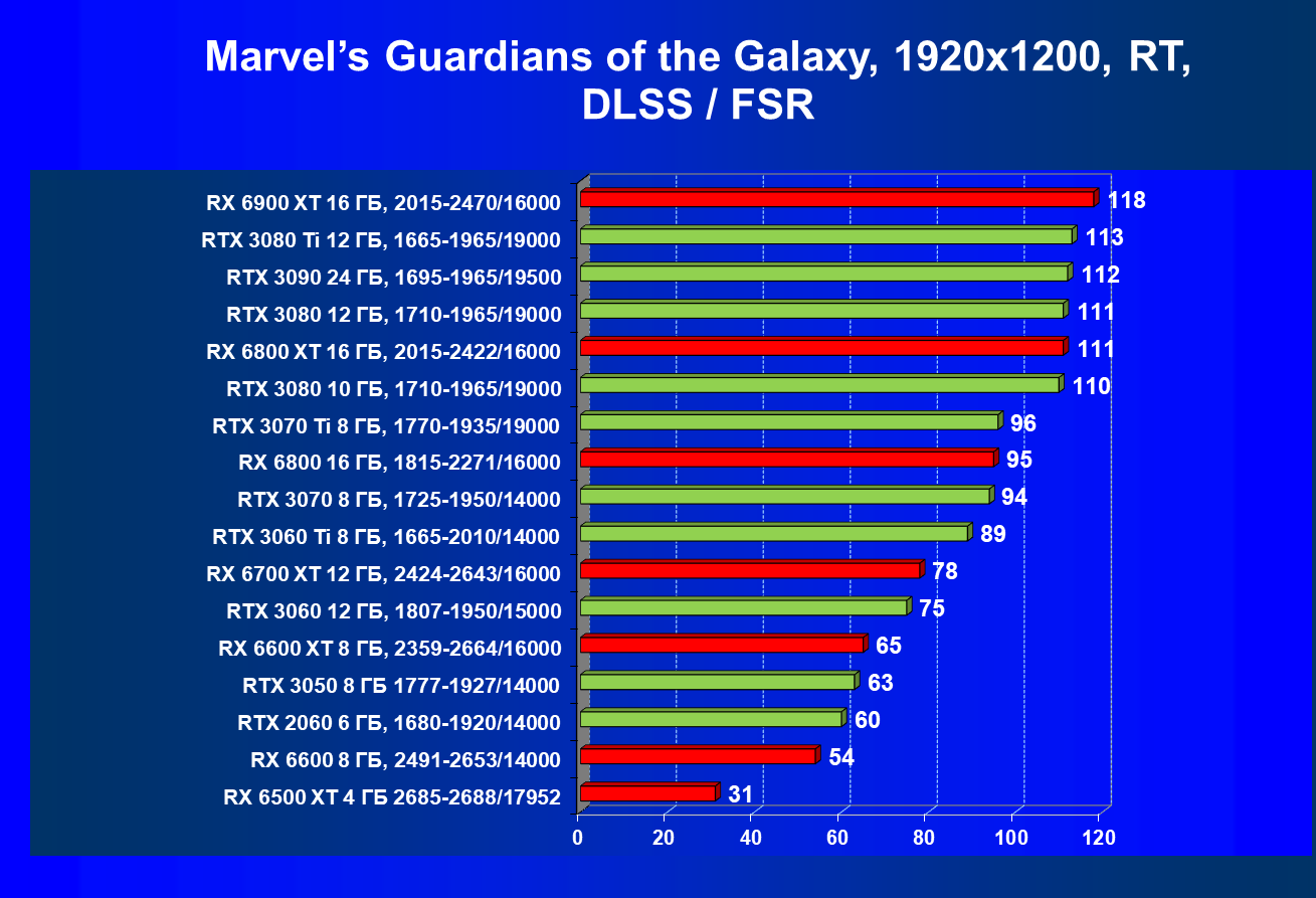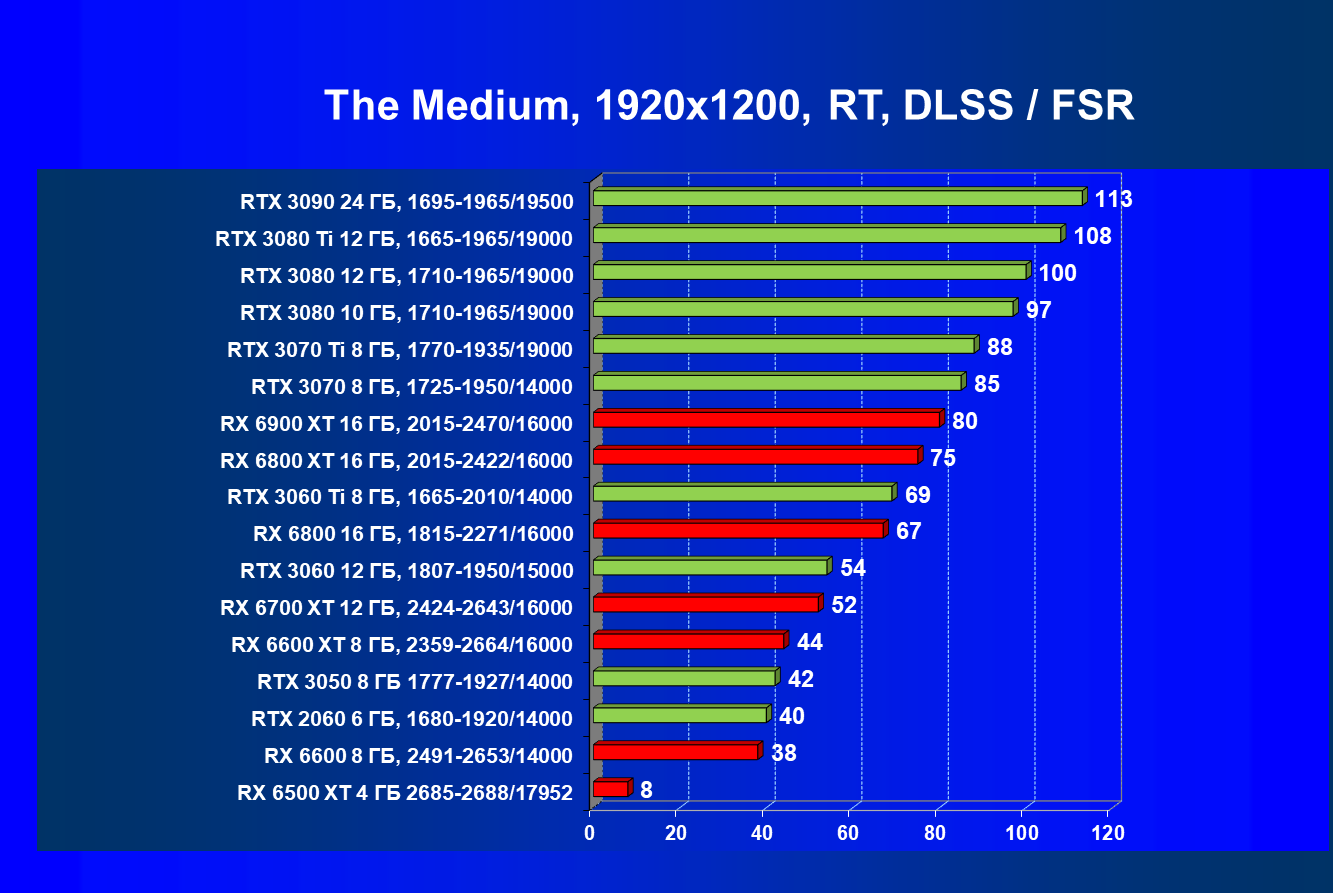Лучшие ускорители для разрешения 4К (при максимальном качестве графики) — GeForce RTX 3090, GeForce RTX 3080 Ti, GeForce RTX 3080, Radeon RX 6900 XT, Radeon RX 6800 XT. Они обеспечивают высокий уровень комфорта во всех играх без использования трассировки лучей. При включении RT ускорители Radeon RX 6000 для 4К смотрятся гораздо бледнее, скорее в их случае можно рассчитывать лишь на 2.5К. В принципе, для 4К еще вполне подойдут GeForce RTX 3070 Ti, GeForce RTX 3070 и Radeon RX 6800, но не во всех играх можно будет получить полный комфорт при максимальных настройках графики даже без RT.