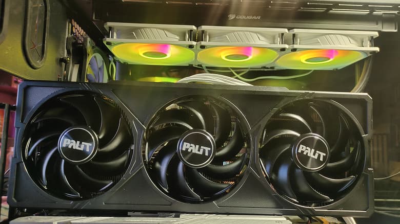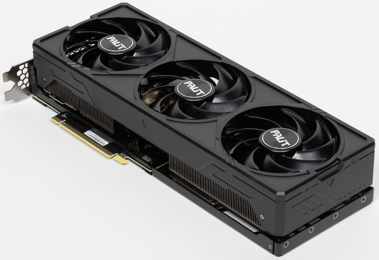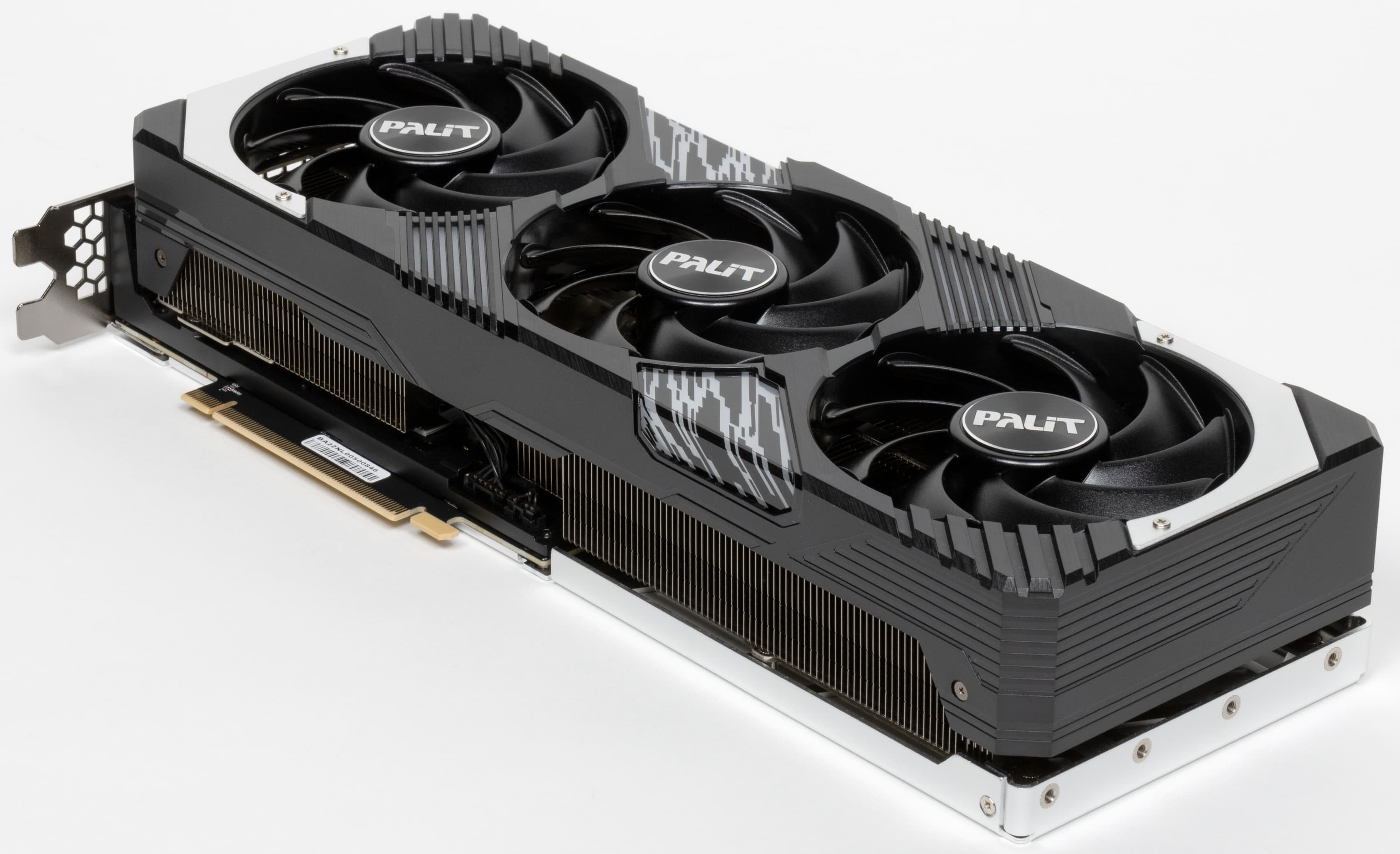 Выбранная карта Palit имеет относительно компактные размеры, позволяющие использовать ее в небольших корпусах, и не слишком громкую СО. Тестирование показало, что под нагрузкой в играх температура не превышала 70 °C, но шум вырастал до 34 дБА, что еще может считаться приемлемым результатом, но все-таки уже многовато. Кому-то покажется преимуществом наличие минимальной, но настраиваемой подсветки. Карта имеет 2 разъема питания (8- и 6-контактный) и стандартный набор видеовыходов (три DP 1.4a и один HDMI 2.1).