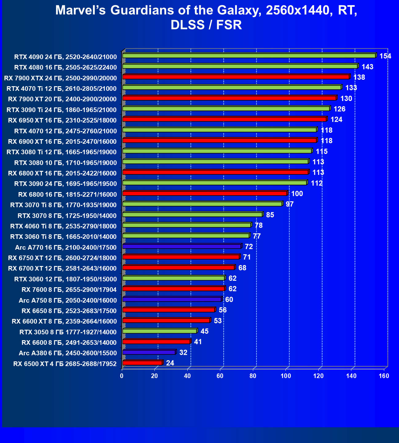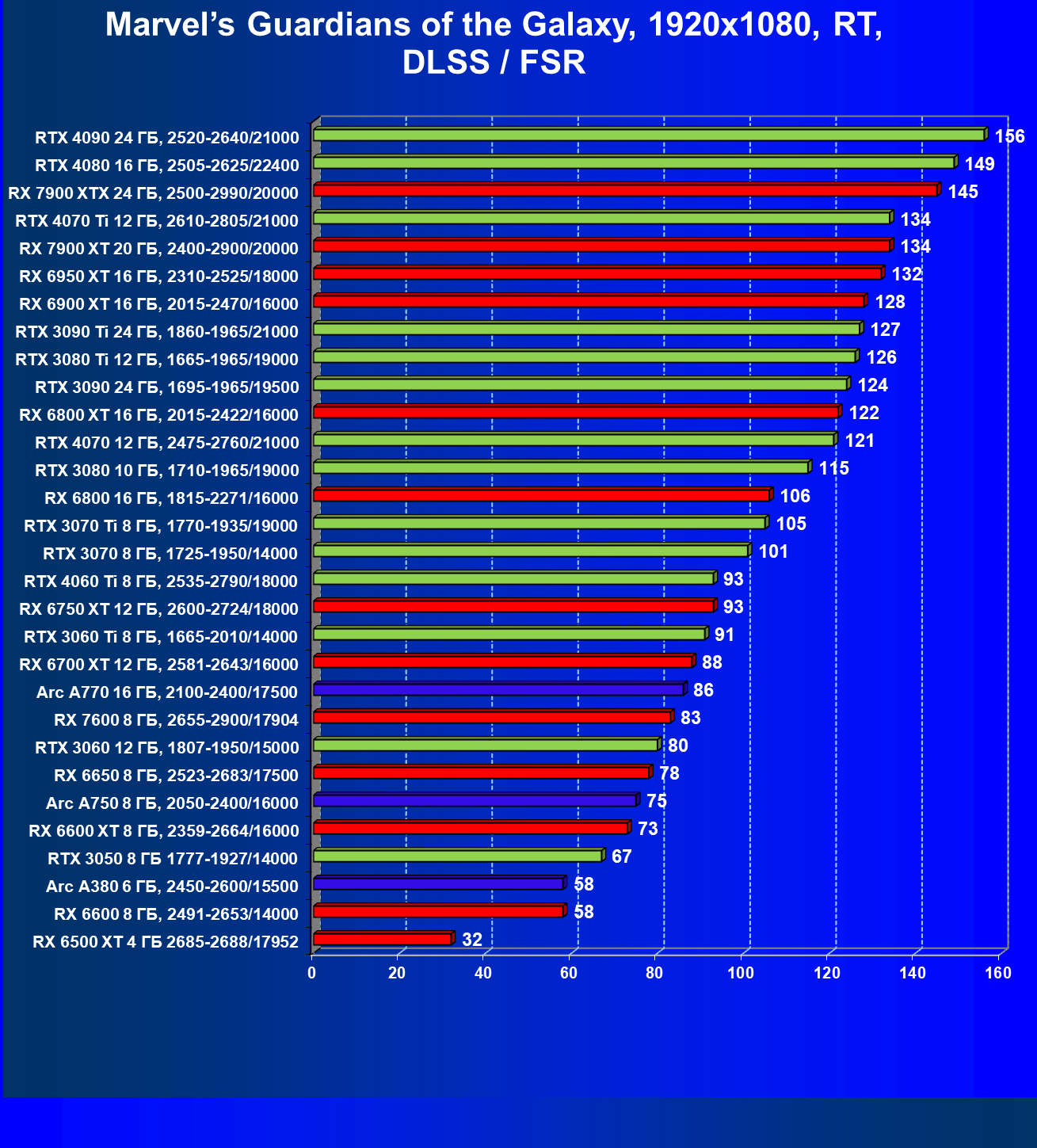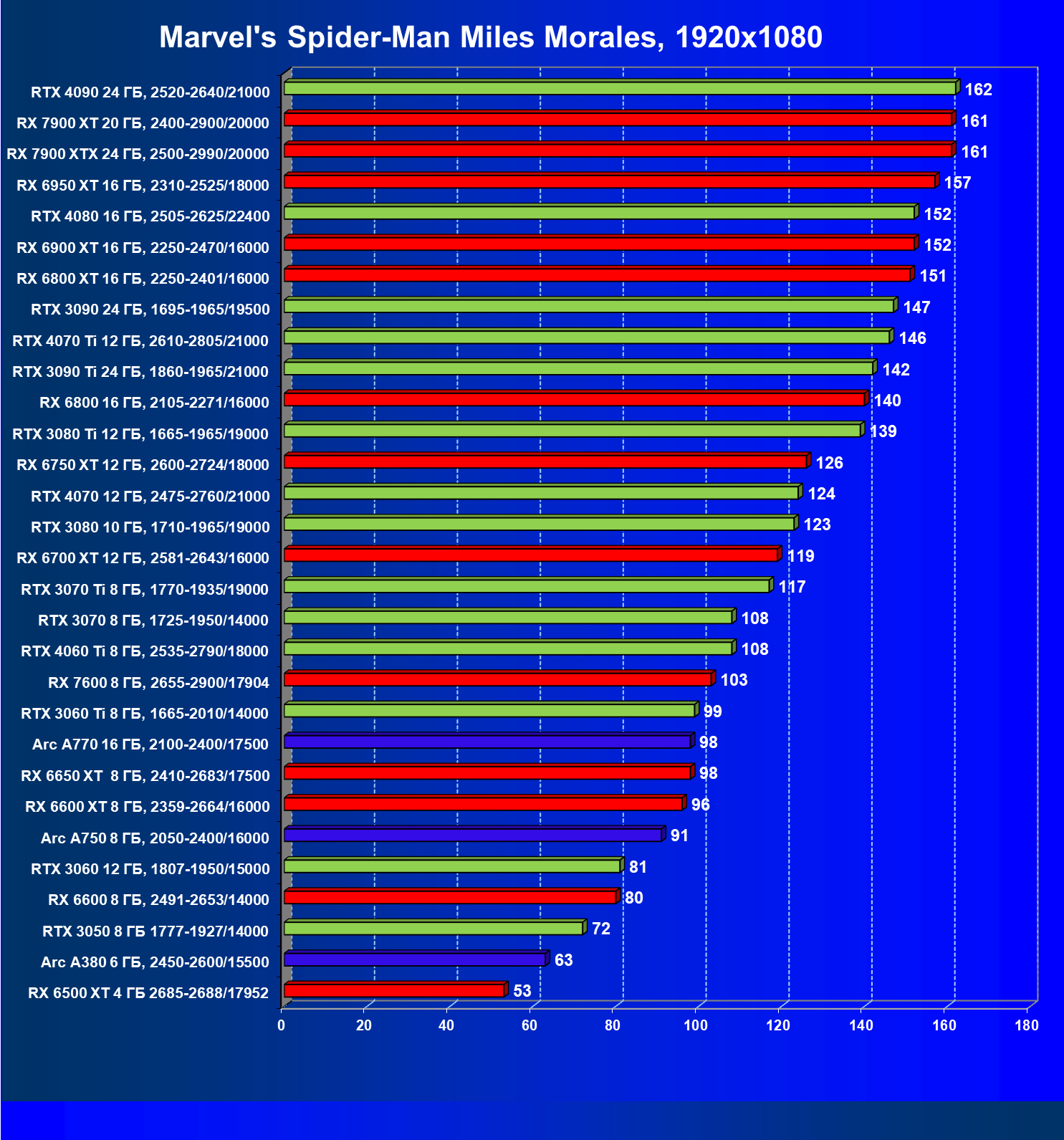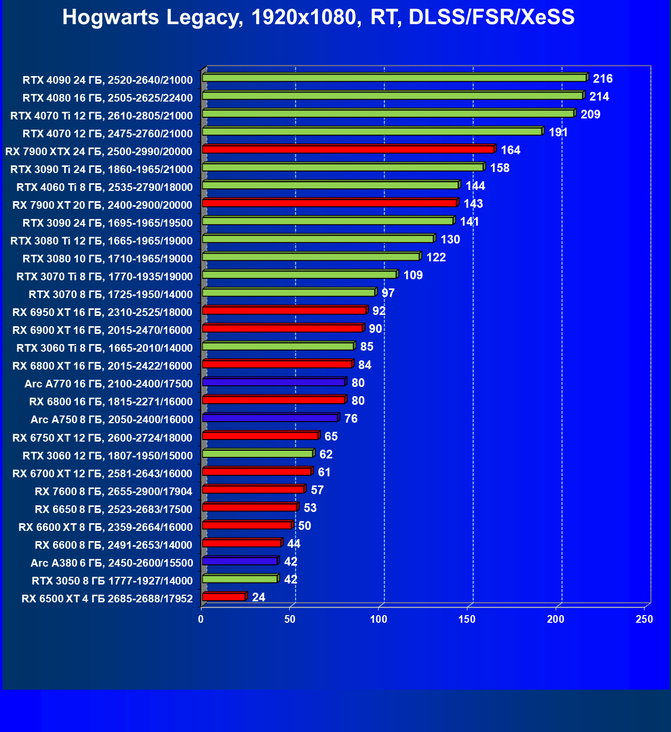 Все упомянутые видеокарты подойдут и для игр на мониторах с более массовым разрешением Full HD. При включении трассировки лучей совместно с DLSS, FSR или XeSS полный комфорт обеспечивают карты уровня Radeon RX 6700 XT и GeForce RTX 3060, а также Intel Arc A770 или Radeon RX 7600. А вот Radeon RX 6500 XT включение RT просто не потянет.