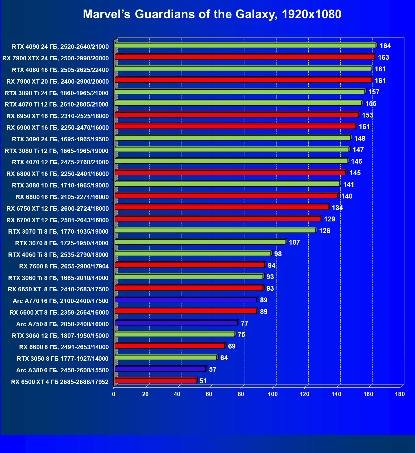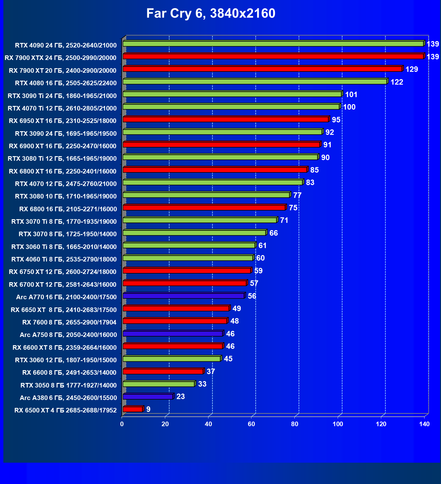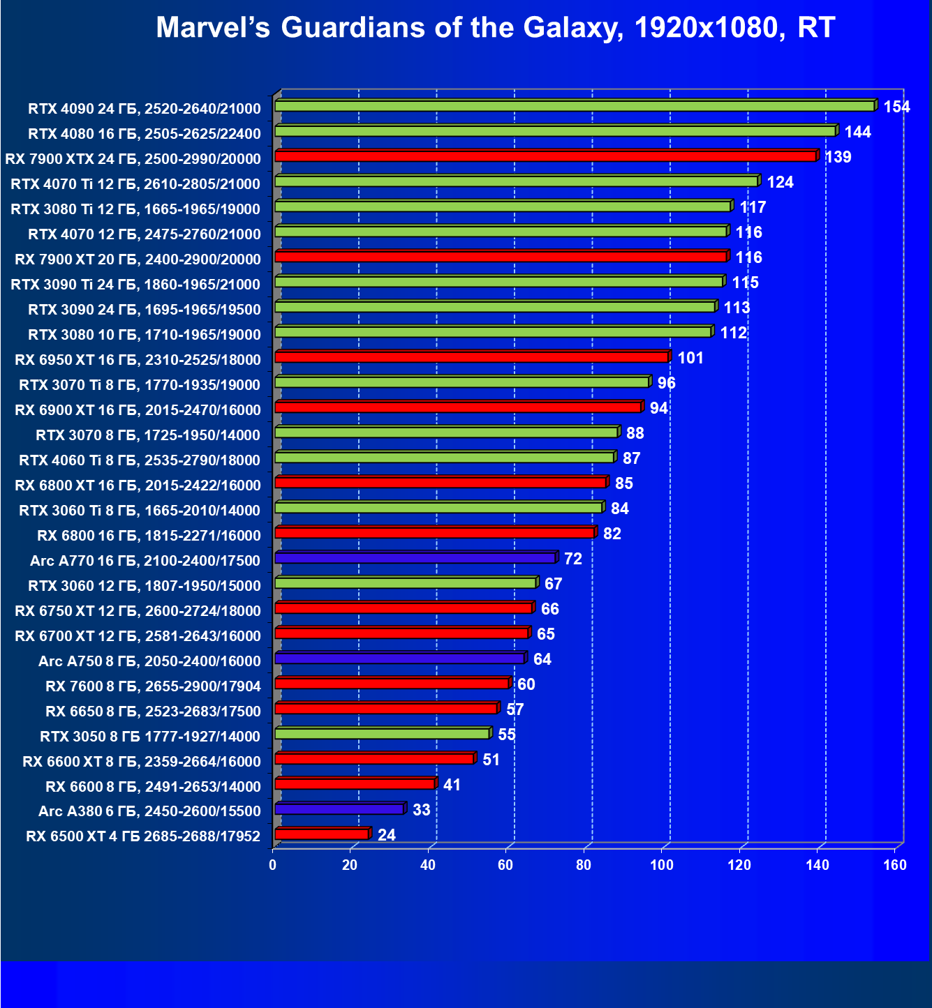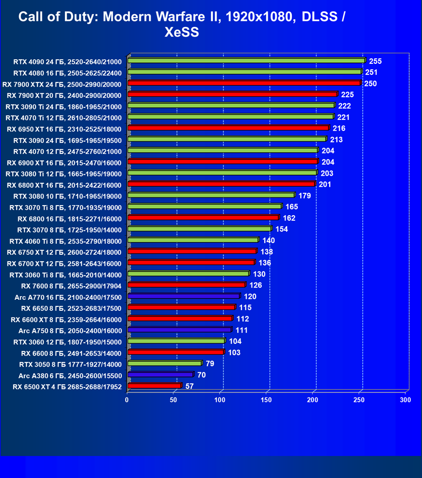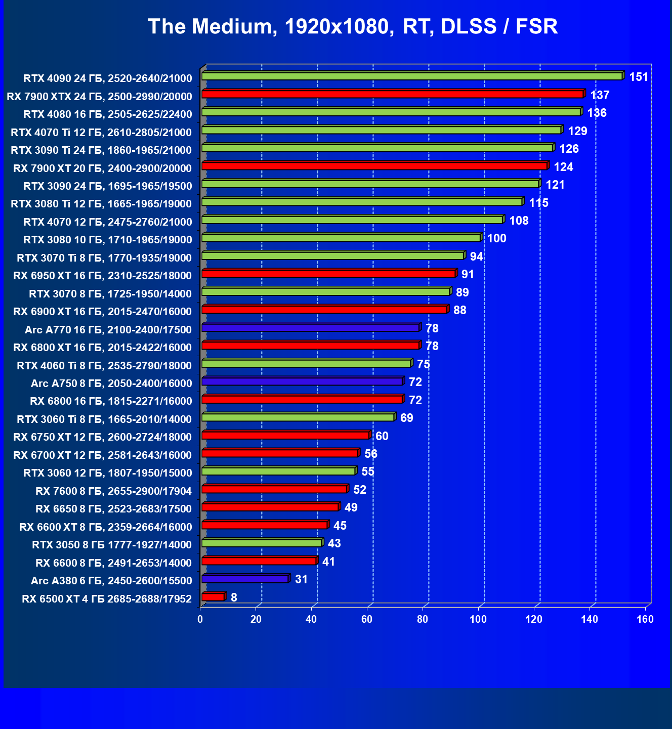 Все упомянутые видеокарты подойдут и для игр на мониторах с более массовым разрешением Full HD. При включении трассировки лучей совместно с DLSS, FSR или XeSS полный комфорт обеспечивают карты уровня Radeon RX 6700 XT и GeForce RTX 3060, а также Intel Arc A770 или Radeon RX 7600. А вот Radeon RX 6500 XT включение RT просто не потянет.