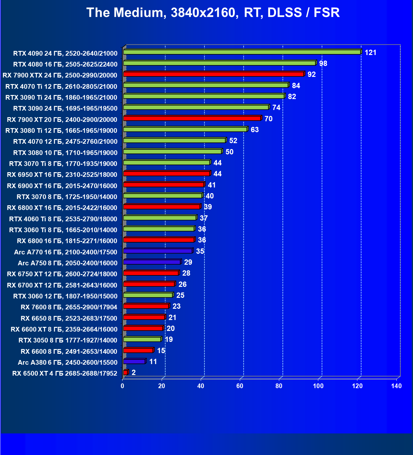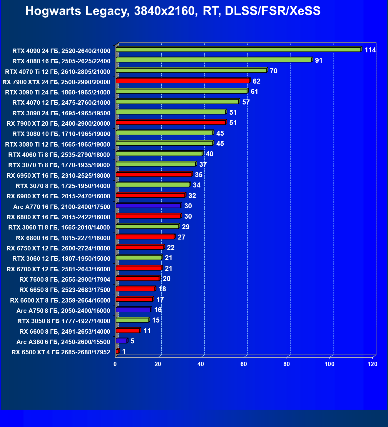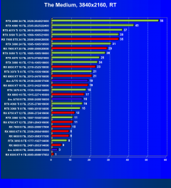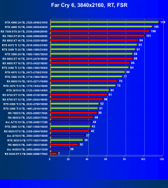 Менее производительные карты уровня GeForce RTX 3070 Ti, GeForce RTX 3070 и Radeon RX 6800 демонстрируют в разрешении 4K приемлемый FPS не во всех играх даже без включения RT (но при максимальных настройках графики), и желательно будет включать DLSS/FSR/XeSS.