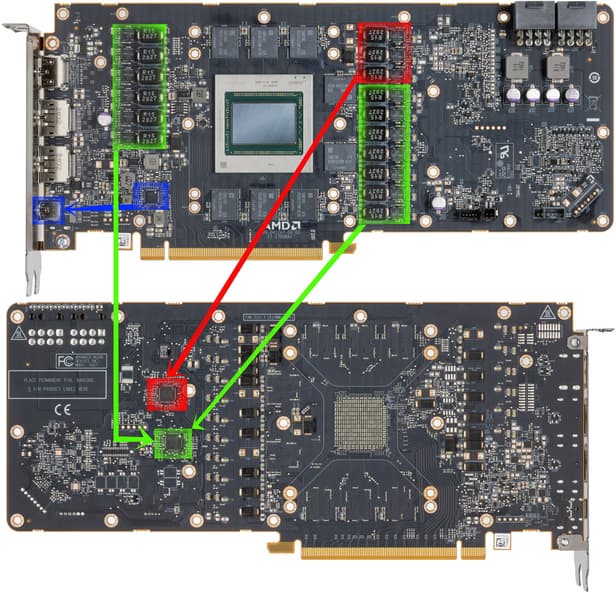 Выбранная нами карта ASRock имеет очень эффективную и тихую систему охлаждения. В режиме максимальной нагрузки в 3D температура достигала 65/72/72 °C (ядро/hot spot/память), а шум вырастал до 27,0 дБА: это тихо. Габариты этой модели составляют 30 см в длину и 13 см в высоту, а по толщине видеокарта занимает 3 слота в корпусе. Она имеет стандартный набор видеовыходов: 3 DP 2.0 и 1 HDMI 2.1. Карта ASRock имеет два 8-контактных разъема питания типа PCIe 2.0. Изюминкой этой карты является стильная подсветка.