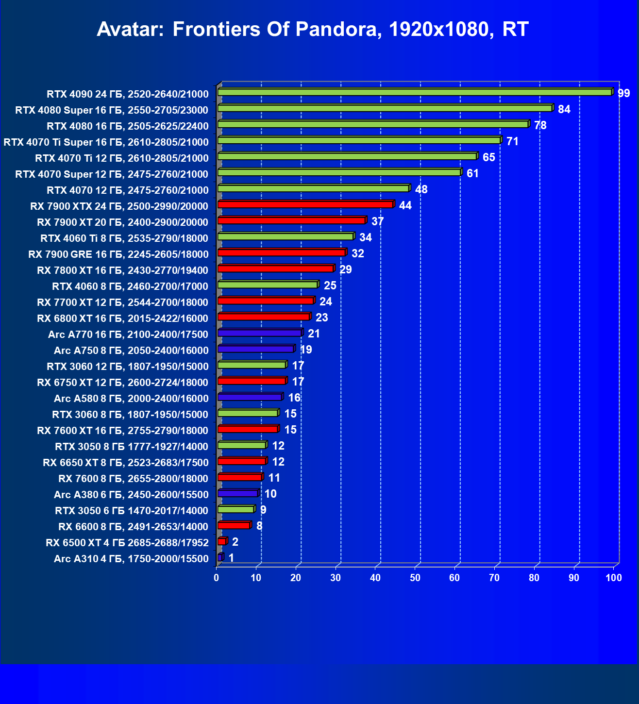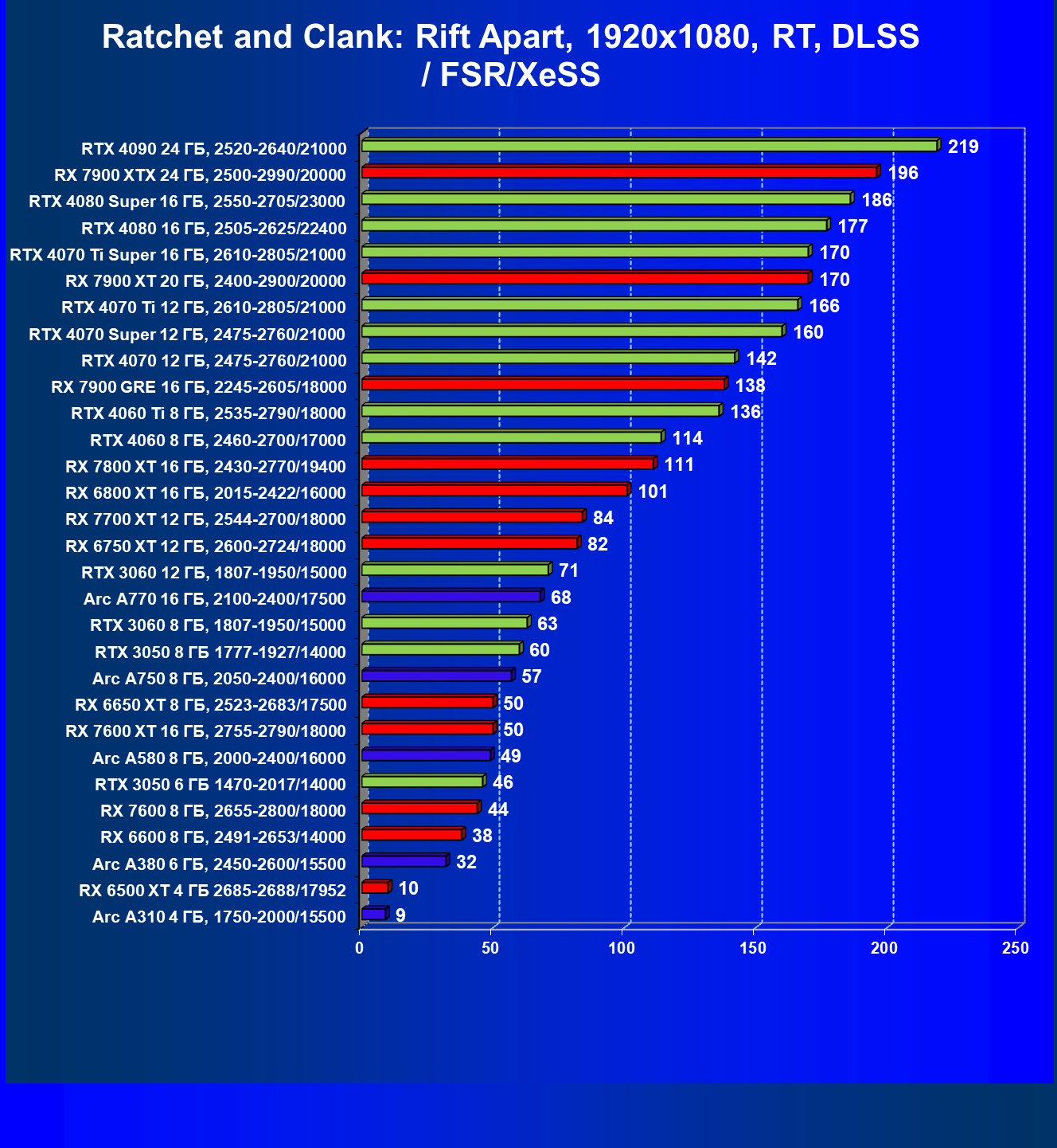 Карты уровня Radeon RX 7600, Radeon RX 6650 XT, Radeon RX 6600, Arc A580, GeForce RTX 3060 8 ГБ, GeForce RTX 3050 8 ГБ могут обеспечить приемлемый комфорт в играх при использовании RT совместно с технологиями масштабирования. А вот Radeon RX 6500 XT, Arc A310 и GeForce RTX 3050 6 ГБ включение RT не вытягивают, у них поддержка трассировки лучей лишь номинальная.