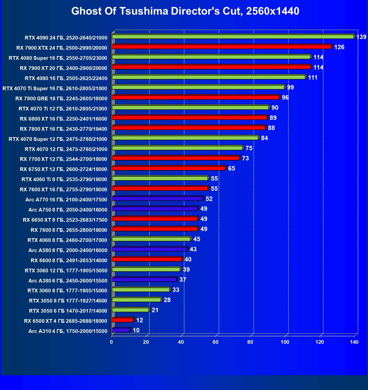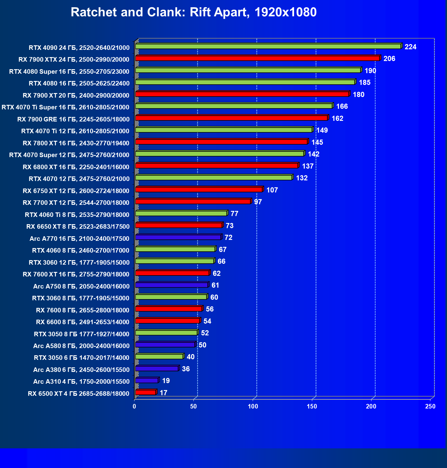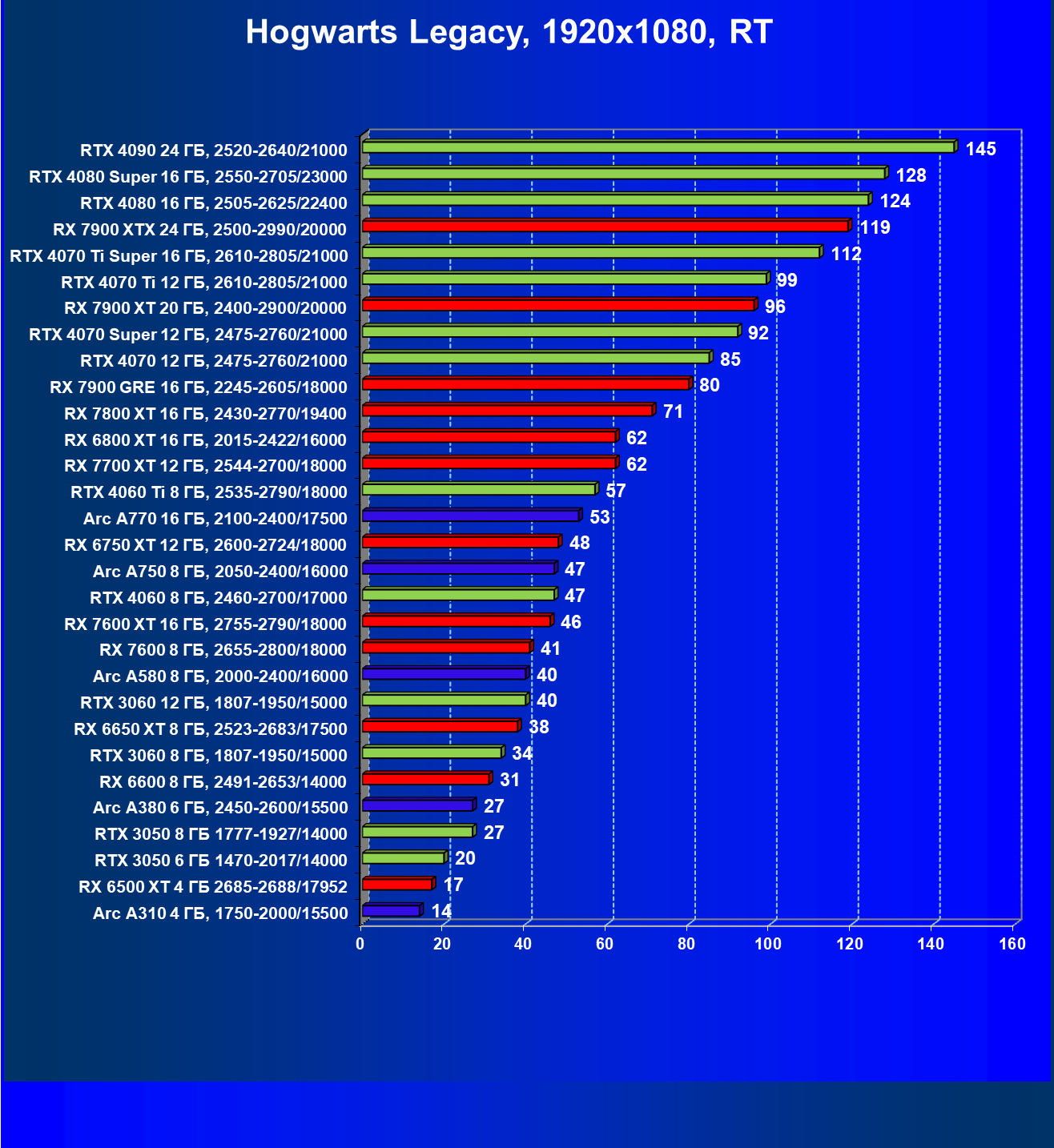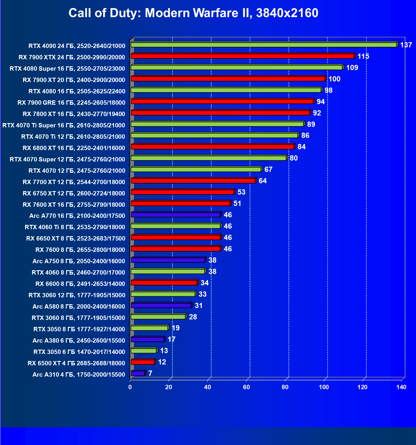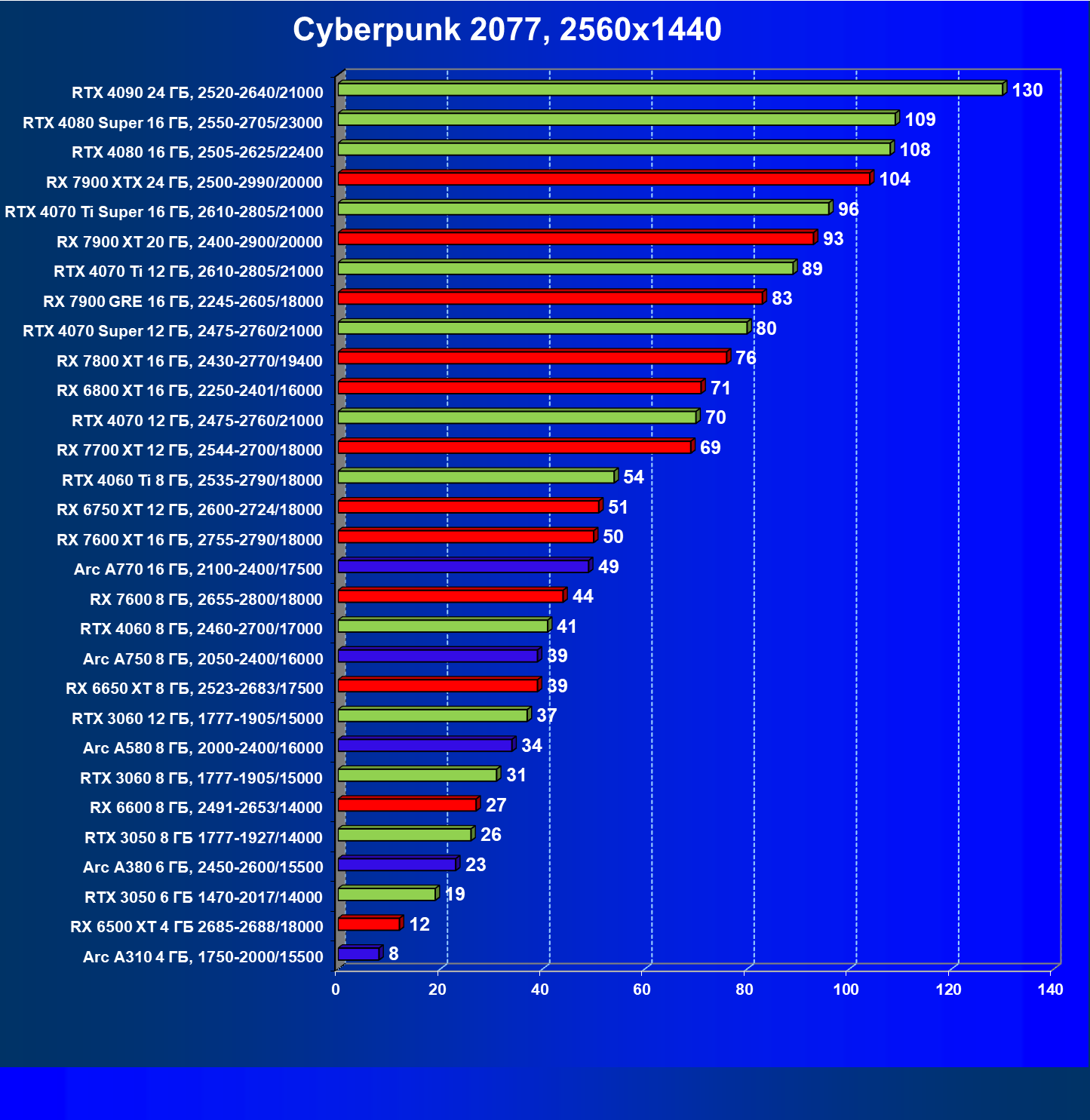 В разрешении Full HD отлично себя показывают Arc A750, Arc A580, GeForce RTX 3060 и Radeon RX 6600. GeForce RTX 3050 8 ГБ также обеспечивает приличный комфорт (но иногда придется снижать настройки графики). В ряде случаев в очень сложных по графике играх придется подбирать ускорители на уровень выше (либо понижать настройки графики).