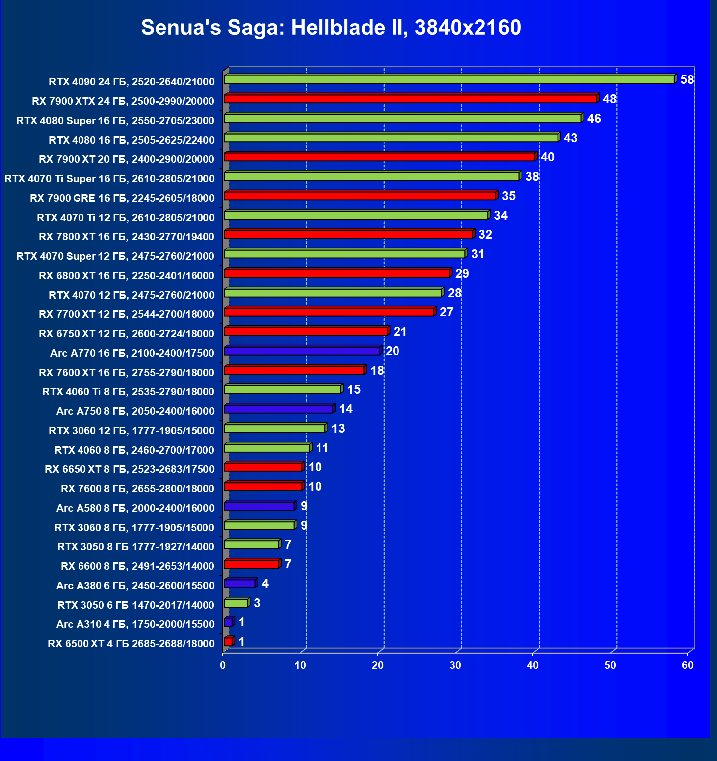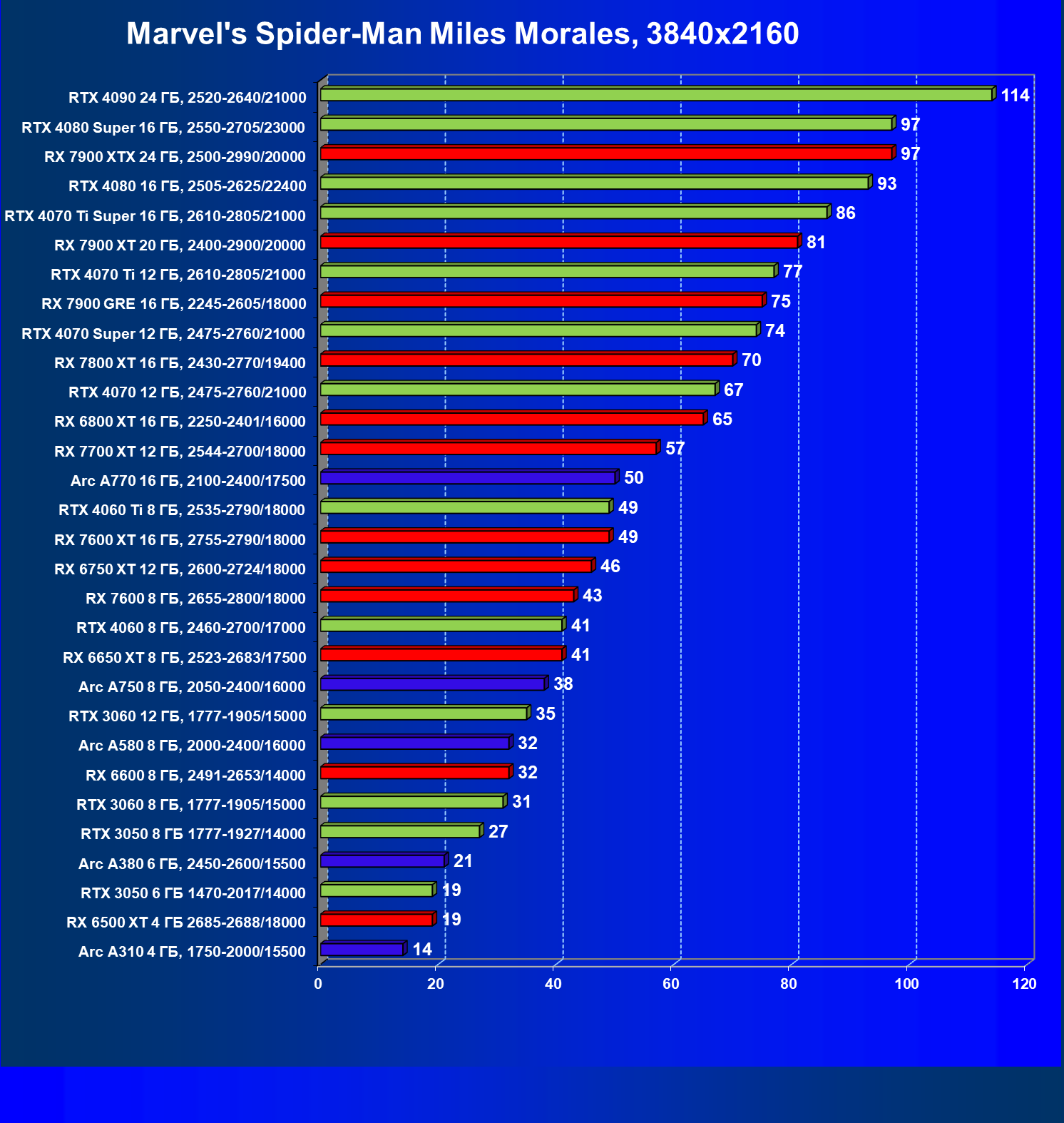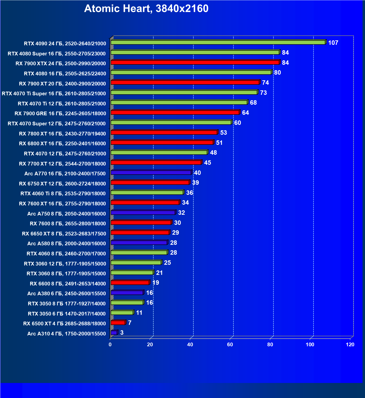 GeForce RTX 4090, GeForce RTX 4080 Super, GeForce RTX 4080, GeForce RTX 4070 Ti Super и Radeon RX 7900 XTX, в принципе, осиливают даже разрешение 8K (но без оговорок — только GeForce RTX 4090).