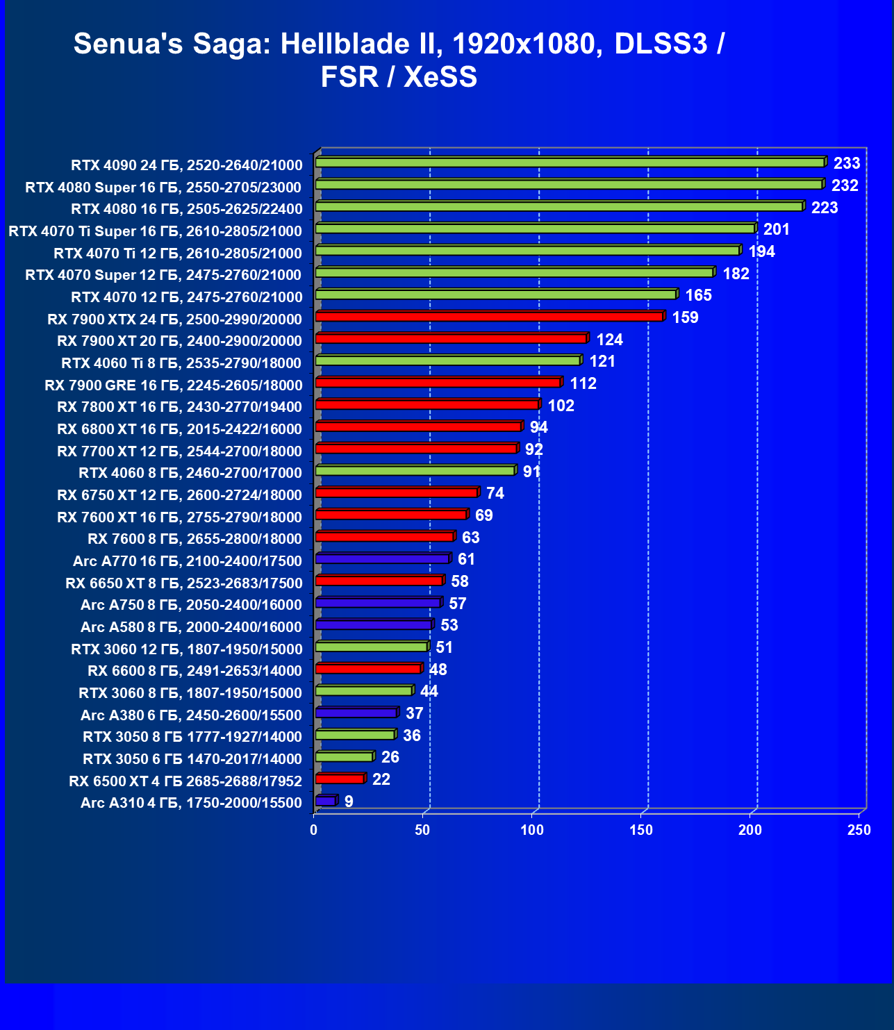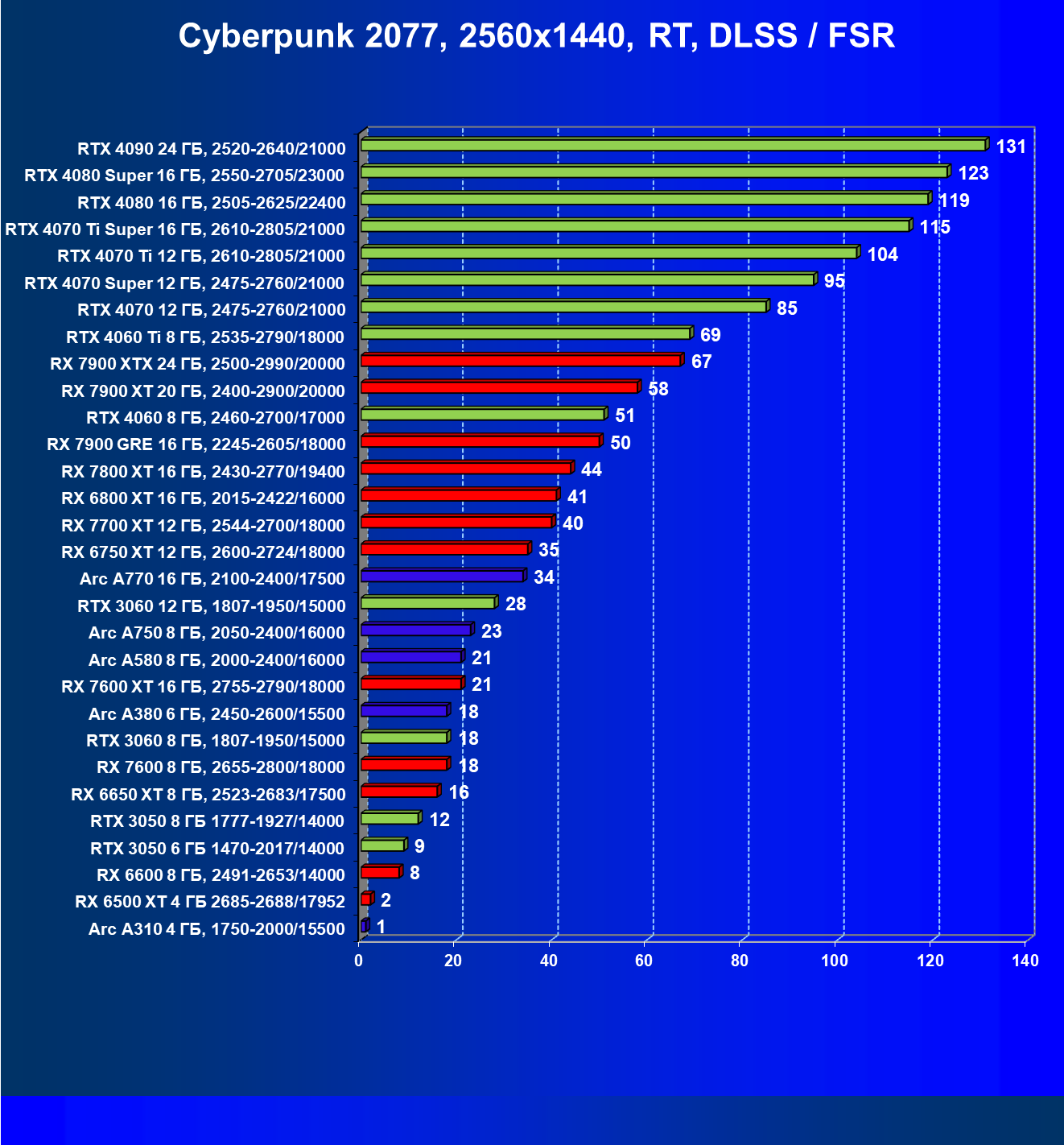Все упомянутые видеокарты подойдут и для игр на мониторах с более массовым разрешением Full HD. При включении трассировки лучей совместно с DLSS, FSR или XeSS полный комфорт обеспечивают карты уровня Radeon RX 7700 XT, Radeon RX 6750 XT, GeForce RTX 4060, GeForce RTX 3060 12 ГБ, а также Arc A770.