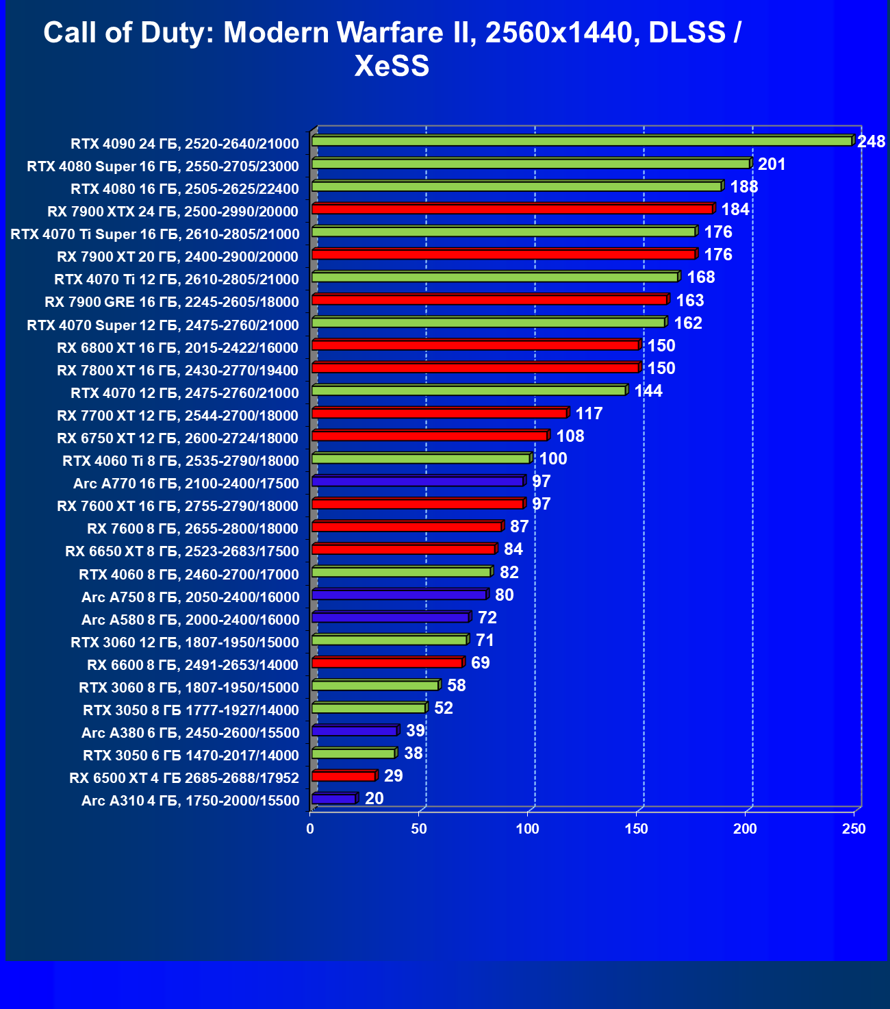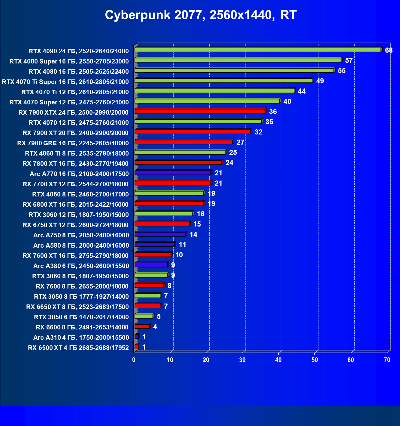 В рейтинге полезности для разрешения 2560×1440 в классических играх без RT лидером является ускоритель Arc A750 8 ГБ из-за достаточного объема памяти для такого разрешения и оптимальной цены. А вот в играх с RT и технологиями масштабирования самым выгодным является GeForce RTX 4060 Ti.