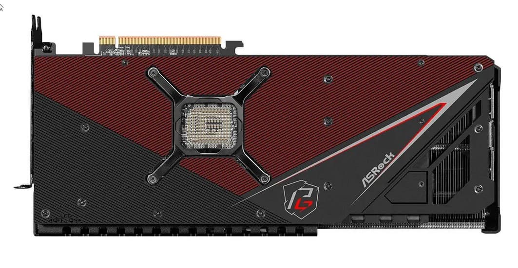 Выбранная карта ASRock имеет внушительные габариты (330×140×58 мм) и занимает 3 слота в системном блоке. Зато с таким огромным кулером карта работает достаточно тихо. Набор видеовыходов стандартный — 1×HDMI 2.1 и 3×DisplayPort 2.1. Карта питается через три 8-контактных разъема питания PCIe 2.0.