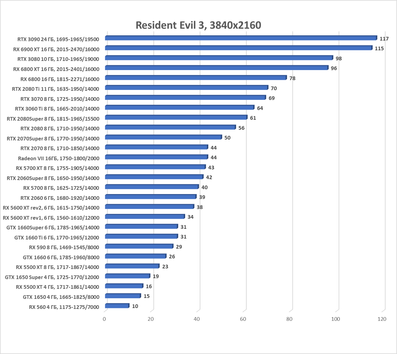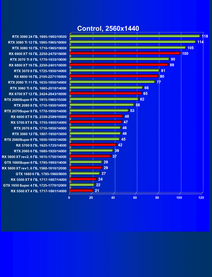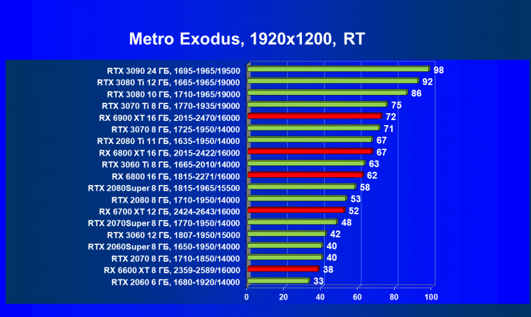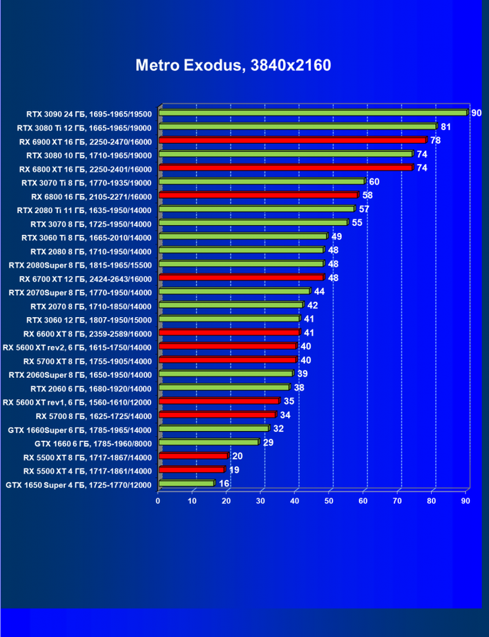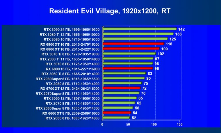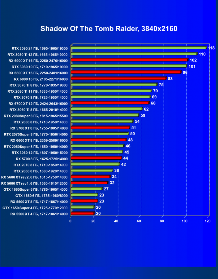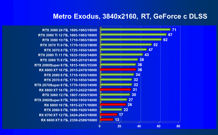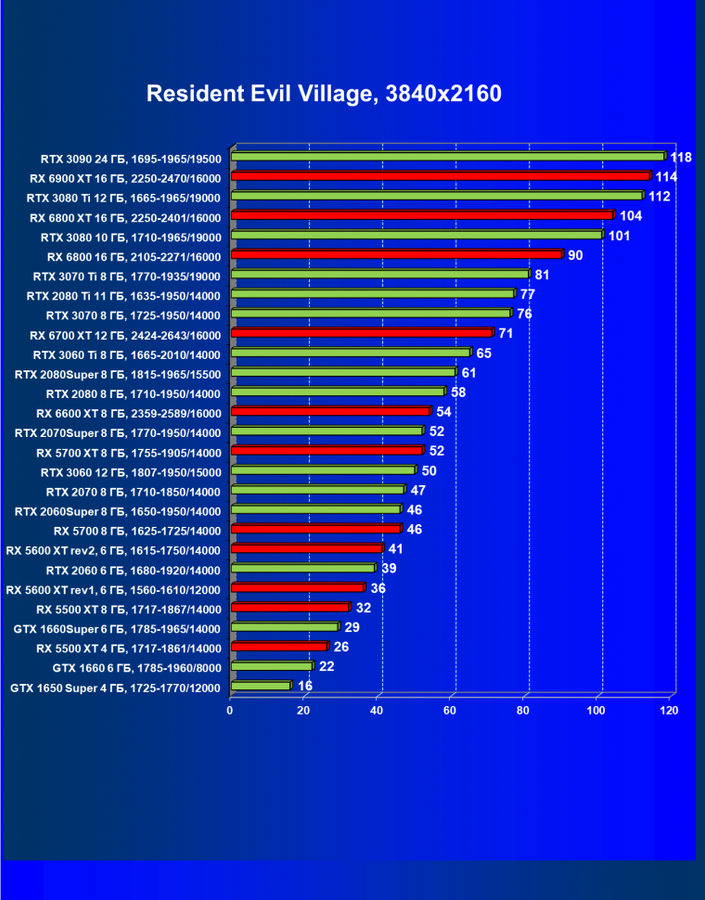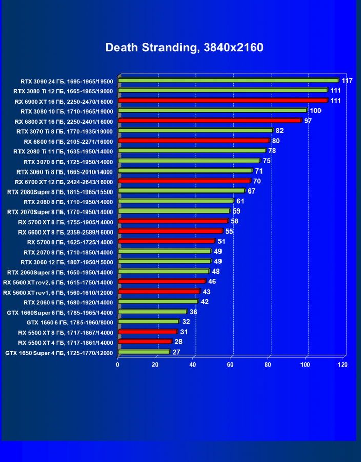 Лучшие ускорители для разрешения 4К (при максимальном качестве графики) — GeForce RTX 3090, GeForce RTX 3080 Ti, GeForce RTX 3080, Radeon RX 6900 XT, Radeon RX 6800 XT. Они обеспечивают высокий уровень комфорта во всех играх без использования трассировки лучей. При включении RT ускорители Radeon RX 6000 для 4К смотрятся гораздо бледнее, скорее в их случае можно рассчитывать лишь на 2.5К. В принципе, для 4К еще вполне подойдут GeForce RTX 3070 Ti, GeForce RTX 3070 и Radeon RX 6800, но не во всех играх можно будет получить полный комфорт при максимальных настройках графики даже без RT.
