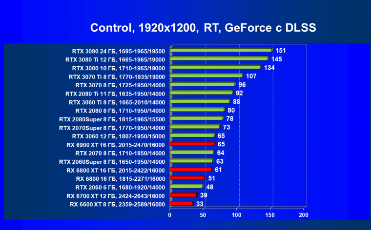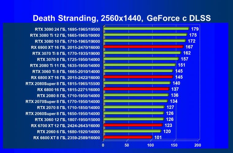 Напоминаем, что GeForce RTX 3060 Ti отлично подходит для игры в разрешении 2.5К, даже с RT(+DLSS) этот ускоритель способен обеспечить приемлемый комфорт в играх в таком разрешении. Разумеется, в разрешении Full HD эта видеокарта легко потянет все игры с максимальным качеством графики с трассировкой лучей даже без DLSS, а в некоторых играх GeForce RTX 3060 Ti выдает выше 60 fps с RT без DLSS и в 2560×1440. В принципе, есть игры, в которых даже в разрешении 4К этот ускоритель может обеспечить хороший комфорт без RT. Конкурентом является AMD Radeon RX 6700 XT, который в играх без трассировки лучей опережает GeForce RTX 3060 Ti .