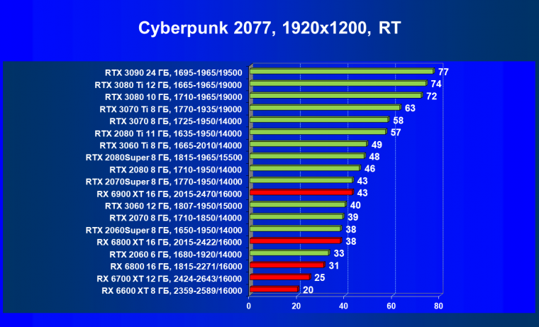 | 04 | RX 6700 XT 12 ГБ, 2424—2643/16000 | 48 | 383 | 80 000 |