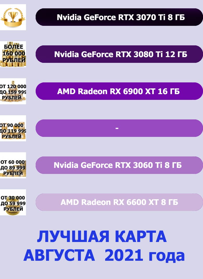 | 17 | RX 6800 XT 16 ГБ, 2015—2422/16000 | 15 | 210 | 137 000 |