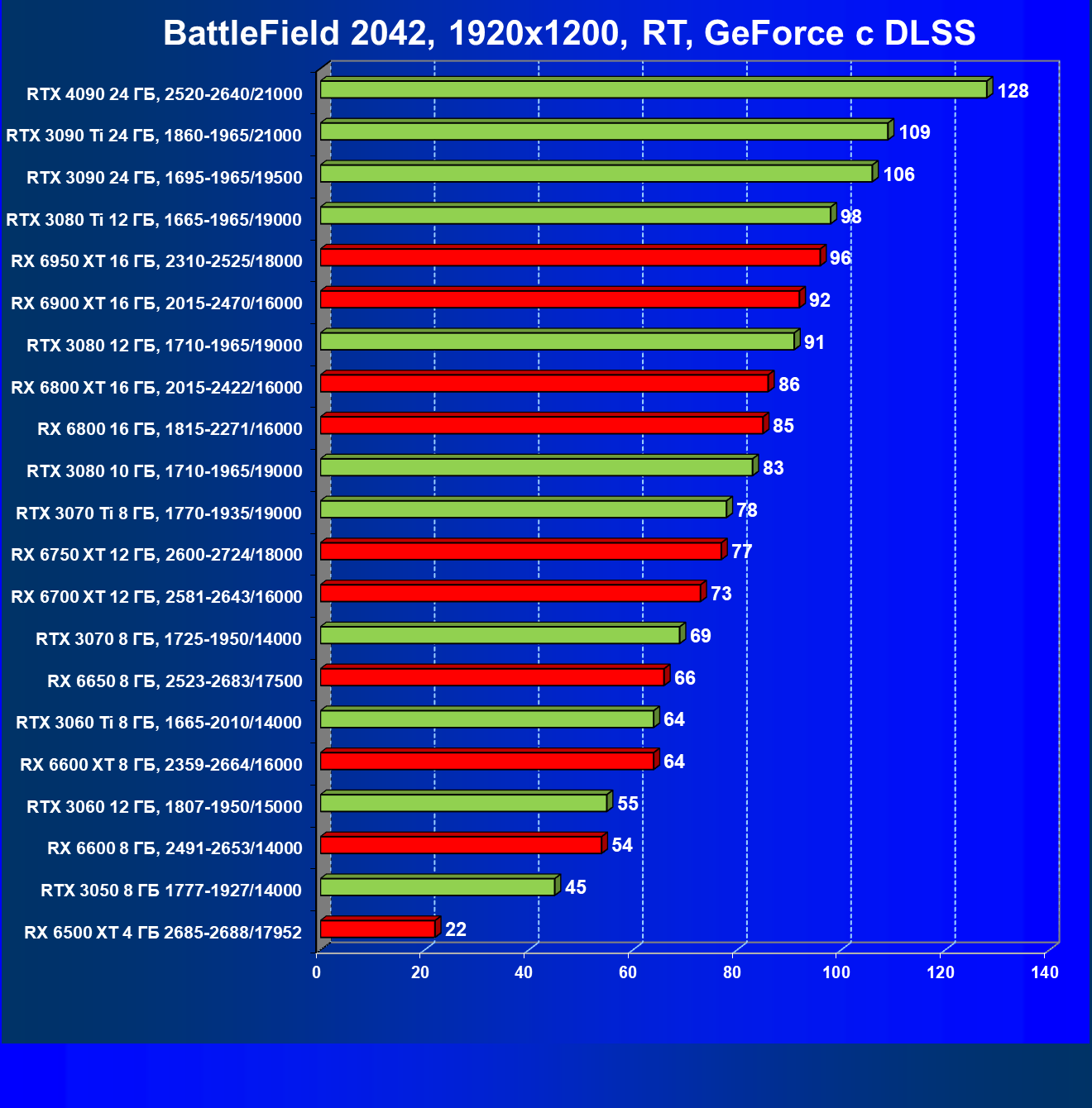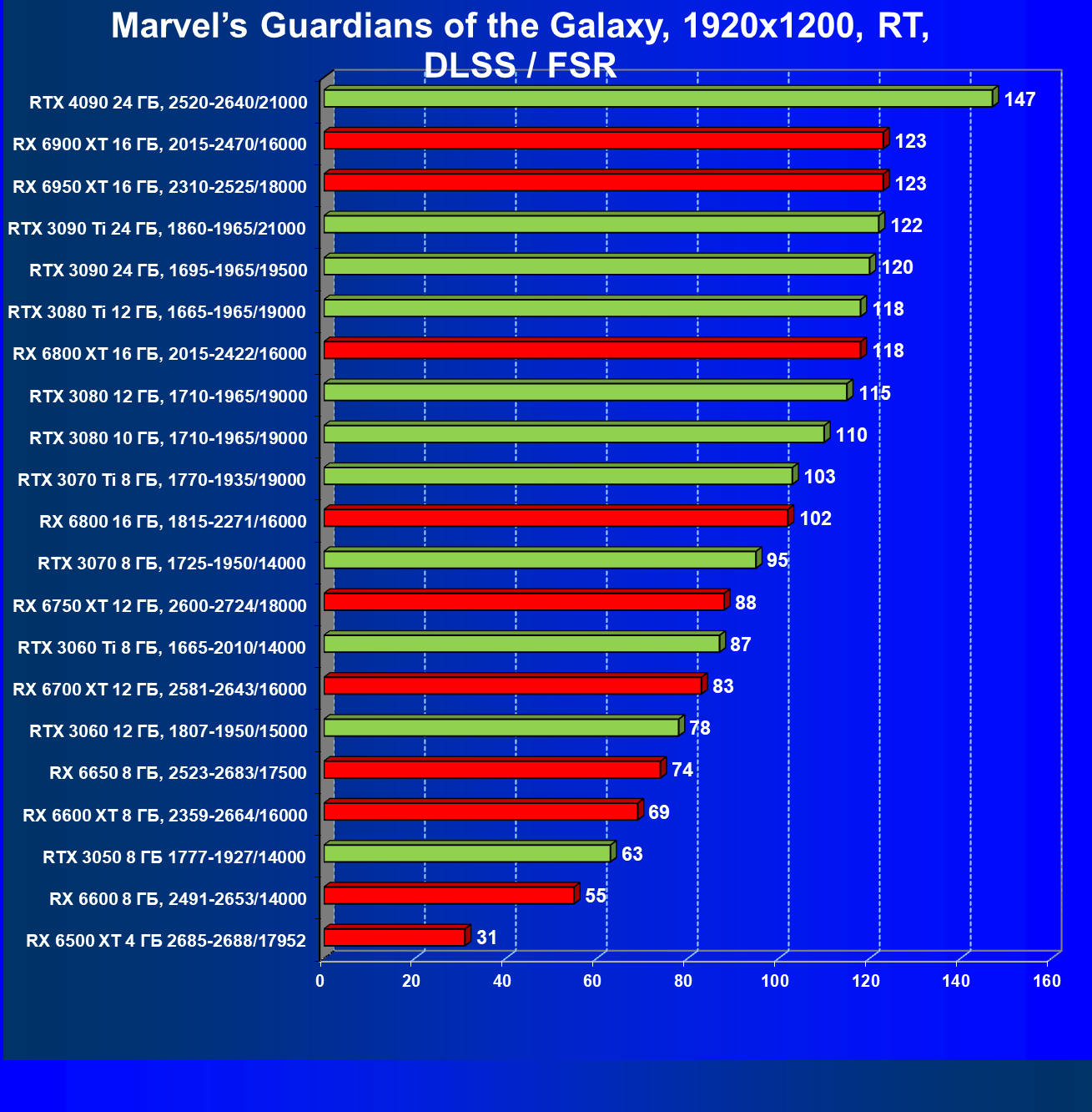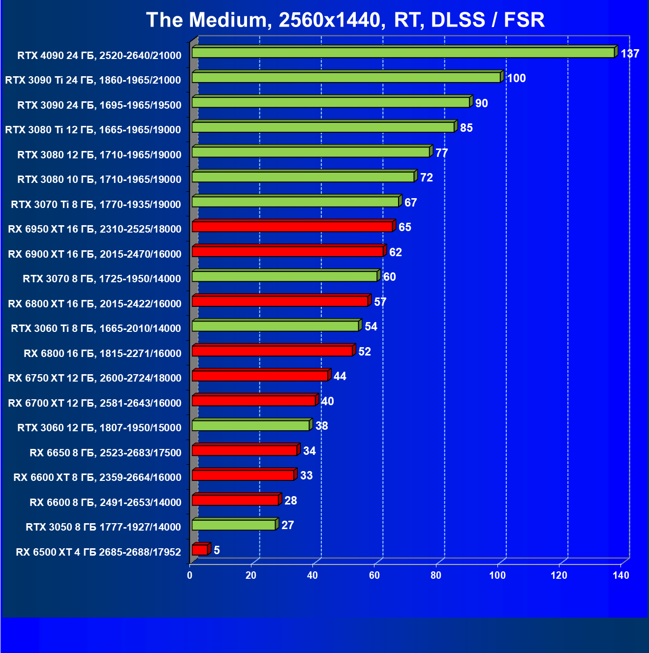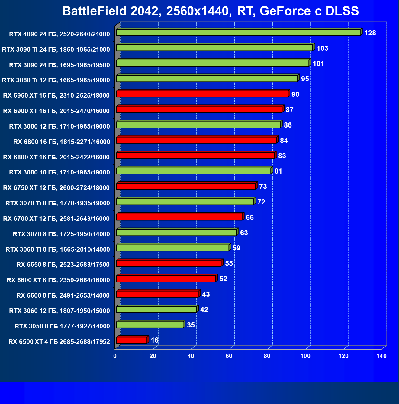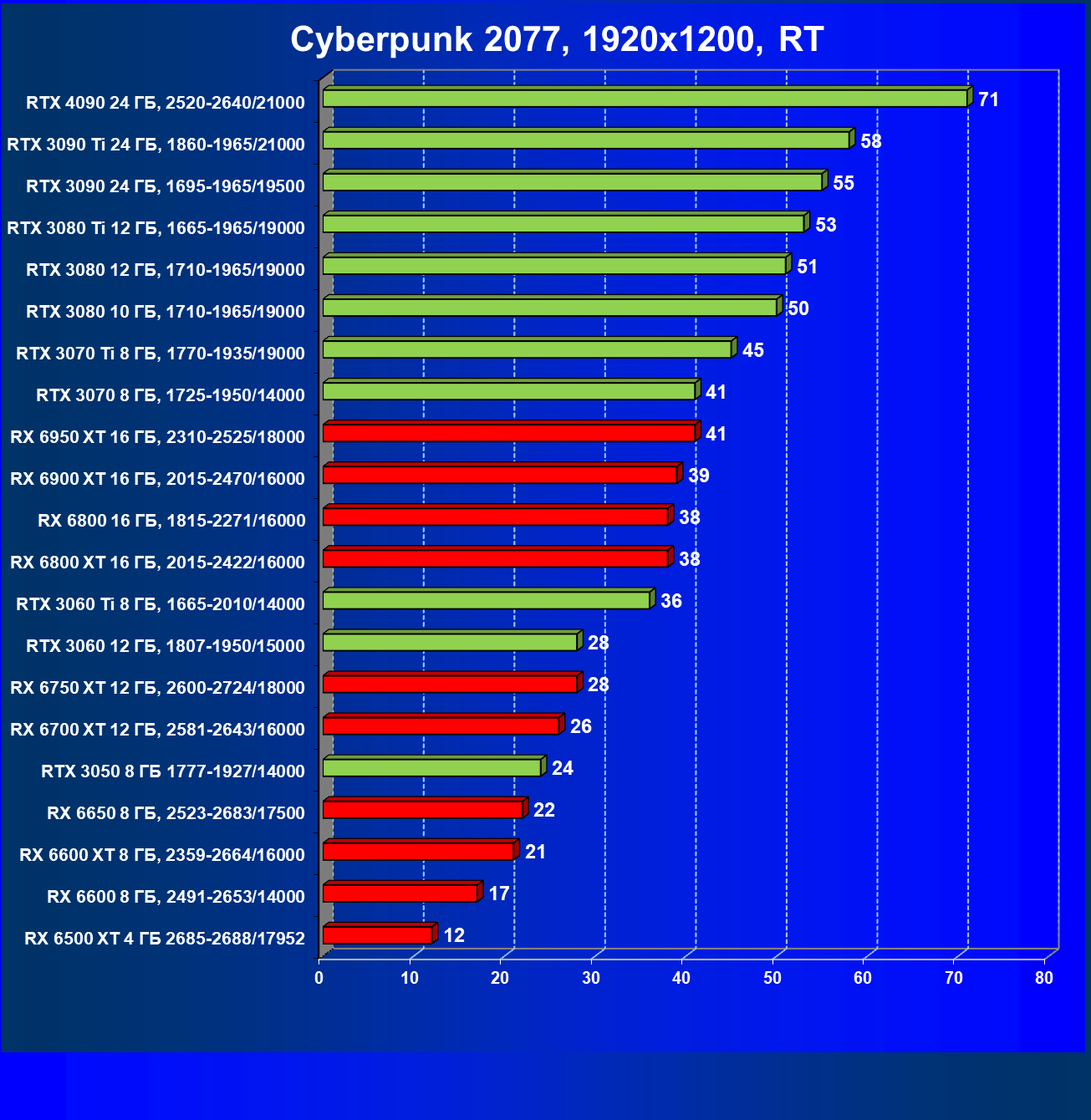 Все упомянутые видеокарты подойдут и для игр на мониторах с более массовым разрешением Full HD. При включении трассировки лучей совместно с DLSS или FSR полный комфорт обеспечивают карты уровня Radeon RX 6600 XT и GeForce RTX 3060, и даже GeForce RTX 3050 может подойти. А вот для Radeon RX 6500 XT включение RT будет смертельным.