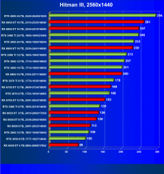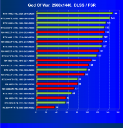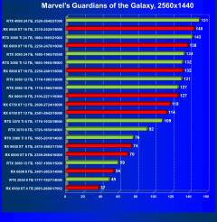 Составлен отдельный рейтинг полезности для разрешения 2560×1440. Взяты все ускорители, которые имеют средний FPS в играх в данном разрешении не ниже 50 (примерно). Остальные, следовательно, для этого разрешения не годятся и убраны из рейтинга (при этом нормирование результатов все равно идет по Radeon RX 6500 XT). Лидером стал GeForce RTX 3060 Ti 8 ГБ из-за еще достаточного объема памяти для такого разрешения и оптимальной цены. На втором месте оказался GeForce RTX 3070 8 ГБ, который безусловно дороже, но и более производителен — позволит поиграть в современные игры в разрешении 2.5K. Конкурент в лице Radeon RX 6700 XT 12 ГБ находится рядом с GeForce RTX 3070 8 ГБ, однако в играх с трассировкой лучей он существенно теряет в производительности, хотя уже выпущена обновленная версия технологии FSR, которая помогает восполнять потерю количества кадров в секунду за счет динамического рендеринга в меньшем разрешении).
