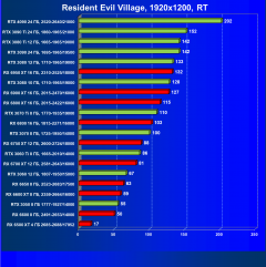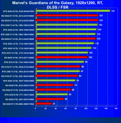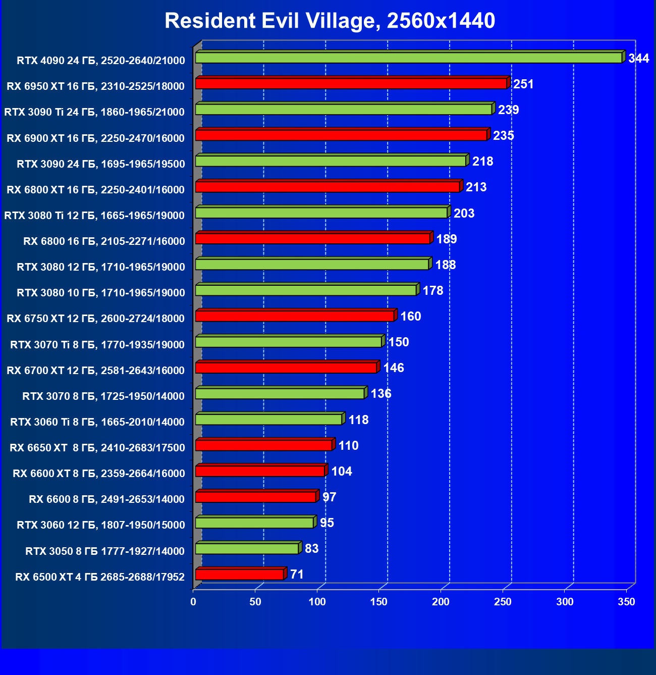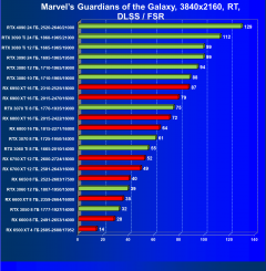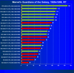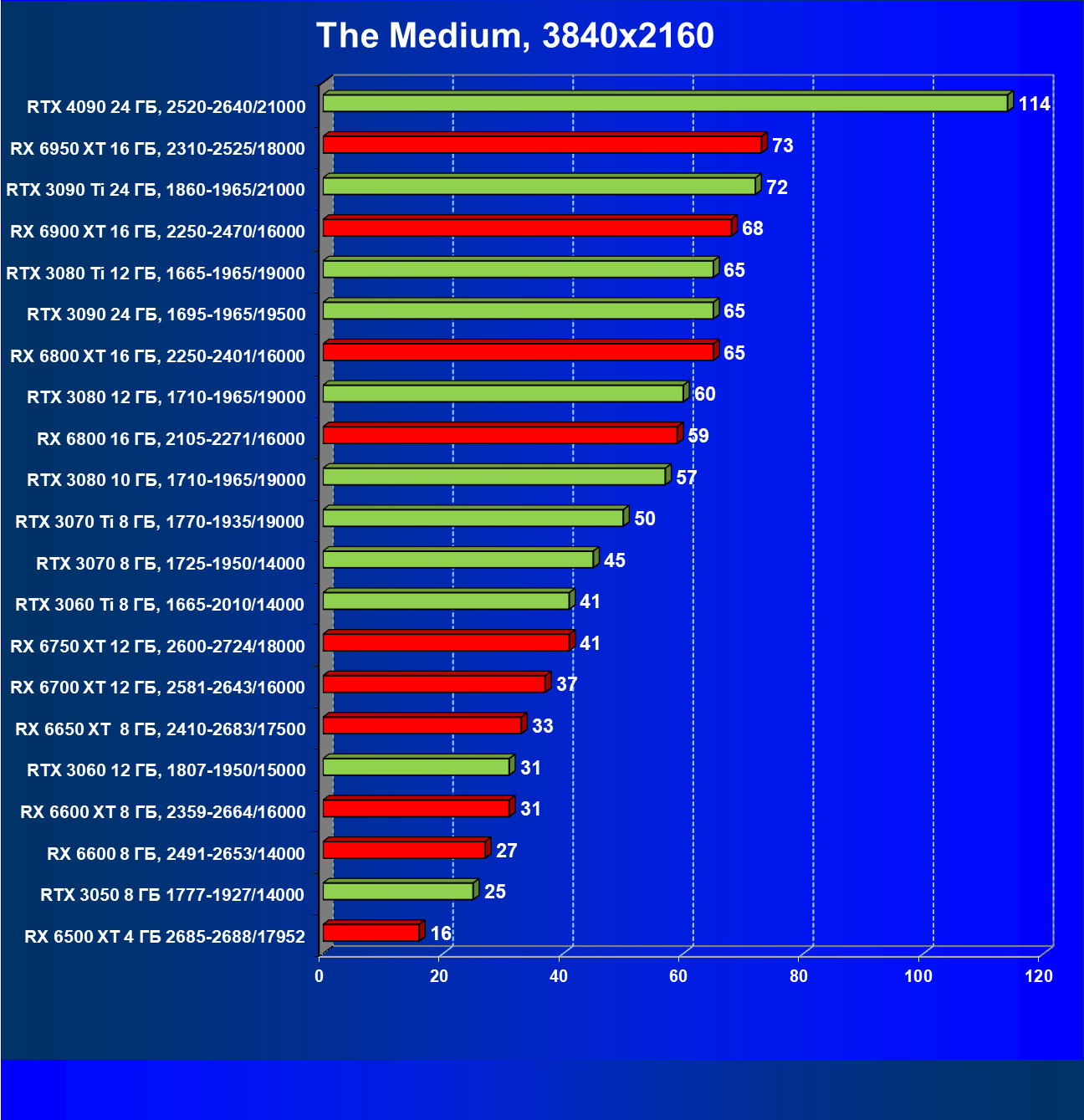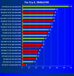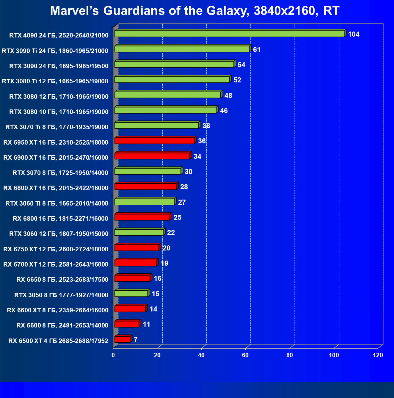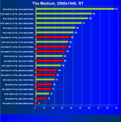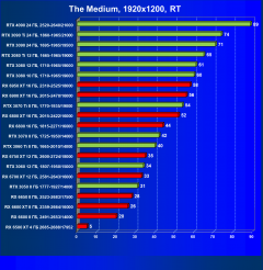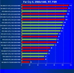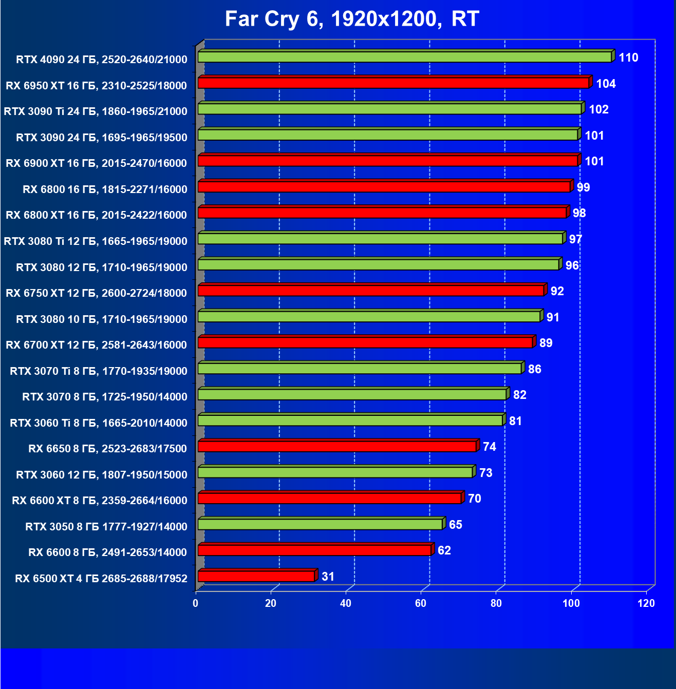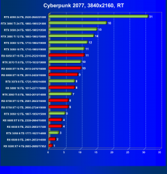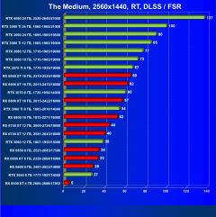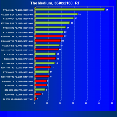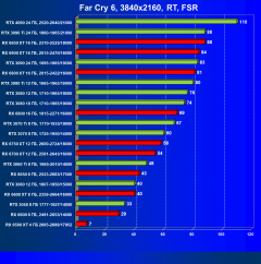 Ускорители семейства Radeon RX 6000 при включении RT в разрешении 4K смотрятся гораздо бледнее, обычно в их случае можно рассчитывать лишь на комфорт в разрешении 2.5К (да и то с включением FSR). Даже Radeon RX 6950 XT с трудом справляется с играми в разрешении 4K с трассировкой лучей, его и RX 6900 XT спасает только поддержка в игре технологии FSR. В этом плане у семейства GeForce RTX ситуация лучше.