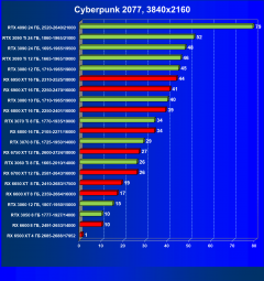 Составлен отдельный рейтинг полезности для разрешения 3840×2160. Аналогично, в рейтинге представлены все ускорители, которые имеют средний FPS в играх в данном разрешении не ниже 50 (примерно). Самые подходящие для такого высокого разрешения ускорители GeForce RTX 3080/3080 Ti/3090/3090 Ti, а также Radeon RX 6800 XT/6900 XT/6950 XT попасть в лидеры рейтинга полезности не могут из-за высоких цен, такая же ситуация и у более производительной новинки GeForce RTX 4090. Новое поколение технологии DLSS 3 будет поддерживаться исключительно семейством GeForce RTX 40, оно обеспечит новинкам большее преимущество, но для начала нужно, чтобы вышли соответствующие патчи для игр с поддержкой DLSS 3.