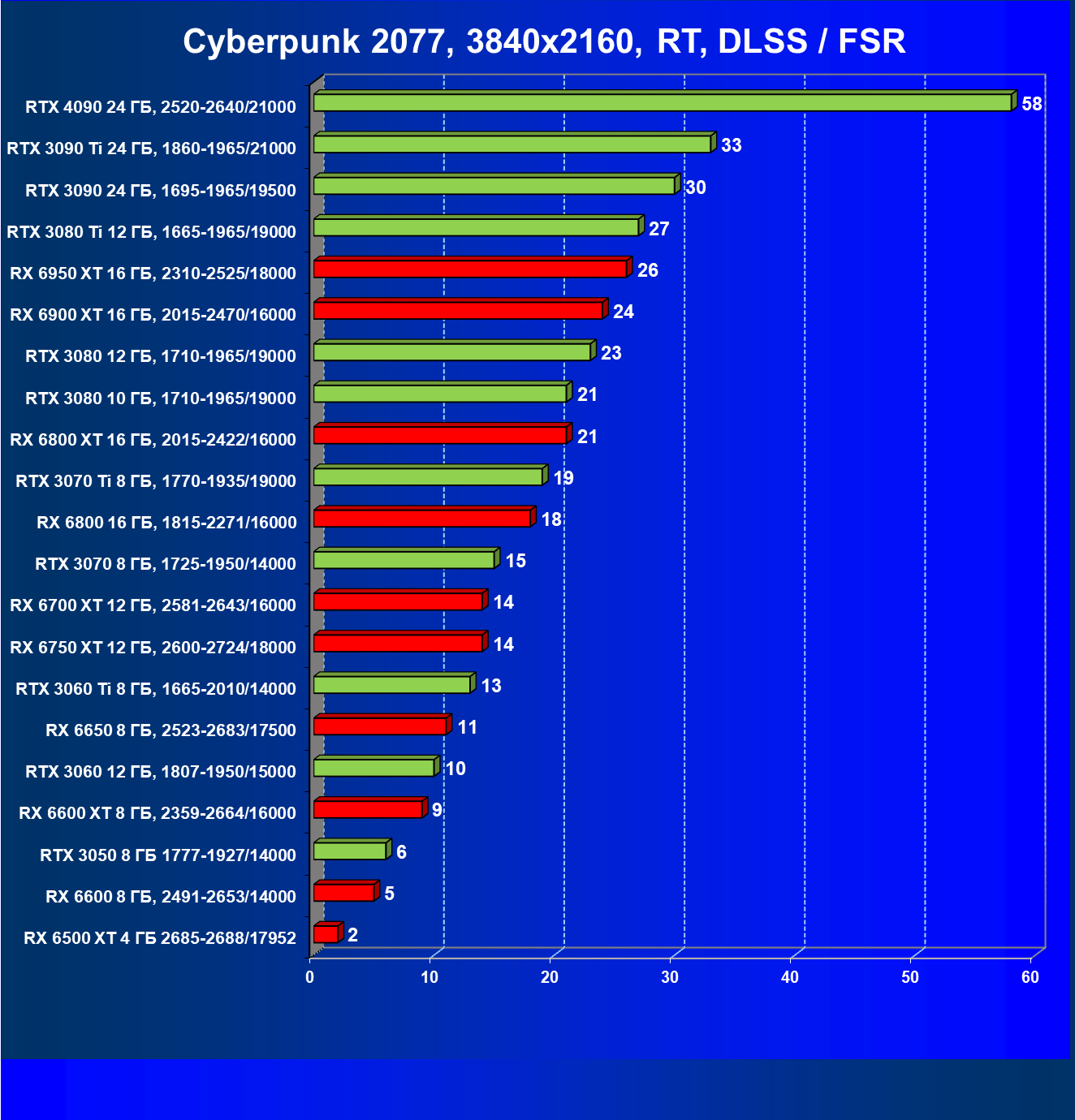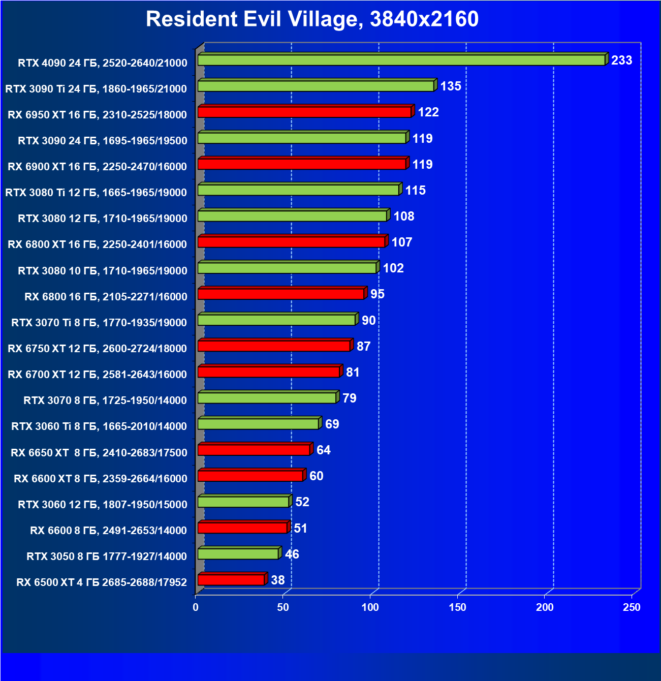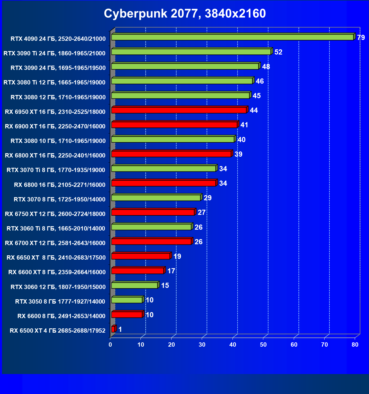 Лучшие ускорители для игры в разрешении 4K при максимальных настройках графики, но без трассировки лучей — GeForce RTX 3090 Ti, GeForce RTX 3090, GeForce RTX 3080 Ti и GeForce RTX 3080, а также Radeon RX 6950 XT, Radeon RX 6900 XT и Radeon RX 6800 XT. Плюс, безусловно, новинка GeForce RTX 4090, которая неплохо осиливает даже разрешение 8K. Менее производительные карты уровня GeForce RTX 3070 Ti, GeForce RTX 3070 и Radeon RX 6800 демонстрируют в разрешении 4K приемлемый FPS не во всех играх даже без включения RT (но при максимальных настройках графики), и желательно будет включать DLSS/FSR.