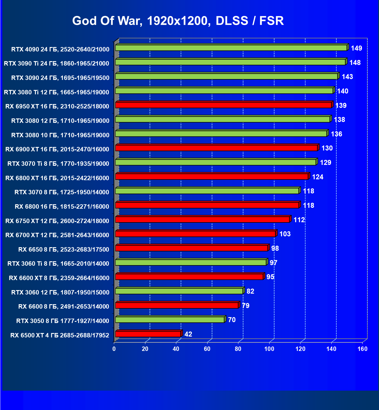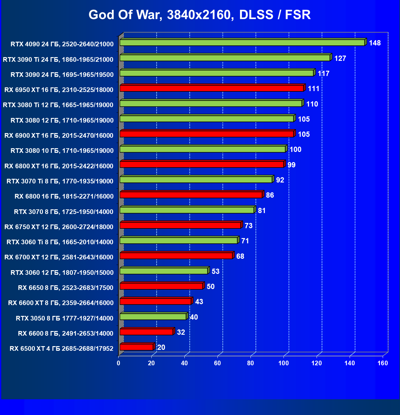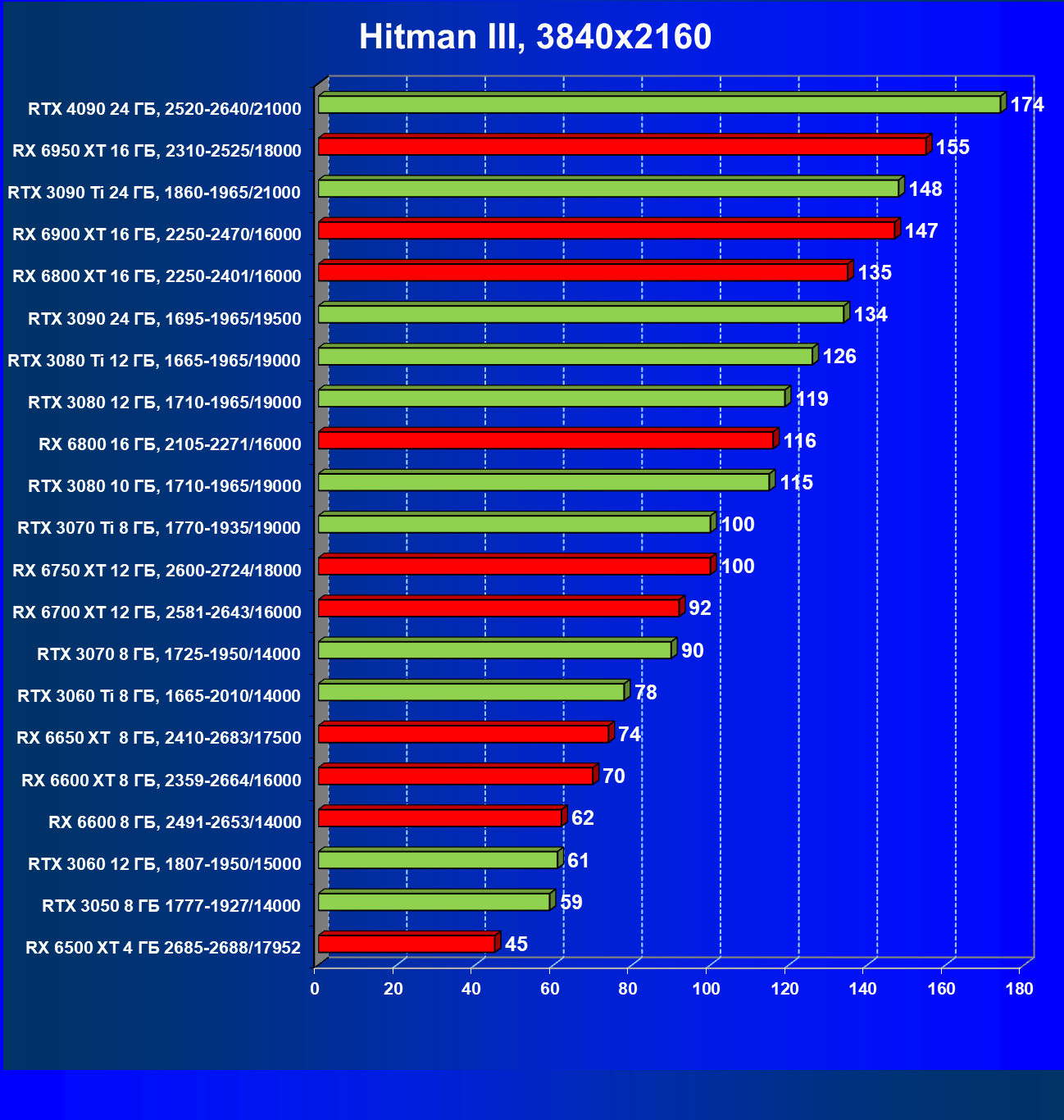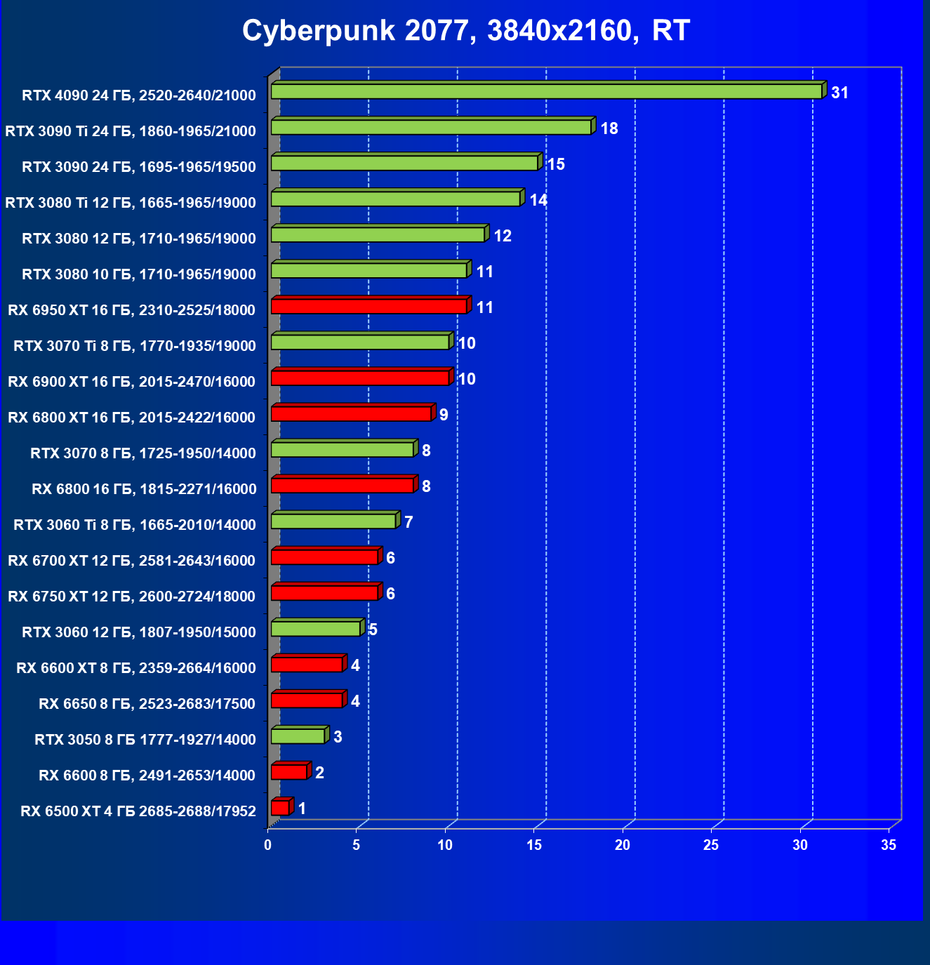 Лучшие ускорители для игры в разрешении 4K при максимальных настройках графики, но без трассировки лучей — GeForce RTX 3090 Ti, GeForce RTX 3090, GeForce RTX 3080 Ti и GeForce RTX 3080, а также Radeon RX 6950 XT, Radeon RX 6900 XT и Radeon RX 6800 XT. Плюс, безусловно, новинка GeForce RTX 4090, которая неплохо осиливает даже разрешение 8K. Менее производительные карты уровня GeForce RTX 3070 Ti, GeForce RTX 3070 и Radeon RX 6800 демонстрируют в разрешении 4K приемлемый FPS не во всех играх даже без включения RT (но при максимальных настройках графики), и желательно будет включать DLSS/FSR.
