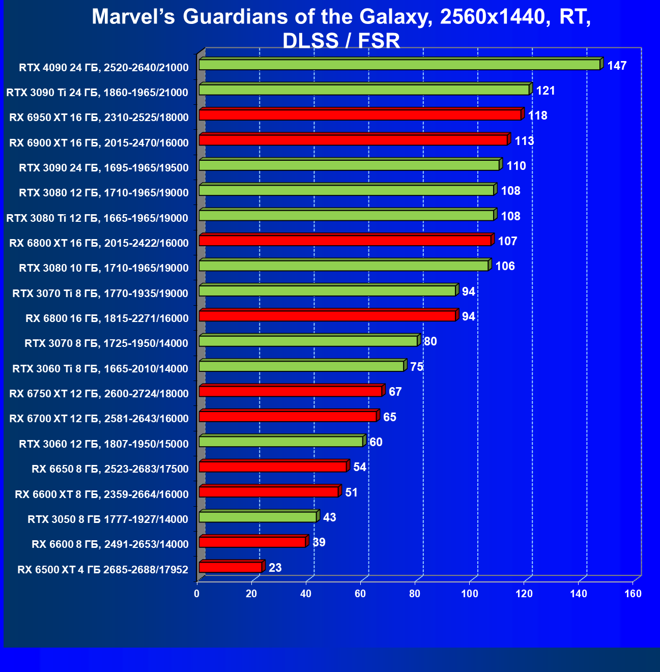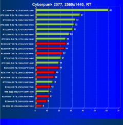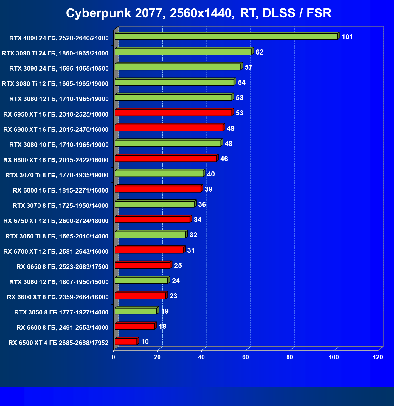 Если без трассировки лучей в этом разрешении вполне можно отменно поиграть на ускорителях уровня GeForce RTX 3070, GeForce RTX 3060 Ti, Radeon RX 6750 XT, Radeon RX 6700 XT и Radeon RX 6650 XT, то при включении RT потребуются уже GeForce RTX 3070 Ti и Radeon RX 6800. Задействование DLSS/FSR совместно с RT позволит поиграть в 2.5К с помощью GeForce RTX 3070, Radeon RX 6750 XT и некоторых близких к ним ускорителей, но далеко не во все игры.