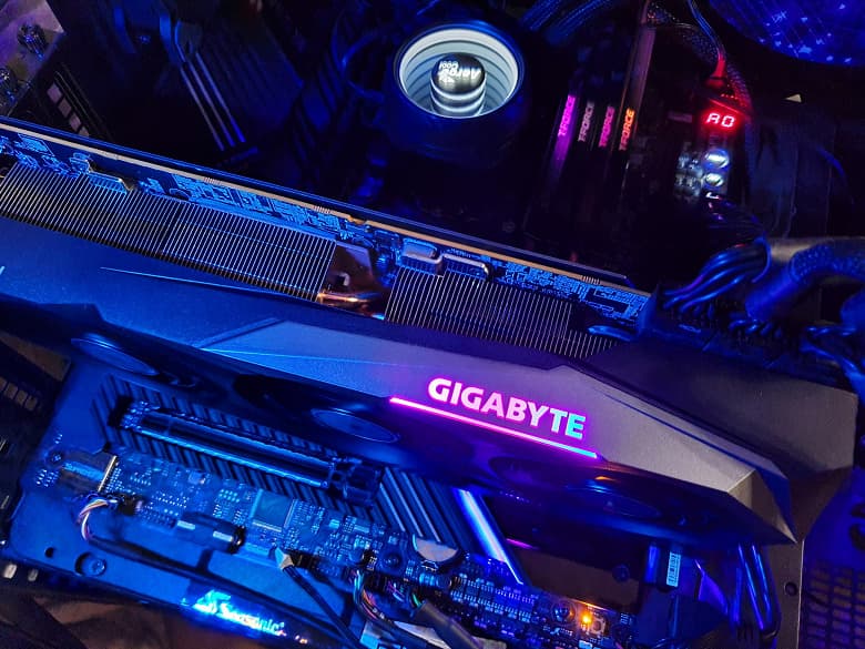 Видеокарта Gigabyte имеет сравнительно небольшие размеры (занимает 2 слота), СО использует два вентилятора ∅90 мм с особым профилем лопастей (с рифлением), и пока GPU не нагреется до 50-55 градусов, они не включаются. Шум под нагрузкой весьма ощутимый: 37,3 дБА. Набор видеовыходов обычный: 1 HDMI 2.1 и 3 DP 1.4a.