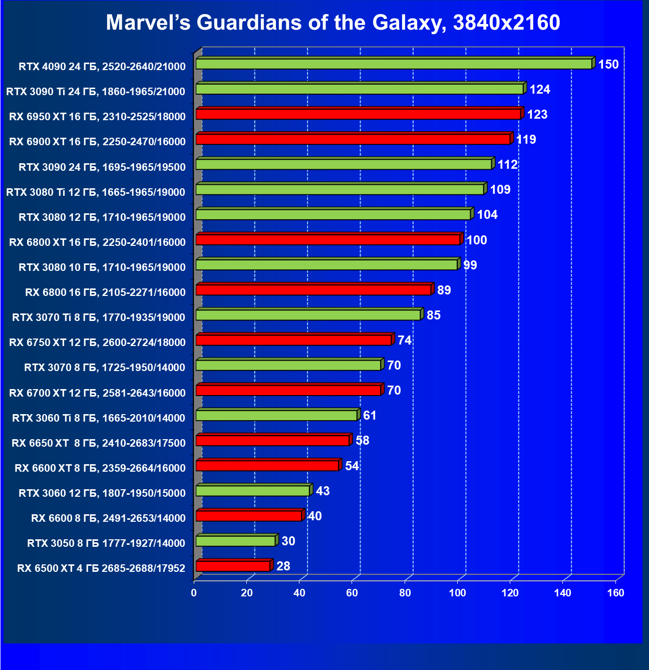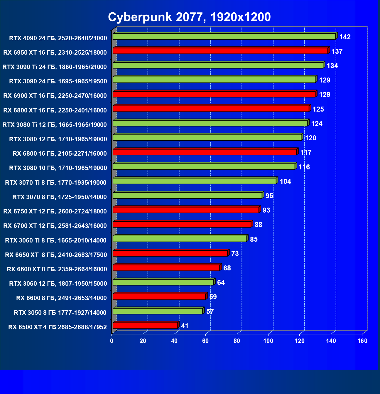 Максимальный комфорт в разрешении 4K при максимальном качестве графики и с использованием трассировки лучей и DLSS/FSR обеспечит не только новинка GeForce RTX 4090, но и очень хорошо справляющиеся с такими условиями модели GeForce RTX 3090 Ti, GeForce RTX RTX 3090, GeForce RTX 3080 Ti, GeForce RTX 3080 12 ГБ.
