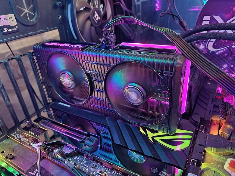 Конкретная карта Palit имеет стандартные для таких ускорителей размеры, занимает 3 слота в системном блоке, система охлаждения умеренно шумная, она использует три одинаковых вентилятора, которые останавливаются в случае низкой нагрузки на GPU. У карты стандартный набор видеовыходов: 1 HDMI 2.1 и 3 DP 1.4a. Бонусом — красивая подсветка, которая управляется утилитой Palit. Есть два скоростных и шумовых режима, традиционно настраиваемых переключением на другой профиль BIOS.