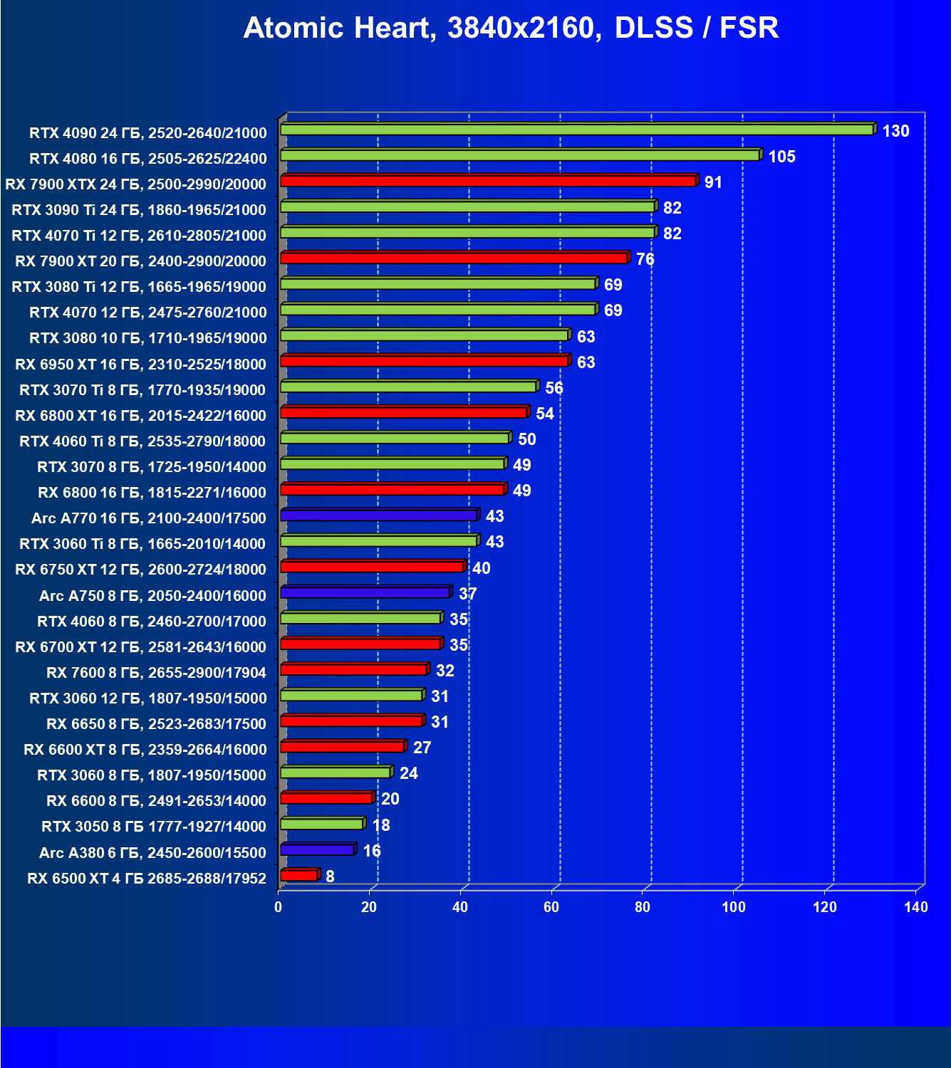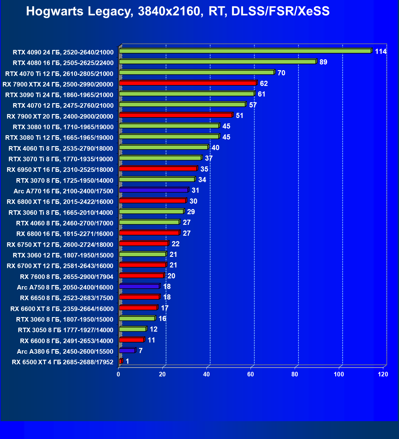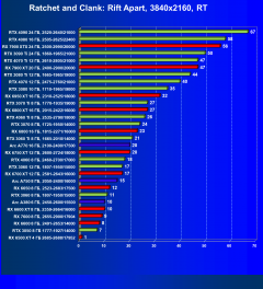 Менее производительные карты уровня GeForce RTX 4060 Ti, GeForce RTX 3070 Ti, GeForce RTX 3070 и Radeon RX 6800 демонстрируют в разрешении 4K приемлемый FPS не во всех играх даже без включения RT (но при максимальных настройках графики), и желательно будет включать DLSS/FSR/XeSS.