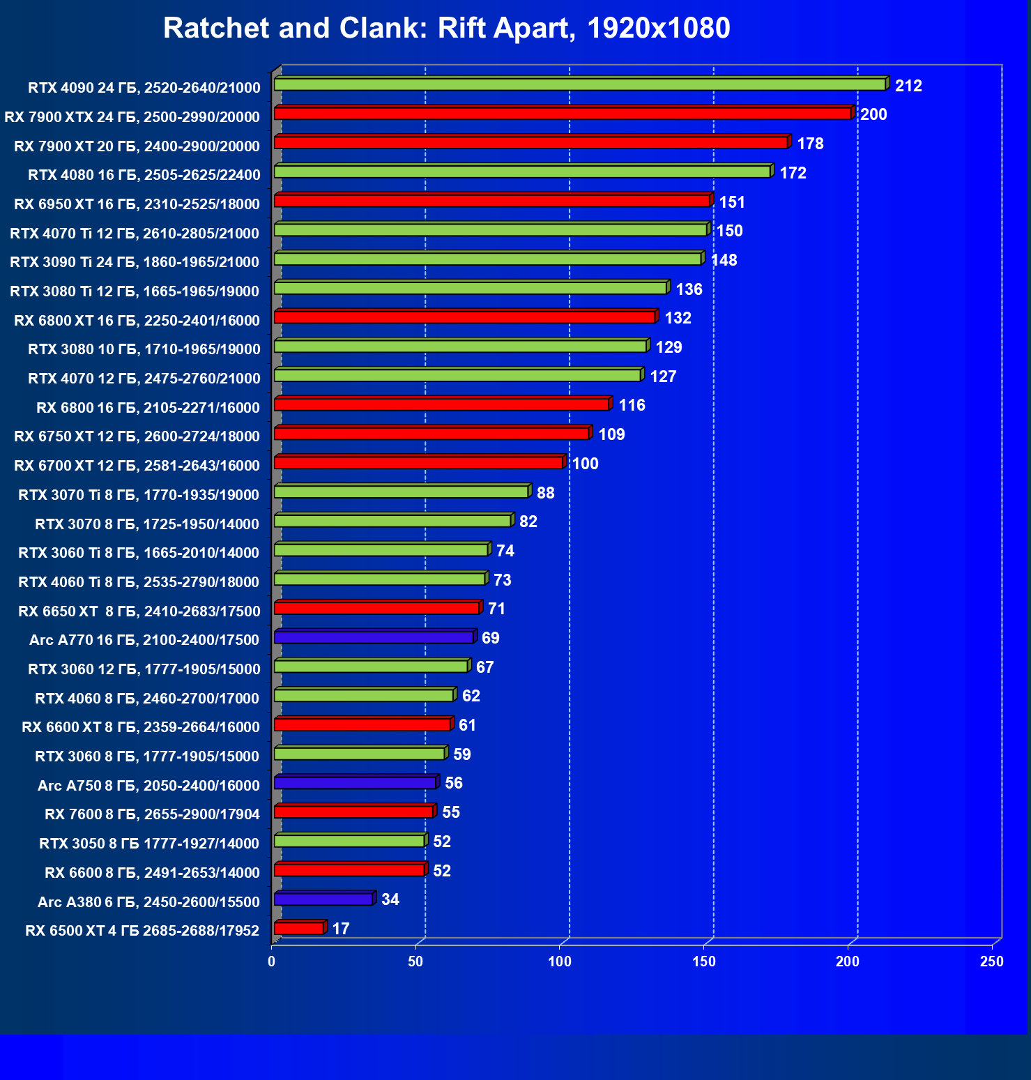 Intel Arc A770 также занимает лидирующие позиции в своей ценовой группе в обоих рейтингах (без RT и с RT+FSR/XeSS). Карты на базе A770 отлично подходит для игры в разрешении Full HD с максимальным качеством графики, но при включении трассировки лучей потребуется использовать FSR/XeSS, а в некоторых играх без RT можно получить приемлемый комфорт и в разрешении 2.5K. Также отметим поддержку стандарта HDMI 2.1, позволяющего выводить 4K-изображение со 120 FPS или 8K-разрешение при помощи одного кабеля, и стандарта DP 2.0, поддержку аппаратного декодирования и кодирования видеоданных в формате AV1. Эти видеокарты Intel очень сильно зависят от поддержки Resizable BAR (у AMD она носит маркетинговое наименование Smart Access Memory) — возможности PCI Express, позволяющей процессору получать доступ ко всей видеопамяти, а не только к ее маленькому кусочку. Технология поддерживается только относительно современными процессорами и системными платами (начиная с Intel Core 10-го поколения и AMD Ryzen 3000), потребуется обновление BIOS для старых системных плат.