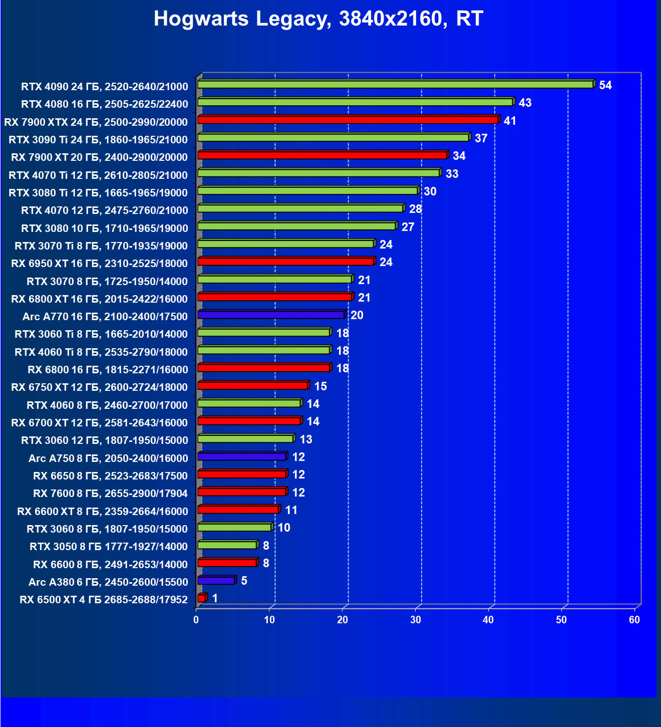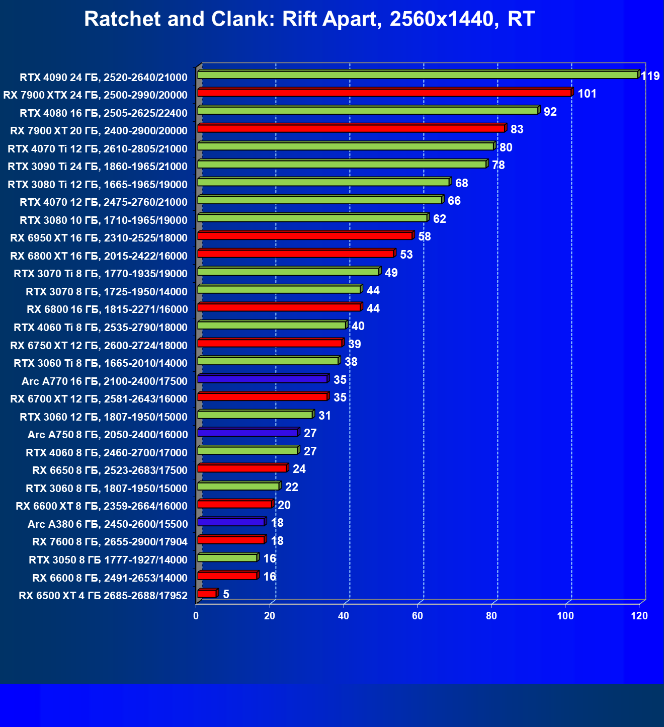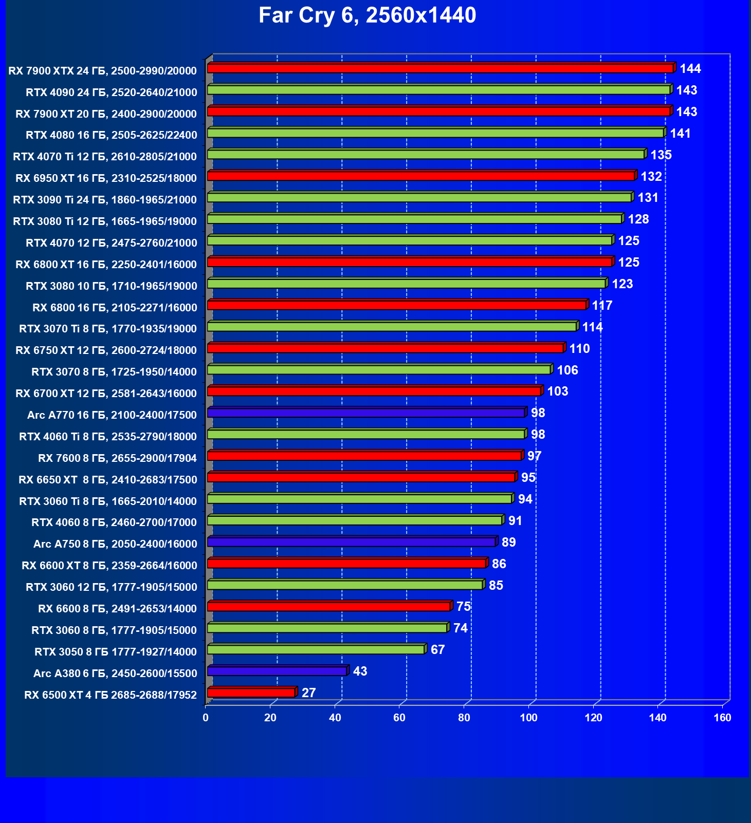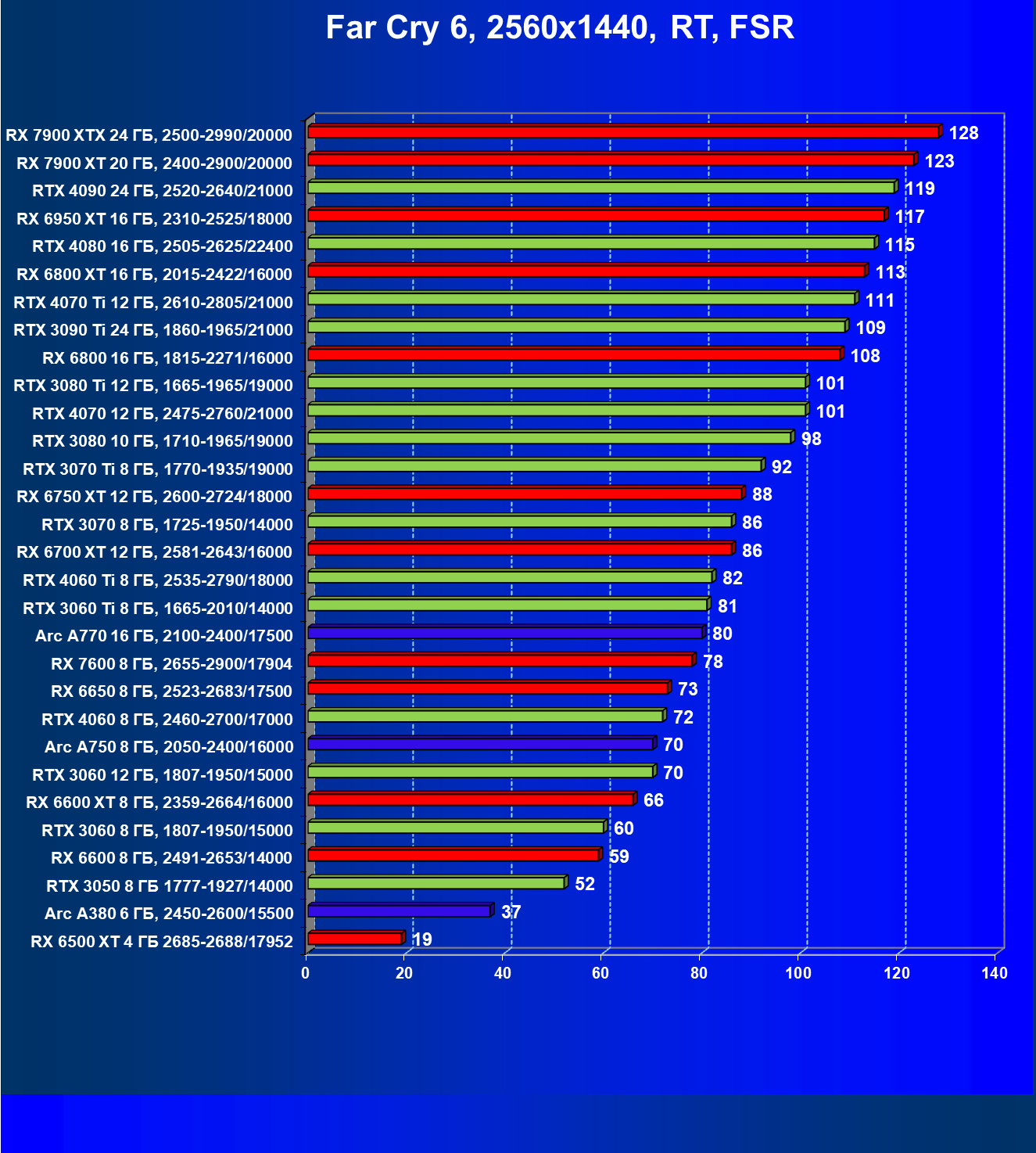 Все упомянутые видеокарты подойдут и для игр на мониторах с более массовым разрешением Full HD. При включении трассировки лучей совместно с DLSS, FSR или XeSS полный комфорт обеспечивают карты уровня Radeon RX 6700 XT, GeForce RTX 4060 и GeForce RTX 3060, а также Intel Arc A770 или Radeon RX 7600. А вот Radeon RX 6500 XT включение RT просто не потянет.