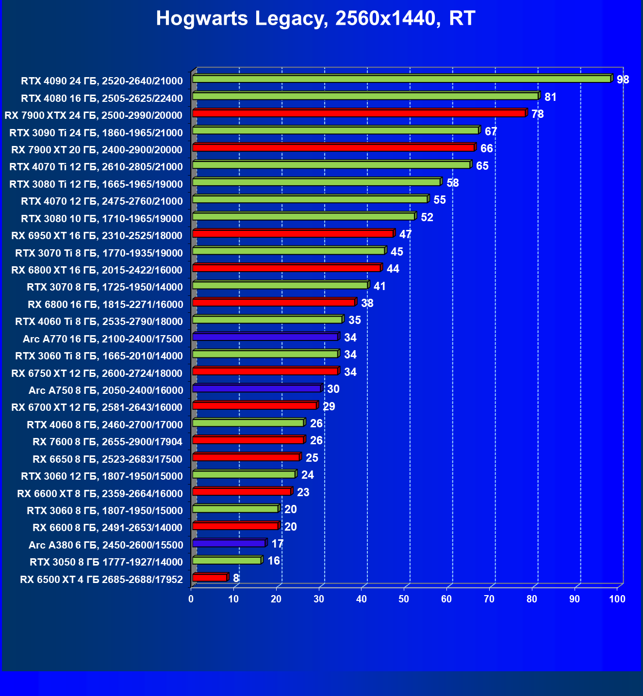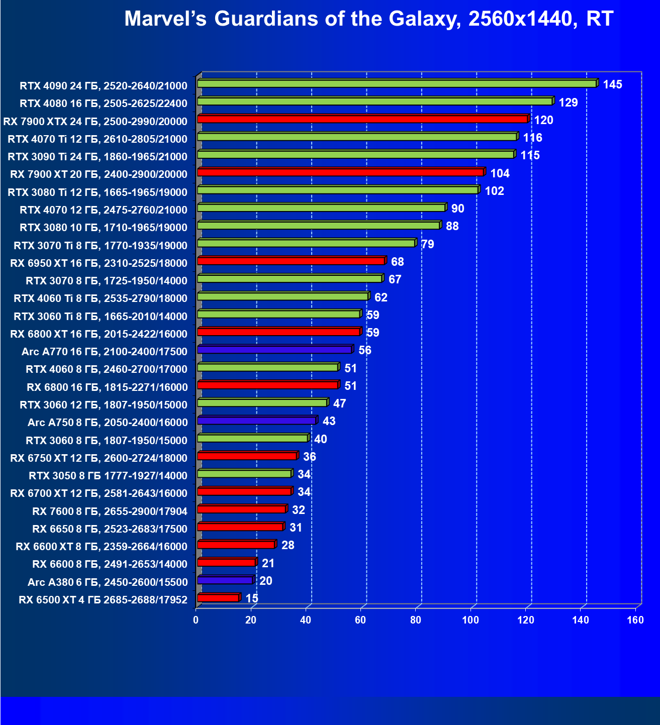 Перечисленные выше видеокарты логично справятся с более низким разрешением даже при включении трассировки лучей и уже не потребуют включения DLSS/FSR/XeSS. Для игр без RT, но с максимальным качеством графики в современных играх в таком разрешении хорошо подойдут GeForce RTX 3070, GeForce RTX 4060 Ti, GeForce RTX 3060 Ti, GeForce RTX 4060, Radeon RX 6750 XT, Radeon RX 6700 XT, Radeon RX 6650 XT, Radeon RX 7600 и Intel Arc A770.