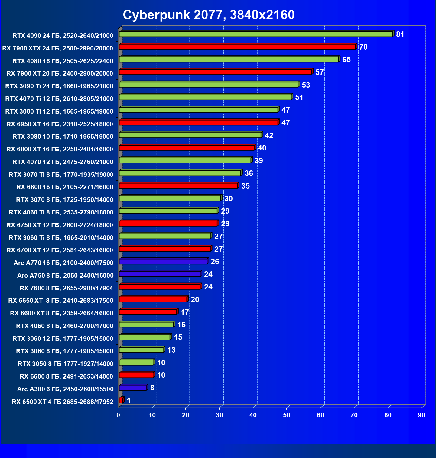 Максимальный комфорт в разрешении 4K при максимальном качестве графики с использованием трассировки лучей и DLSS/FSR/XeSS обеспечат GeForce RTX 4090, GeForce RTX 4080, GeForce RTX 4070 Ti и GeForce RTX 4070, Radeon RX 7900 XT и Radeon RX 7900 XTX. Также в таких условиях хорошо себя покажут модели предыдущего поколения GeForce RTX 3090 Ti и GeForce RTX 3080 Ti.