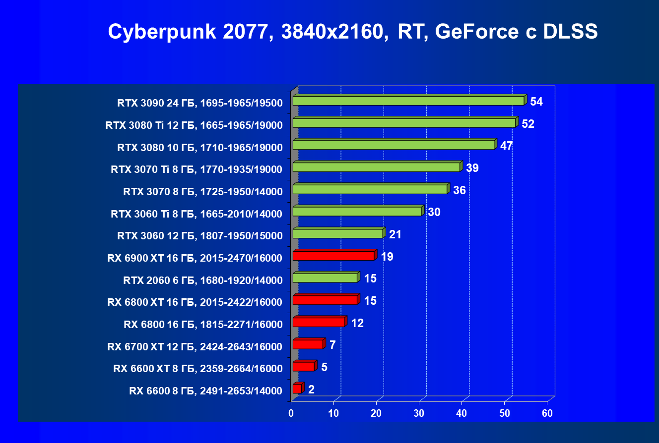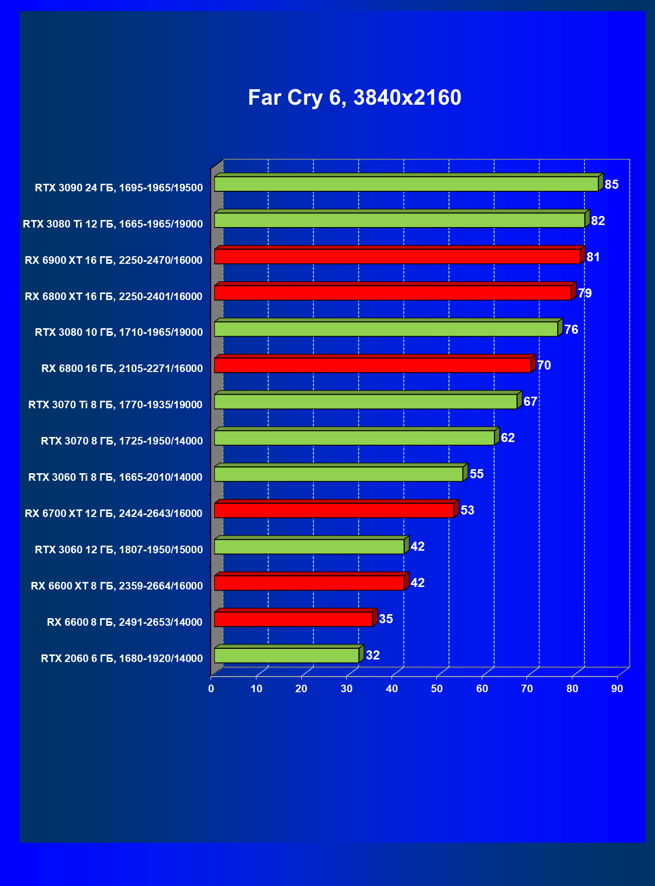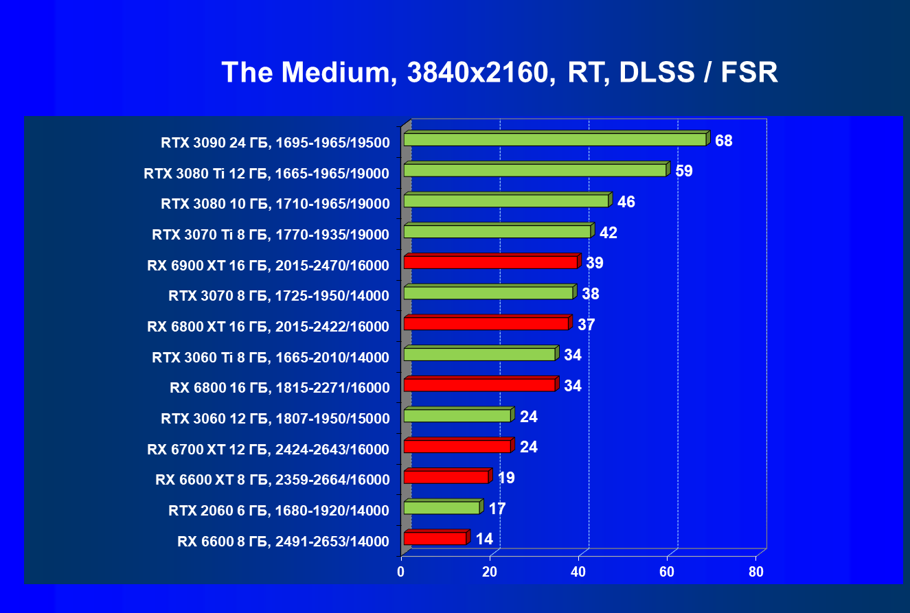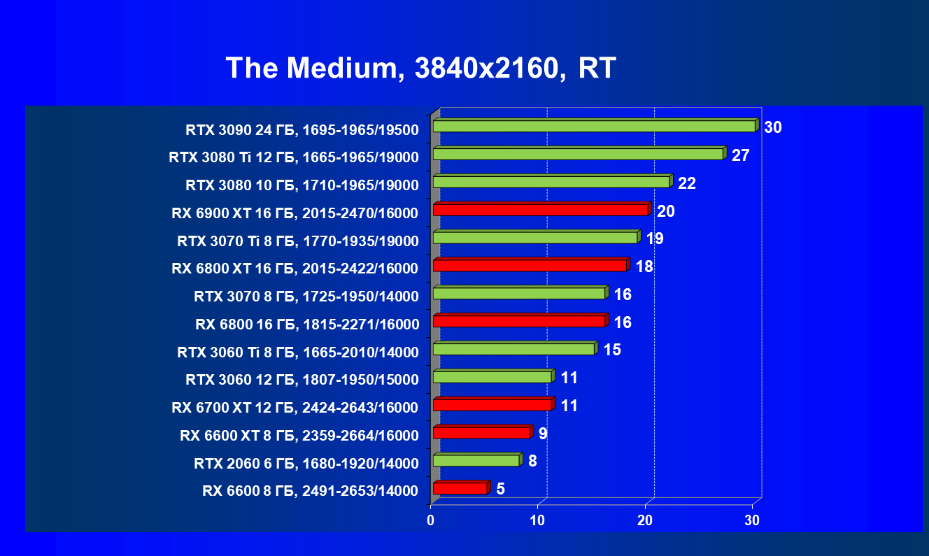 Лучшие ускорители для разрешения 4К (при максимальном качестве графики) — GeForce RTX 3090, GeForce RTX 3080 Ti, GeForce RTX 3080, Radeon RX 6900 XT, Radeon RX 6800 XT. Они обеспечивают высокий уровень комфорта во всех играх без использования трассировки лучей. При включении RT будет достаточно сильное падение скорости у видеокарт Radeon RX 6000-й серии, однако если игра позволяет включить FSR, это отчасти компенсирует снижение производительности, хотя все равно во многих играх на видеокартах AMD при этом будет комфортно играть только в разрешении 2.5К. В принципе, для 4К еще вполне подойдут GeForce RTX 3070 Ti, GeForce RTX 3070 и Radeon RX 6800, причем видеокарты Nvidia будут справляться в этом разрешении не со всеми играми (но у них будет меньше падение при включении RT), а Radeon RX 6800 будет производительнее них без RT (но хуже при задействовании этой технологии).