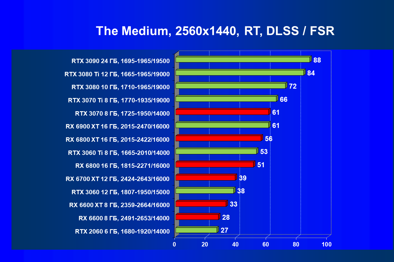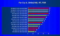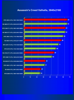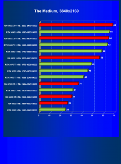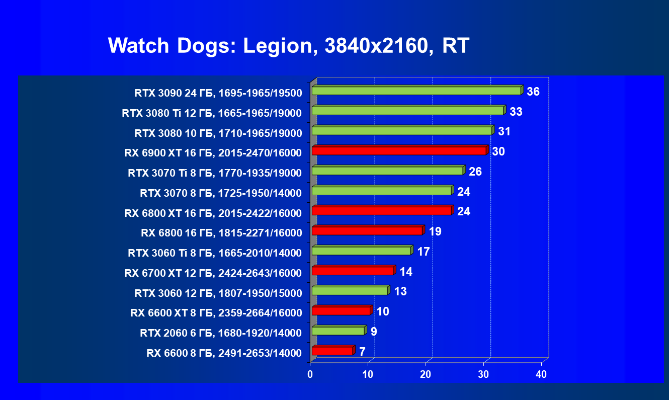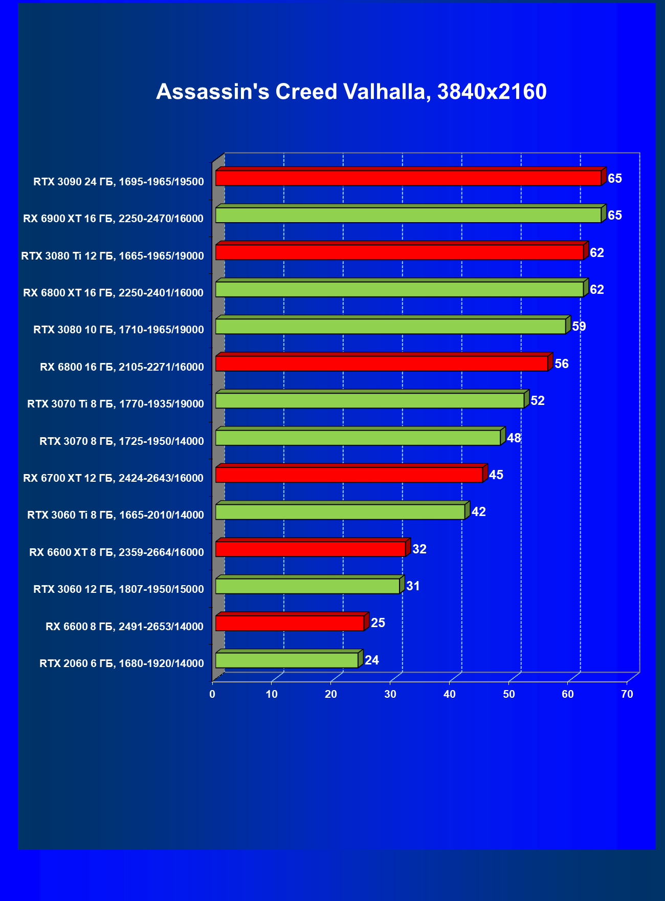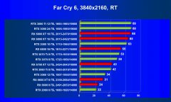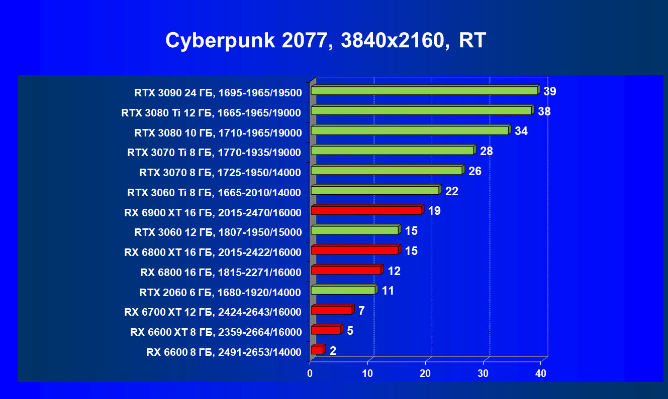 Лучшие ускорители для разрешения 4К (при максимальном качестве графики) — GeForce RTX 3090, GeForce RTX 3080 Ti, GeForce RTX 3080, Radeon RX 6900 XT, Radeon RX 6800 XT. Они обеспечивают высокий уровень комфорта во всех играх без использования трассировки лучей. При включении RT будет достаточно сильное падение скорости у видеокарт Radeon RX 6000-й серии, однако если игра позволяет включить FSR, это отчасти компенсирует снижение производительности, хотя все равно во многих играх на видеокартах AMD при этом будет комфортно играть только в разрешении 2.5К. В принципе, для 4К еще вполне подойдут GeForce RTX 3070 Ti, GeForce RTX 3070 и Radeon RX 6800, причем видеокарты Nvidia будут справляться в этом разрешении не со всеми играми (но у них будет меньше падение при включении RT), а Radeon RX 6800 будет производительнее них без RT (но хуже при задействовании этой технологии).
