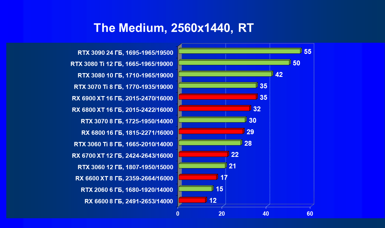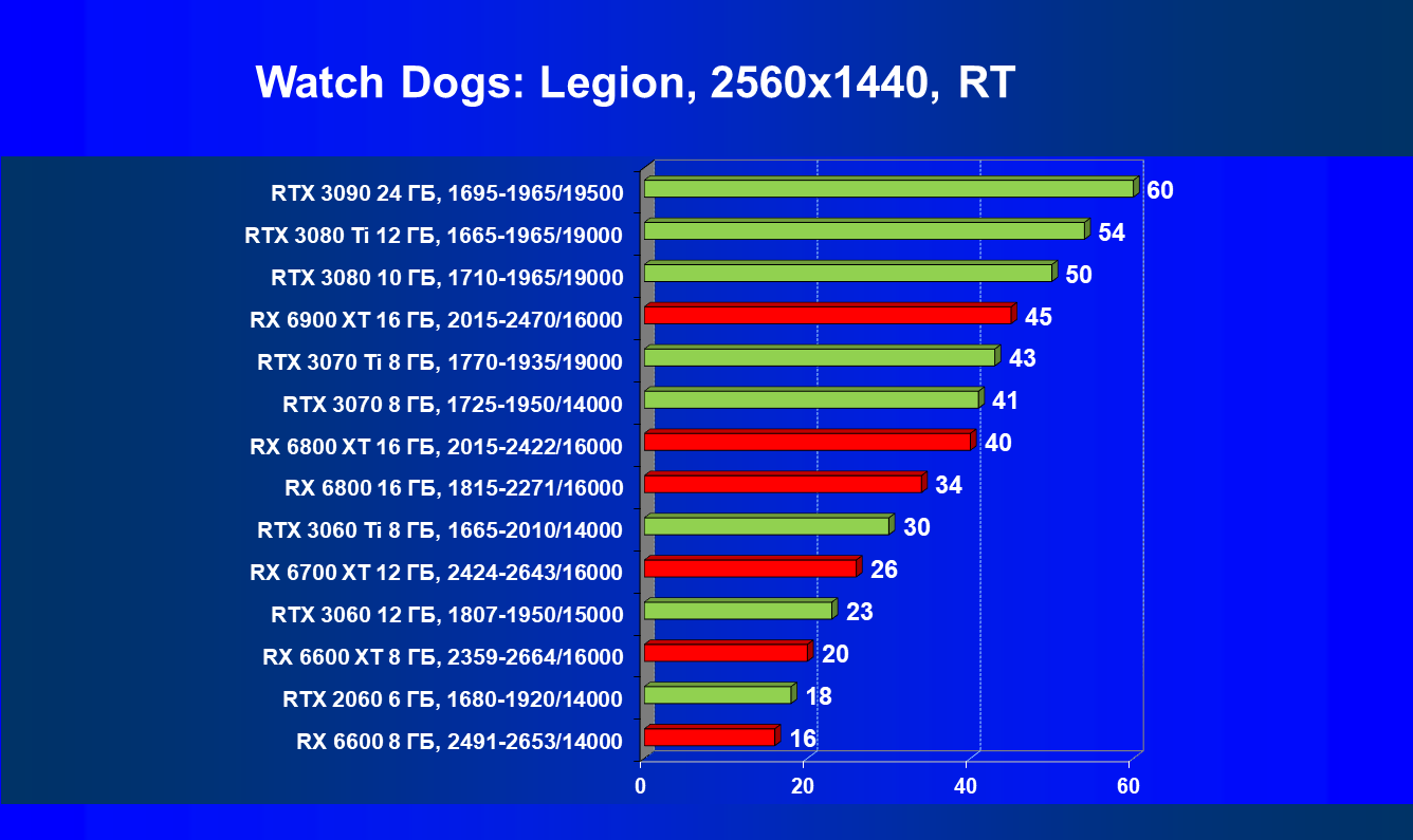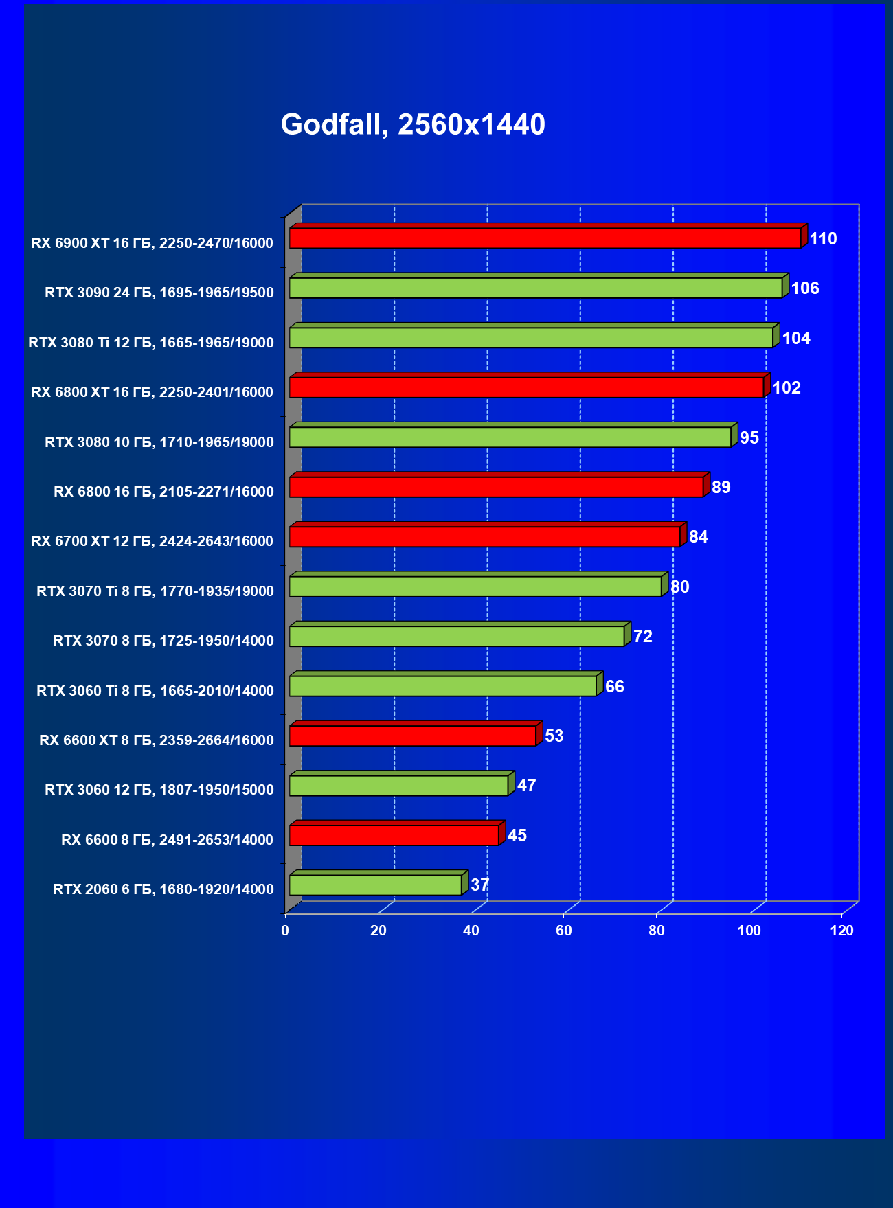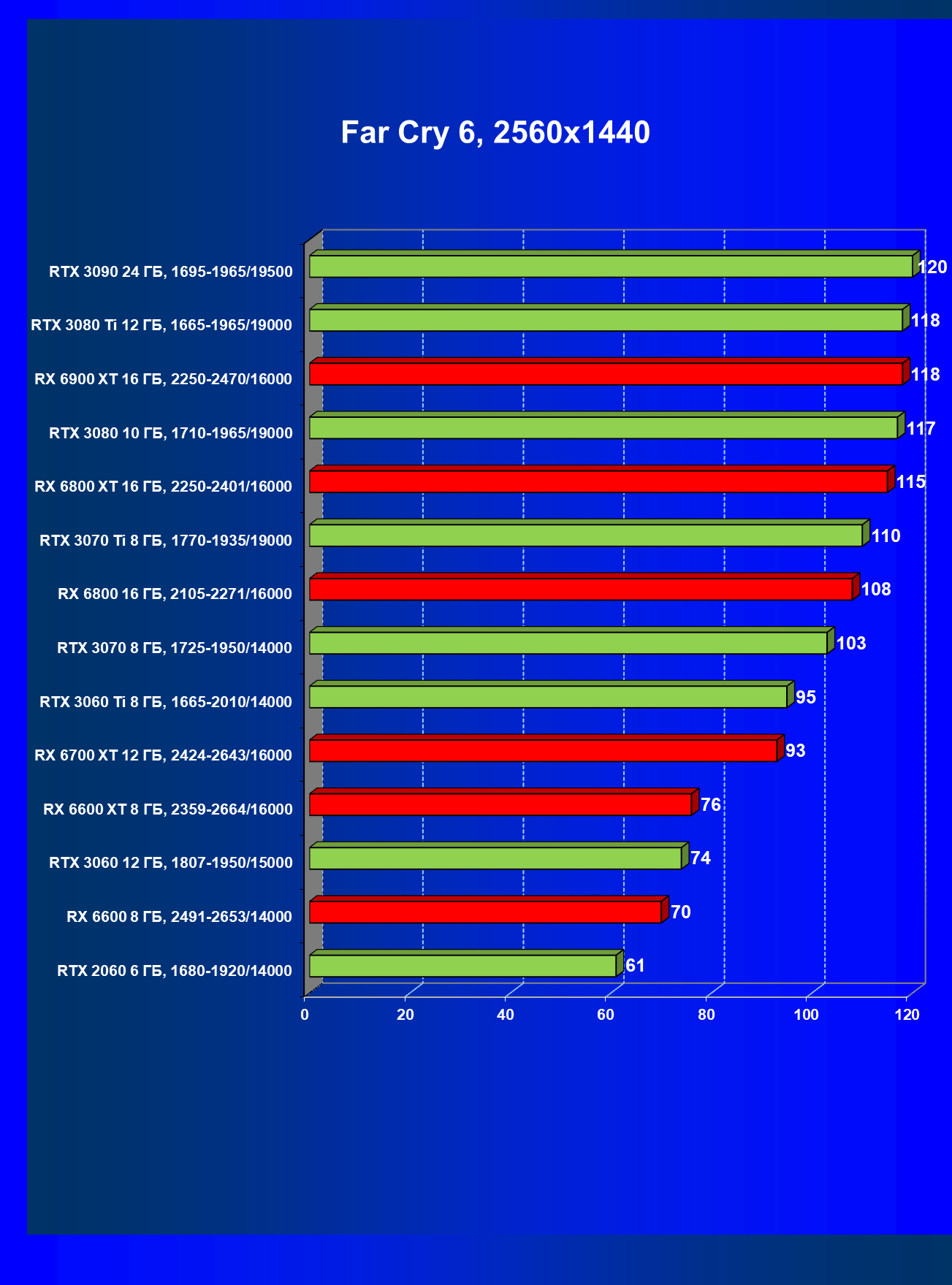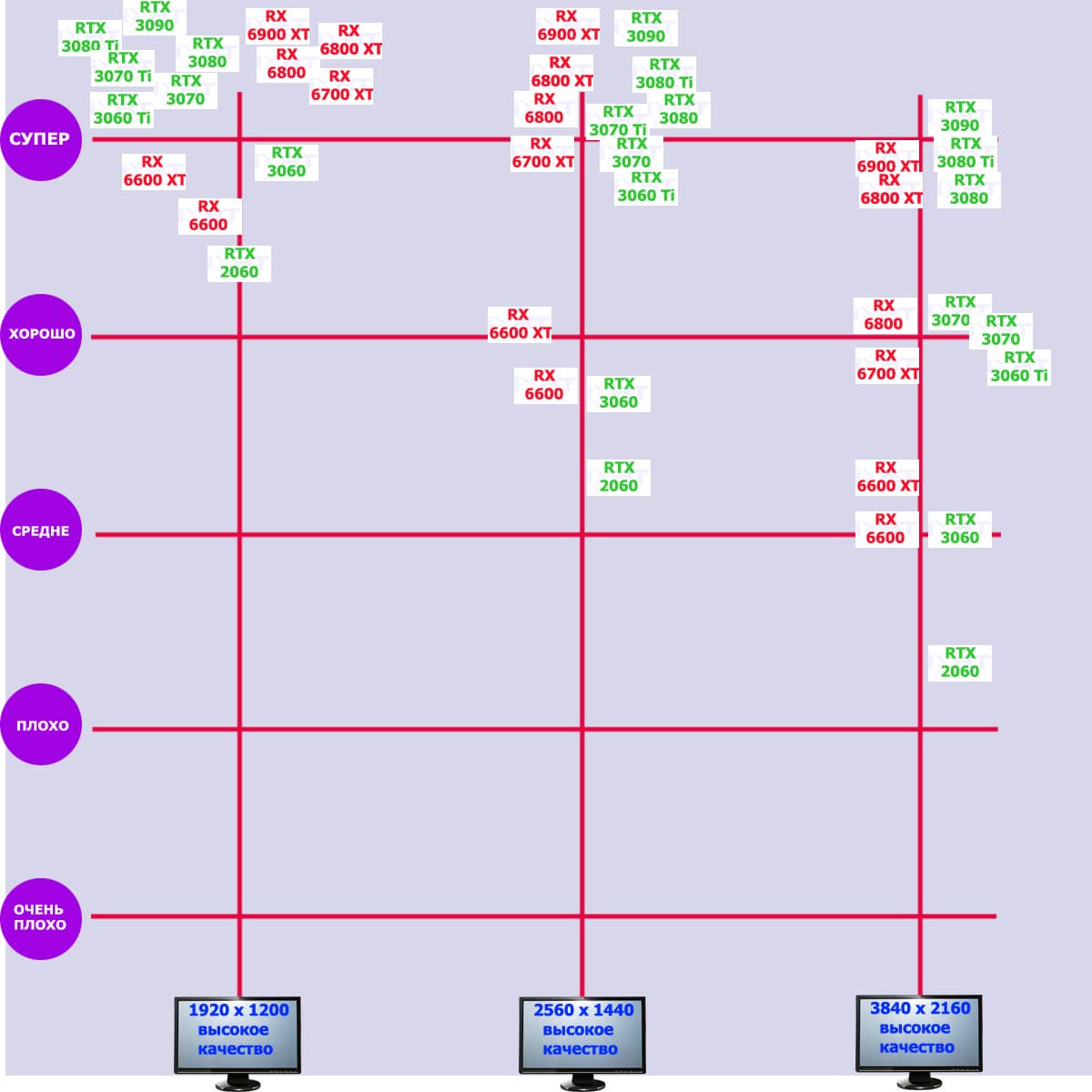Кроме всех вышеперечисленных ускорителей для разрешения 2.5К при максимальном качестве картинки в классических играх с растеризацией подойдут прежде всего GeForce RTX 3060 Ti и Radeon RX 6700 XT (в ряде игр они могут замахнуться и на 4К), а если говорить об играх с RT, то в этом разрешении хорошо проявят себя Radeon RX 6900 XT и Radeon RX 6800 XT. Radeon RX 6600 XT весьма неплох для этого разрешения, но только без RT и не во всех играх (а уж 4К явно не для него). Видеокарты GeForce RTX 3060, GeForce RTX 2060 и Radeon RX 6600 в принципе потянут 2.5К, но не во всех играх и/или не на максимальных настройках графики.