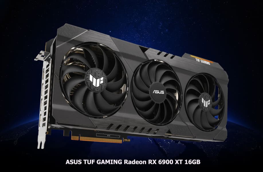 Asus TUF Gaming Radeon RX 6900 XT 16 ГБ — прямой конкурент GeForce RTX 3080 Ti, а во многих играх эта видеокарта способна догнать и GeForce RTX 3090. В целом она позволит играть в новинки при максимальных настройках графики в 4К без трассировки лучей или при использовании RT совместно с FSR. Видеокарта с трехслотовым охлаждением практически бесшумная и относительно холодная для флагмана, у нее 3 видеовыхода DisplayPort 1.4a и 1 HDMI 2.1. Для работы рекомендуется блок питания мощностью от 850 Вт. Да, для игр с трассировкой лучей тот же ускоритель GeForce RTX 3080 Ti смотрится привлекательнее, да и поддержка Nvidia DLSS в играх встречается заметно чаще, чем поддержка AMD FSR, но стоимость видеокарт на GPU Nvidia сегодня зашкаливает, а самих игр с трассировкой лучей пока не настолько много, чтобы это стало решающим фактором, по крайней мере для большинства потенциальных покупателей.