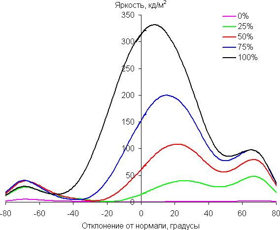Отметим плавное уменьшение яркости при отклонении от перпендикуляра к экрану в горизонтальном направлении, при этом графики не пересекаются во всем диапазоне измеряемых углов. При отклонении вниз темные оттенки инвертируются, при отклонении вверх инвертируются светлые. Контрастность в диапазоне углов ±82° опускается ниже отметки 10:1 при отклонении вниз по диагонали более чем на 58°. Углы обзора, как это и ожидаемо для матрицы TN, плохие, но все же не самые плохие для данного типа матриц.