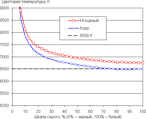 Самый близкий к черному диапазон можно не учитывать, так как в нем цветопередача не так важна, а погрешность измерения цветовых характеристик высокая. Ручная коррекция еще больше приблизила точку белого к стандартным 6500 К, а значение ΔE в среднем уменьшилось. Учитывая игровую направленность монитора, в ручной коррекции цветового баланса необходимости нет.